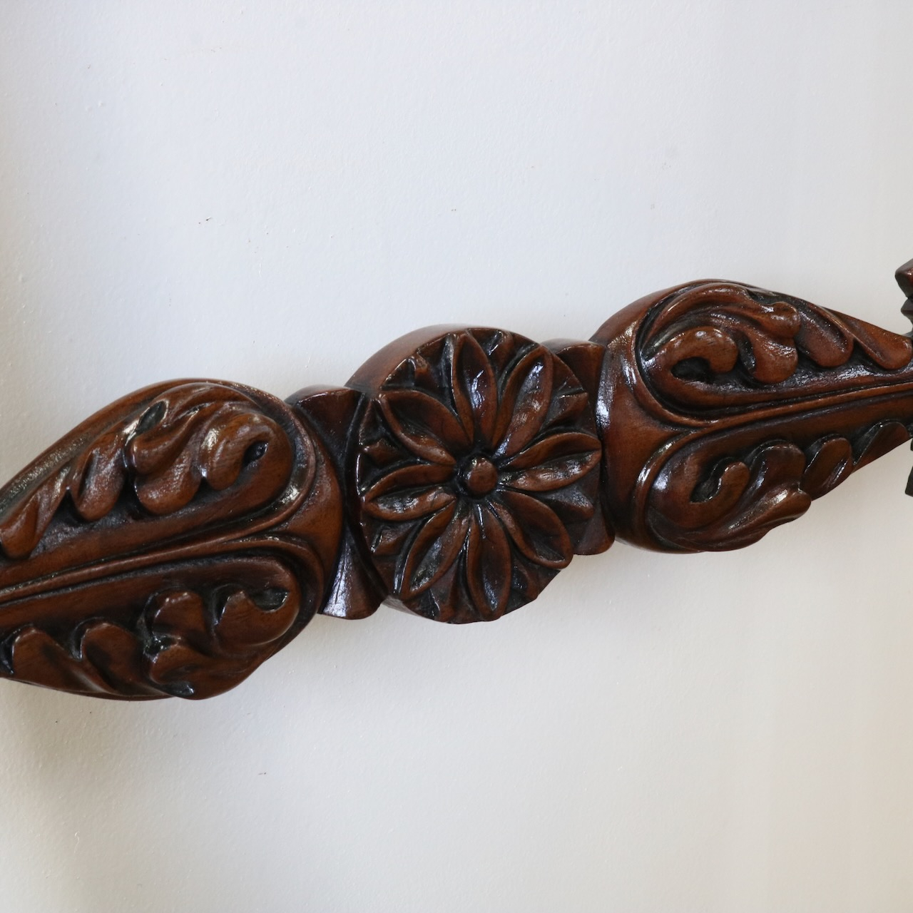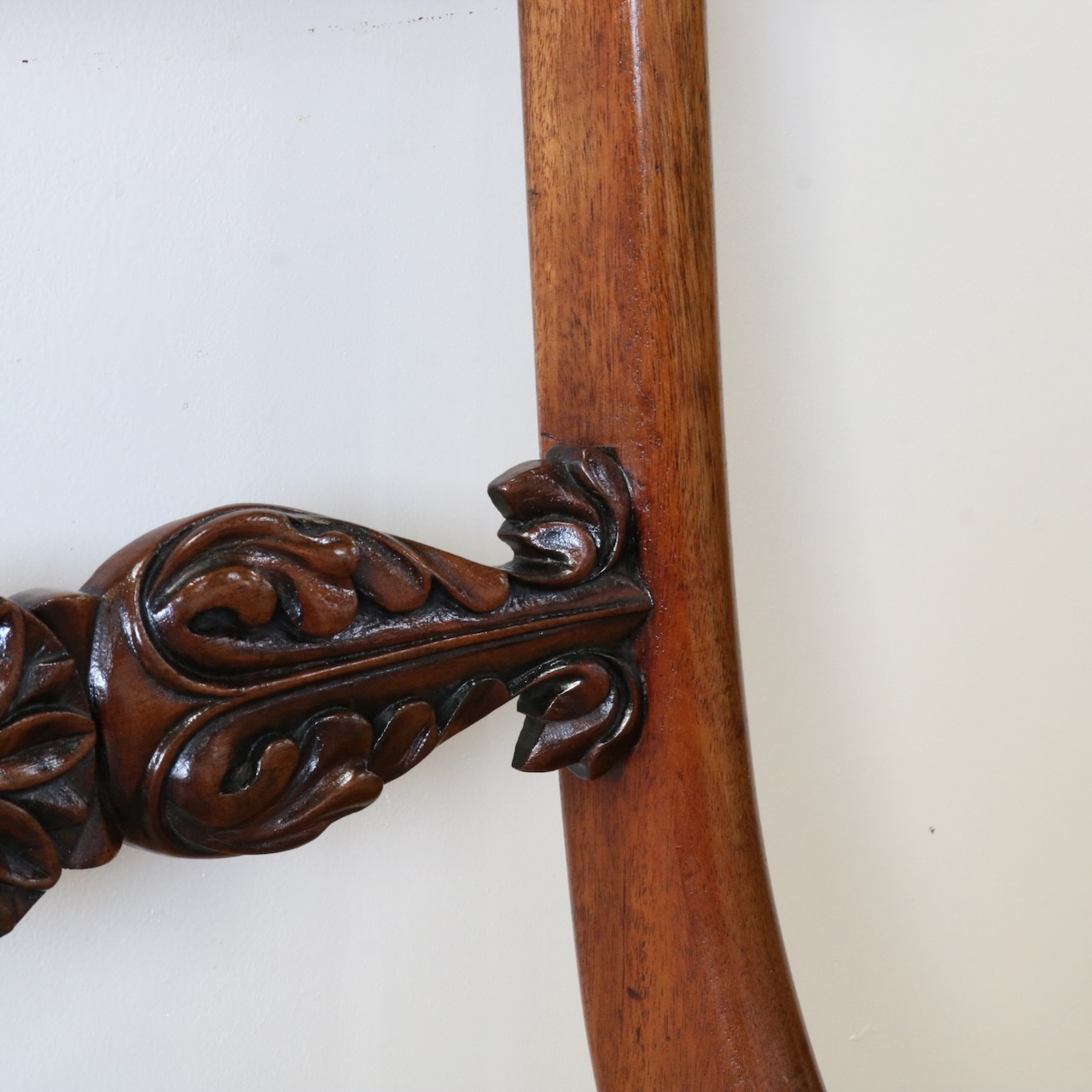背もたれには優雅な曲線と、精緻な彫刻が施されており、この時代の家具によく見られるアカンサスのモチーフが見て取れます。
