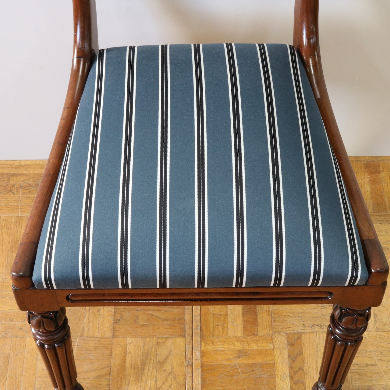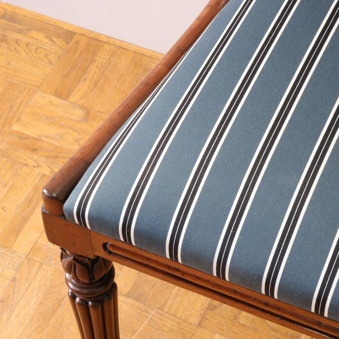 座面は深みのあるブルーにストライプ柄があしらわれたファブリックに張り替えました。