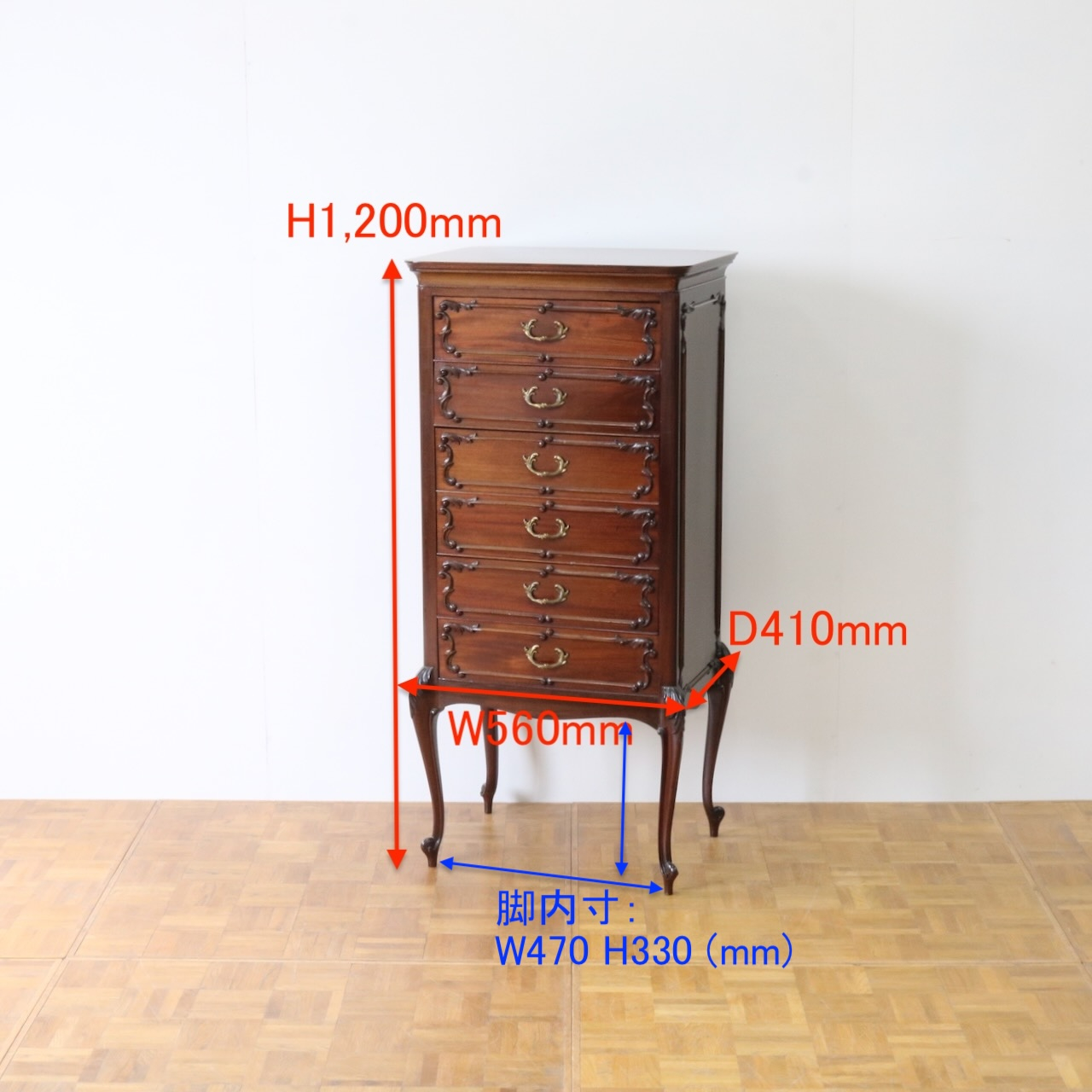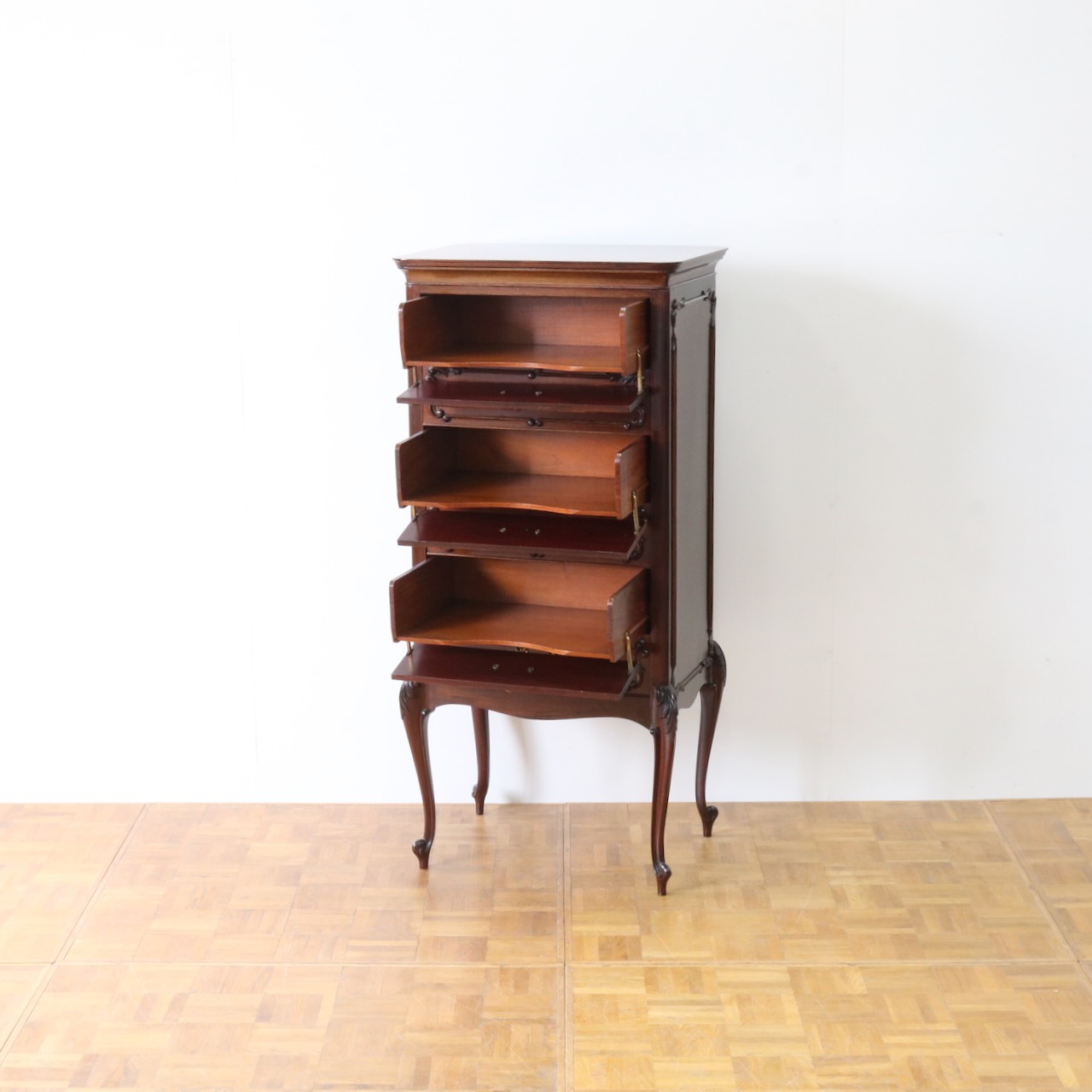 楽譜や書類が取り出しやすいよう、引き出し前面が前に倒れる仕様になっています。アンティーク家具ならではのデザインです。