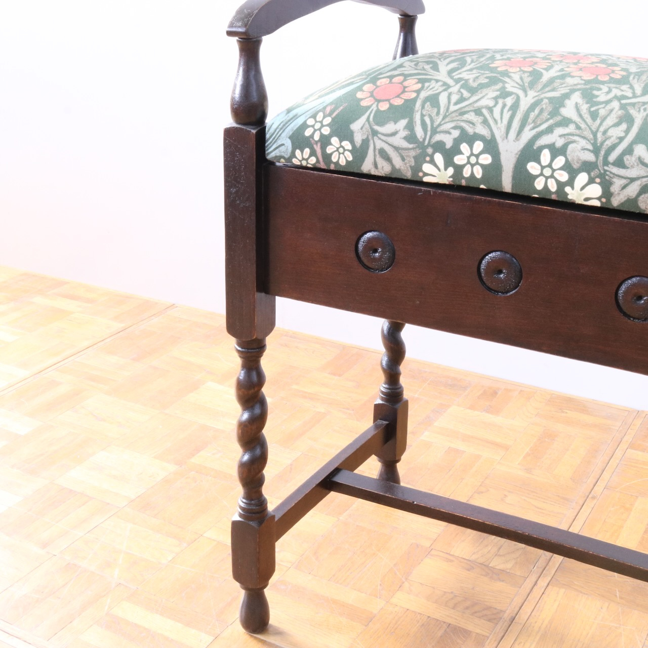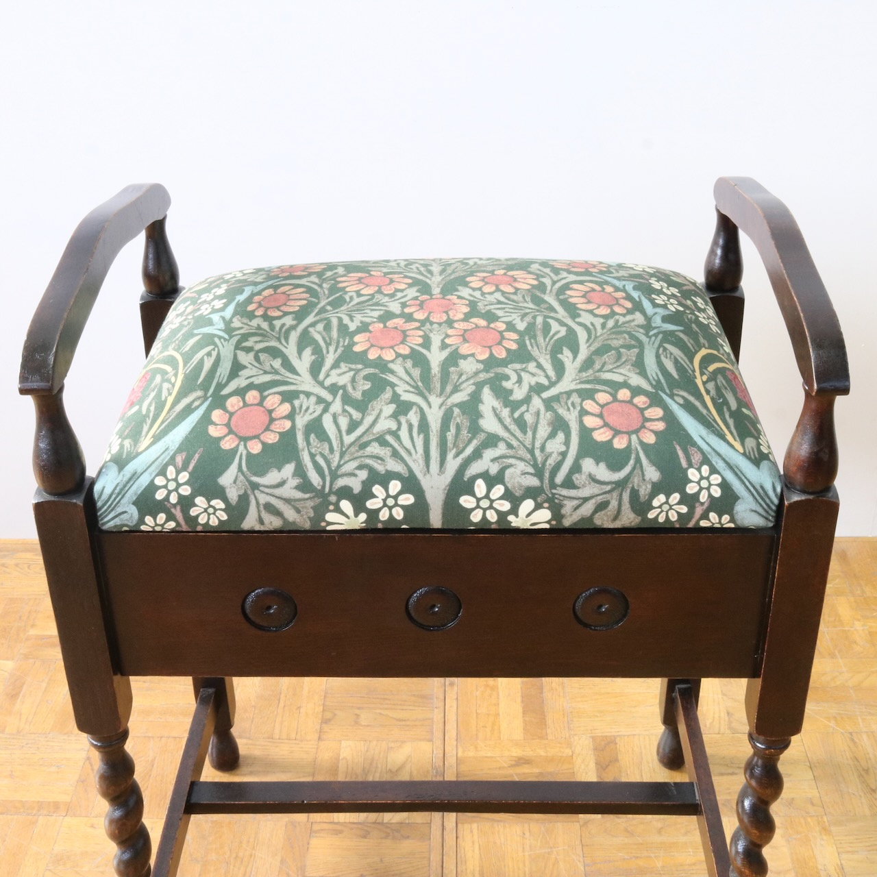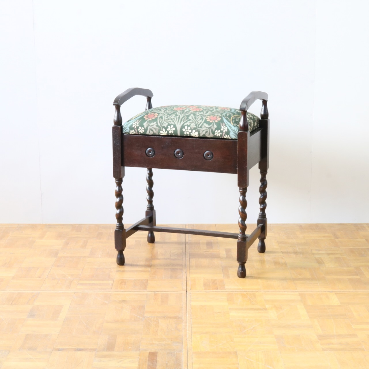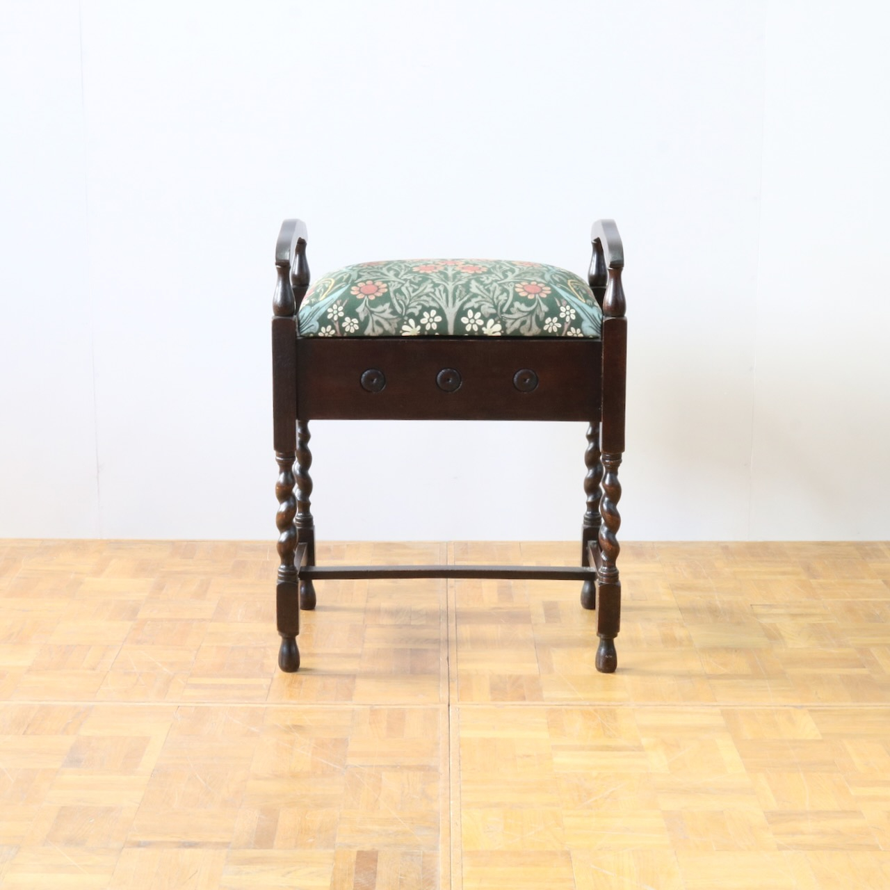 配送料の目安 ▶︎1930年代、オーク材のスツール。ツイストレッグにフロントの円形の装飾が可愛らしいアクセント。座面下が収納になっている実用性の高い仕様も嬉しいポイントです。ウィリアム・モリスの人気のパターン「ブラックトーン」で張り替えました。