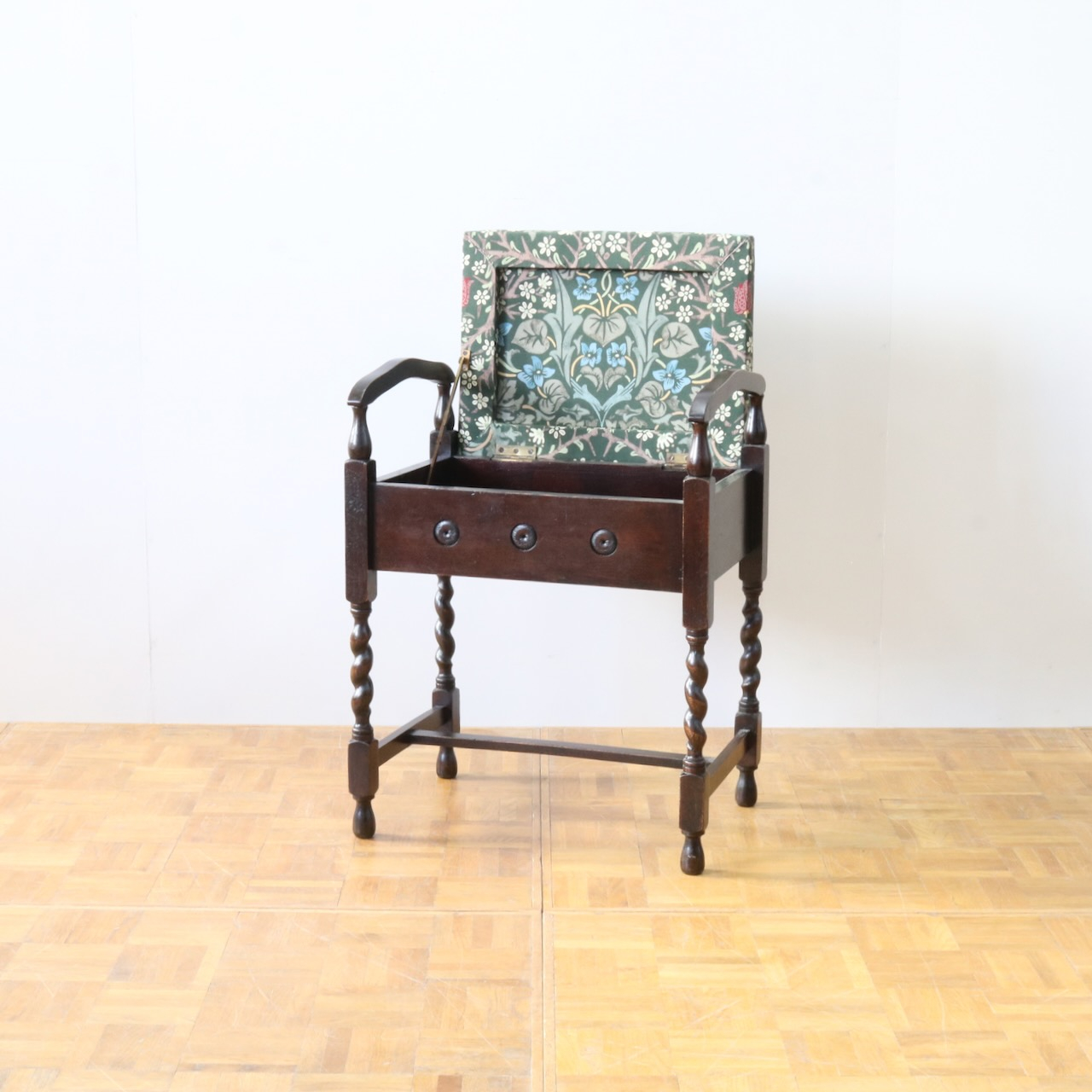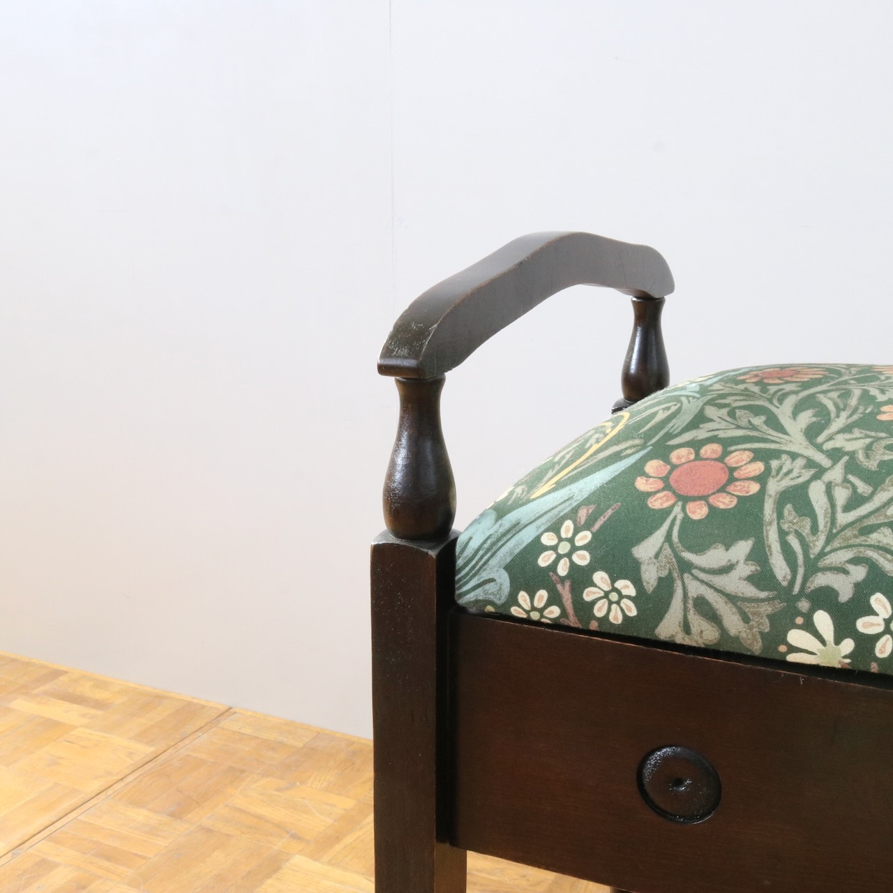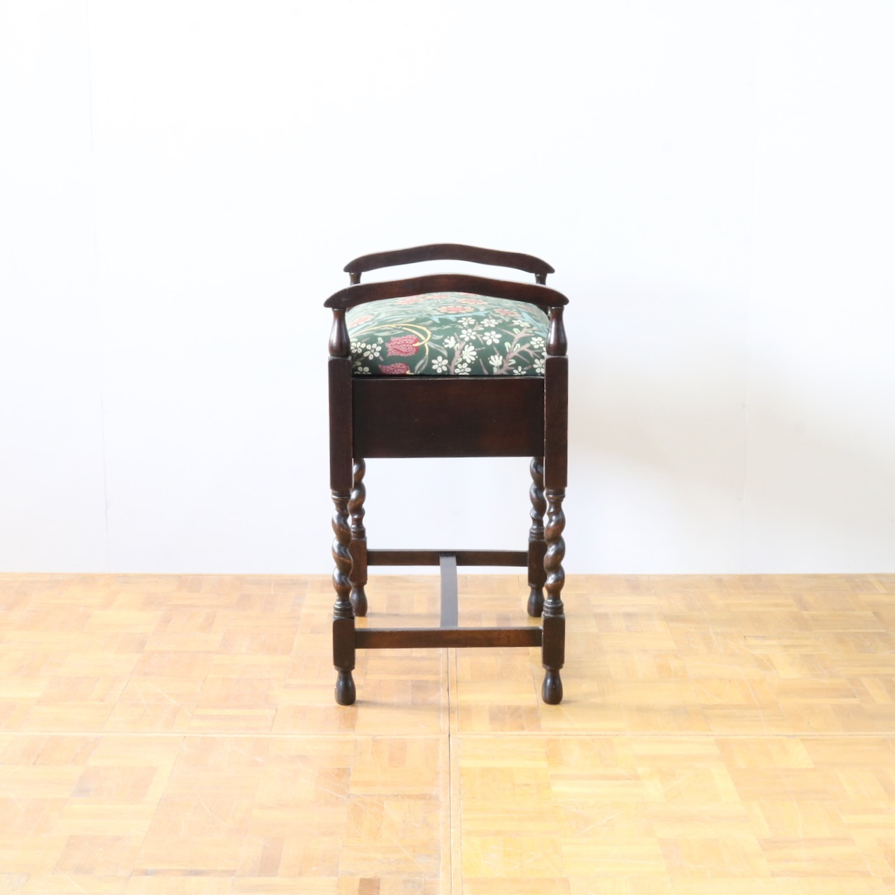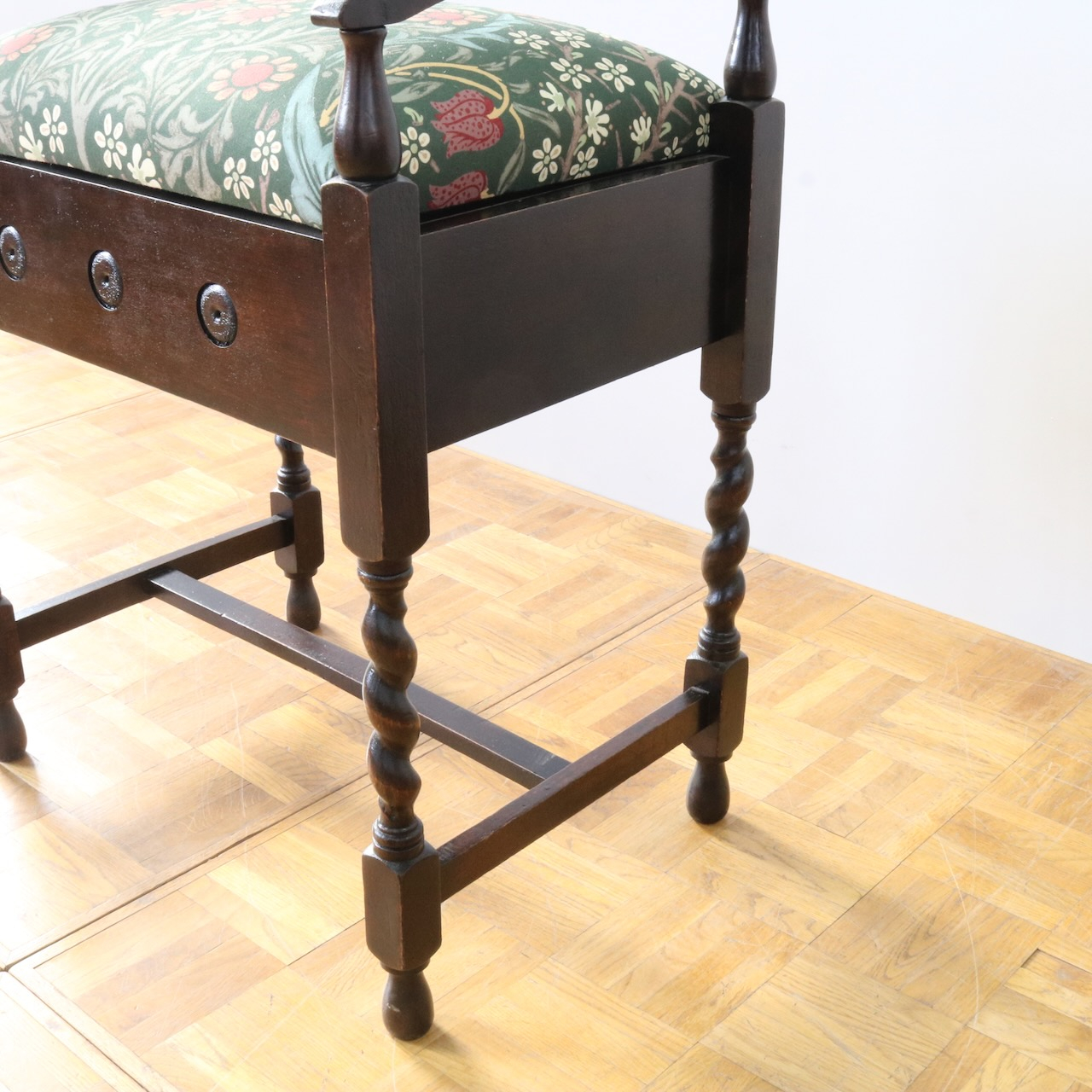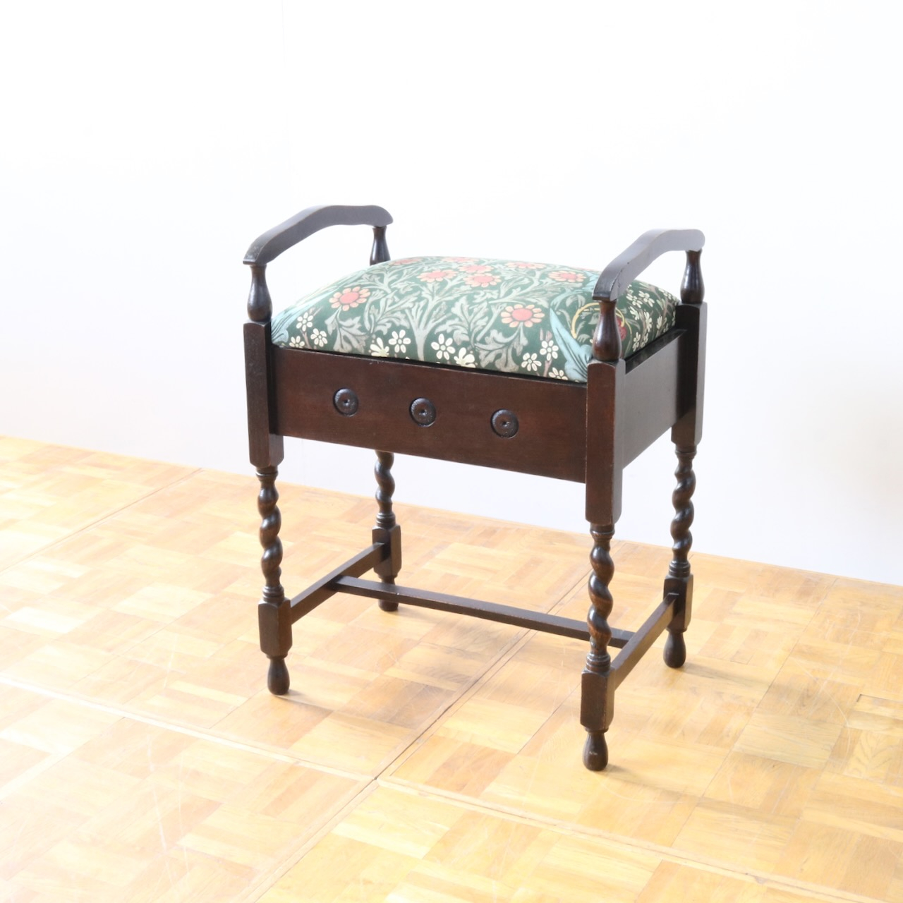 配送料の目安 ▶︎1930年代、オーク材のスツール。ツイストレッグにフロントの円形の装飾が可愛らしいアクセント。座面下が収納になっている実用性の高い仕様も嬉しいポイントです。ウィリアム・モリスの人気のパターン「ブラックトーン」で張り替えました。