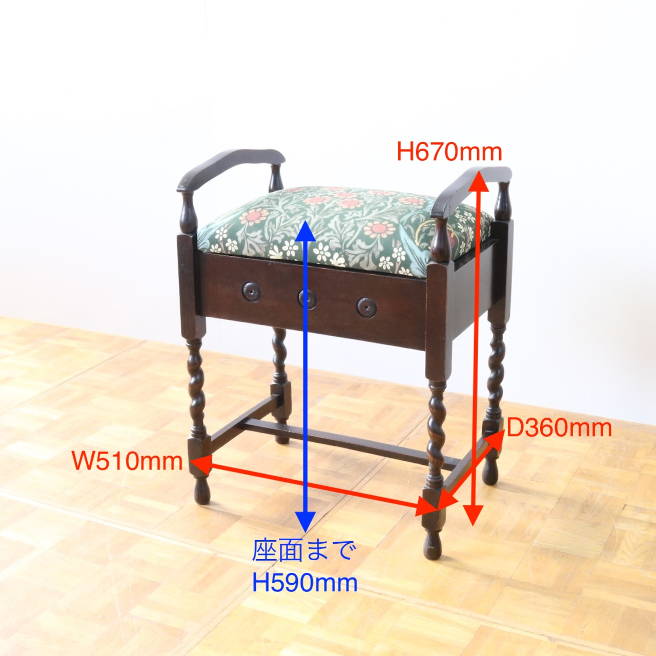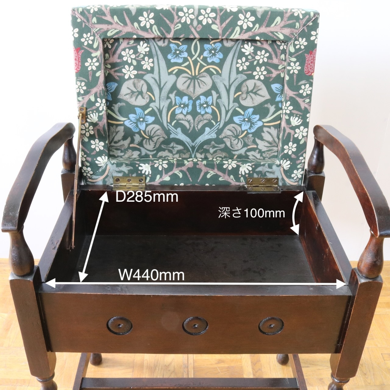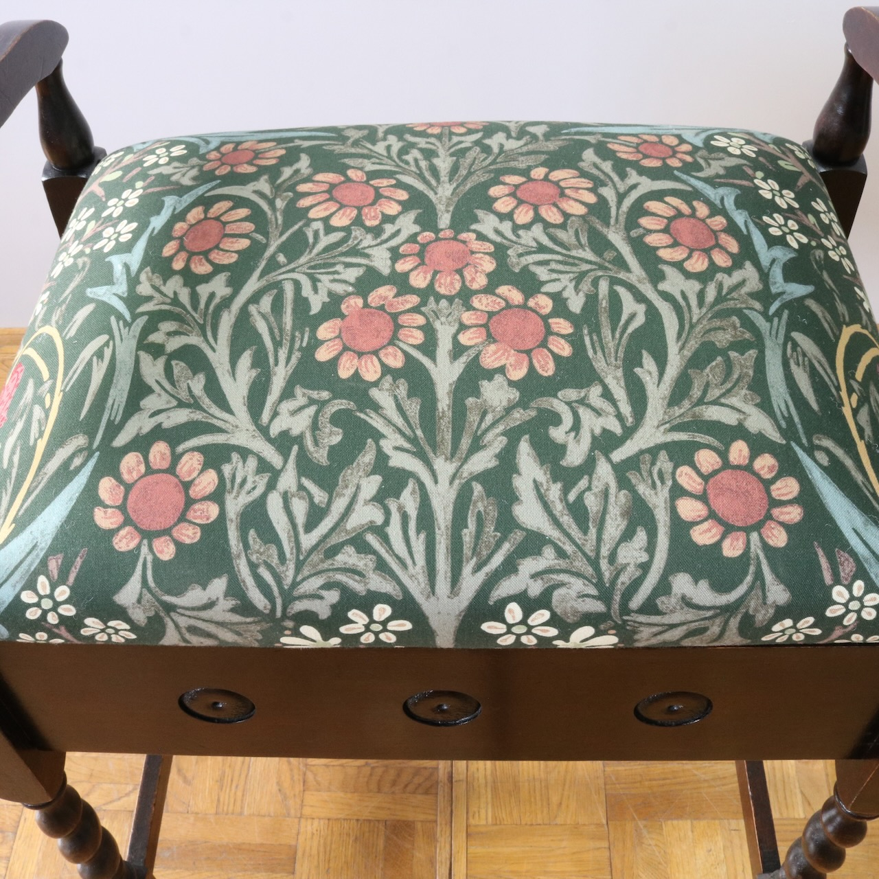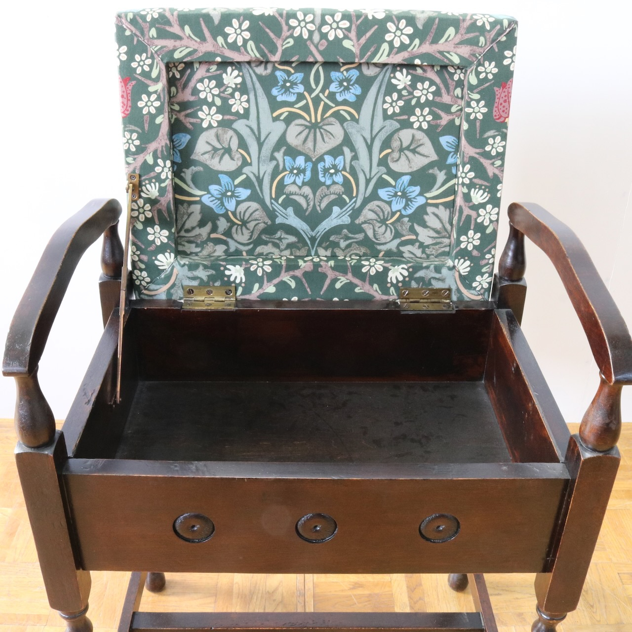 配送料の目安 ▶︎1930年代、オーク材のスツール。ツイストレッグにフロントの円形の装飾が可愛らしいアクセント。座面下が収納になっている実用性の高い仕様も嬉しいポイントです。ウィリアム・モリスの人気のパターン「ブラックトーン」で張り替えました。