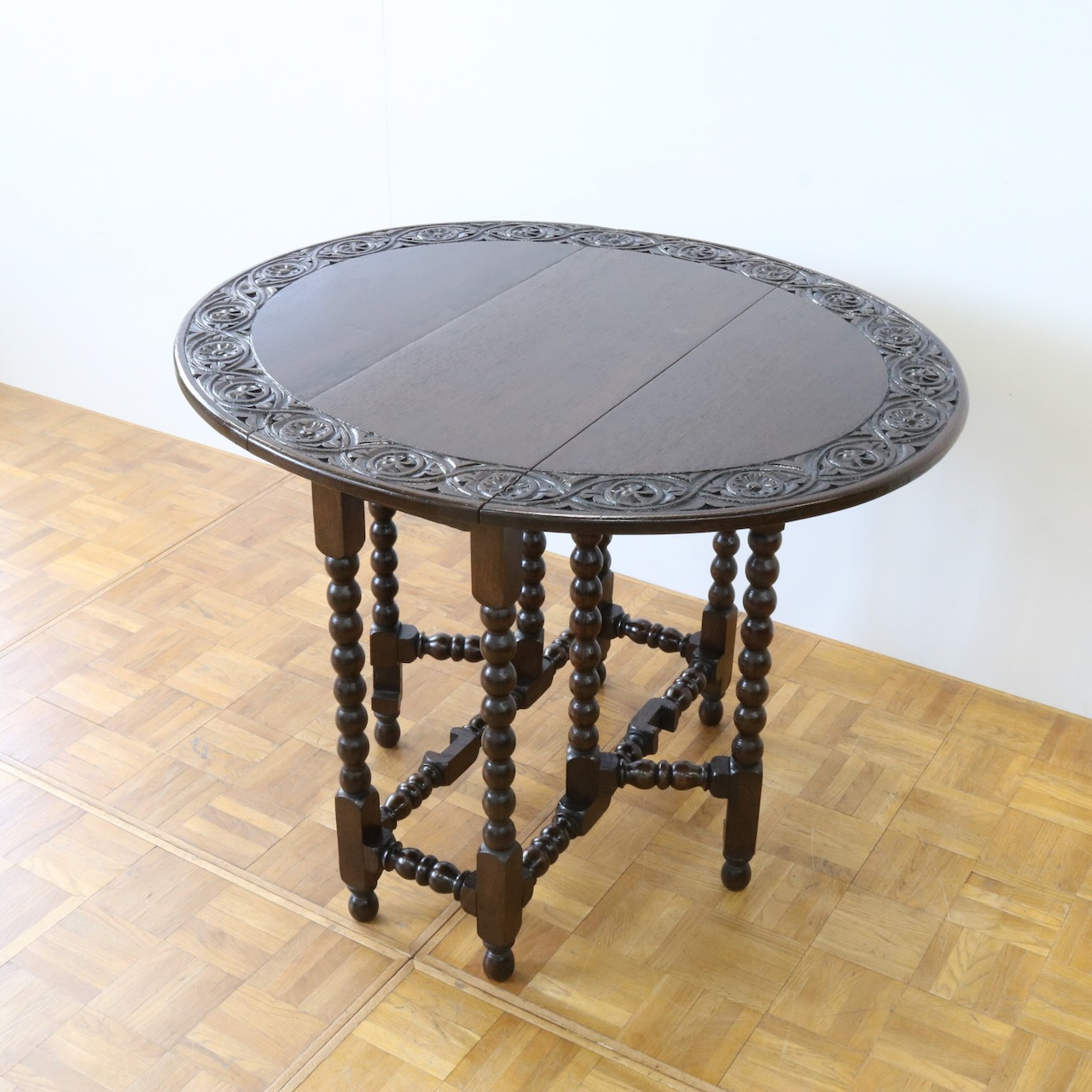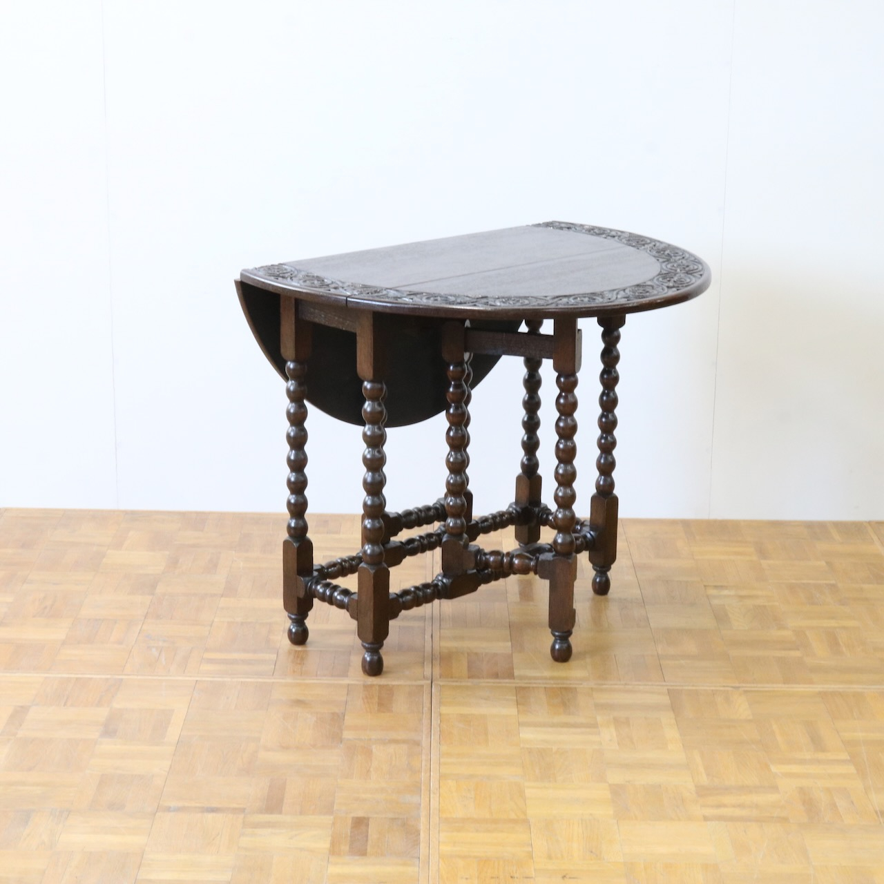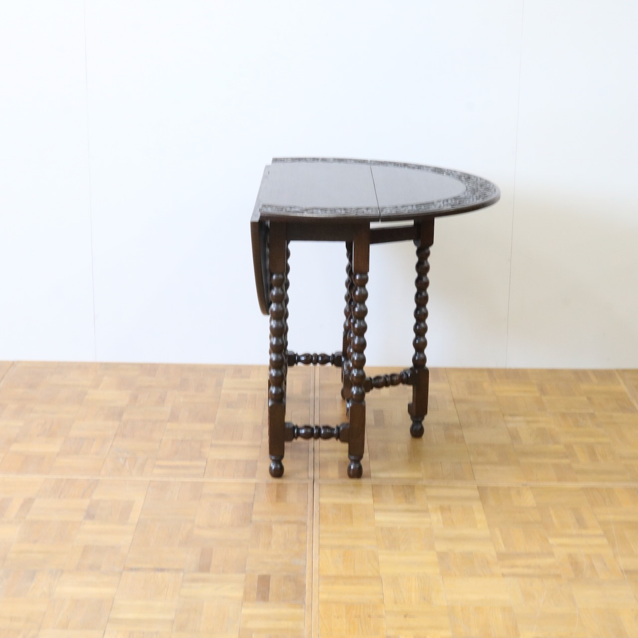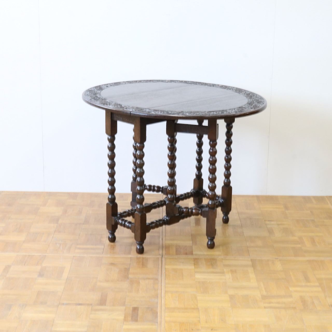 配送料の目安 ▶︎1930年代、オーク材のゲートレッグテーブル。天板縁にしっかりと彫り込まれた葉が見事です。ボビン型の脚も丁寧に造られ、アンティークらしい趣のあるテーブルです。