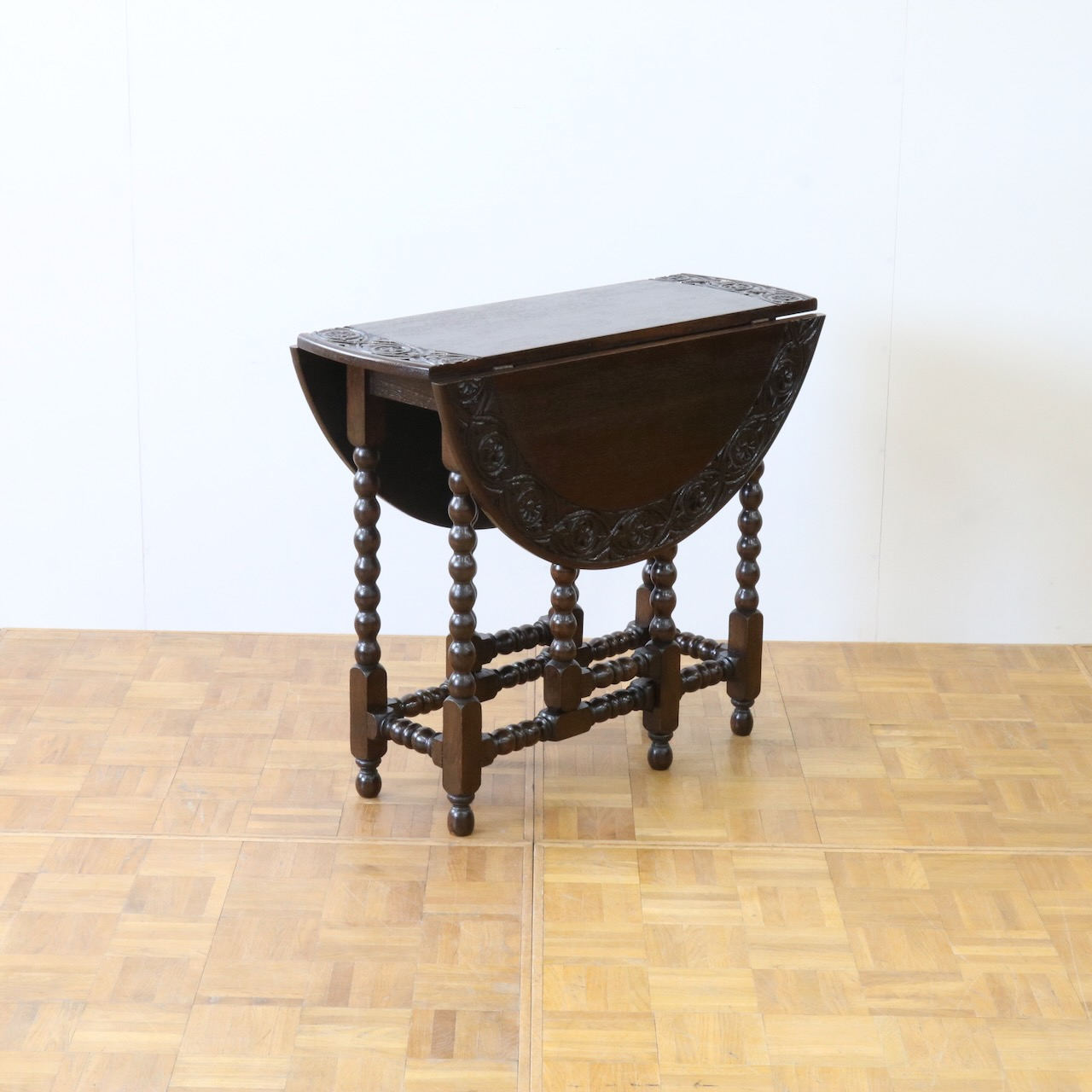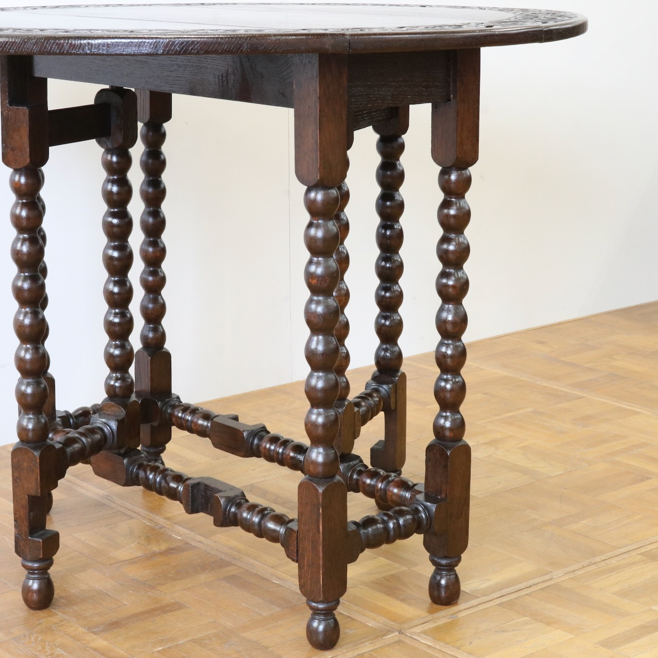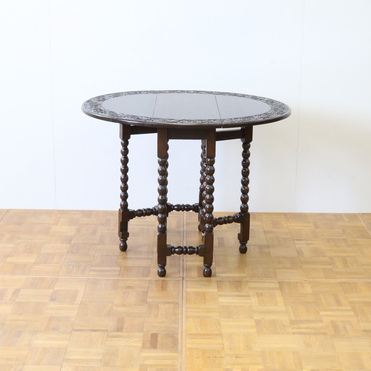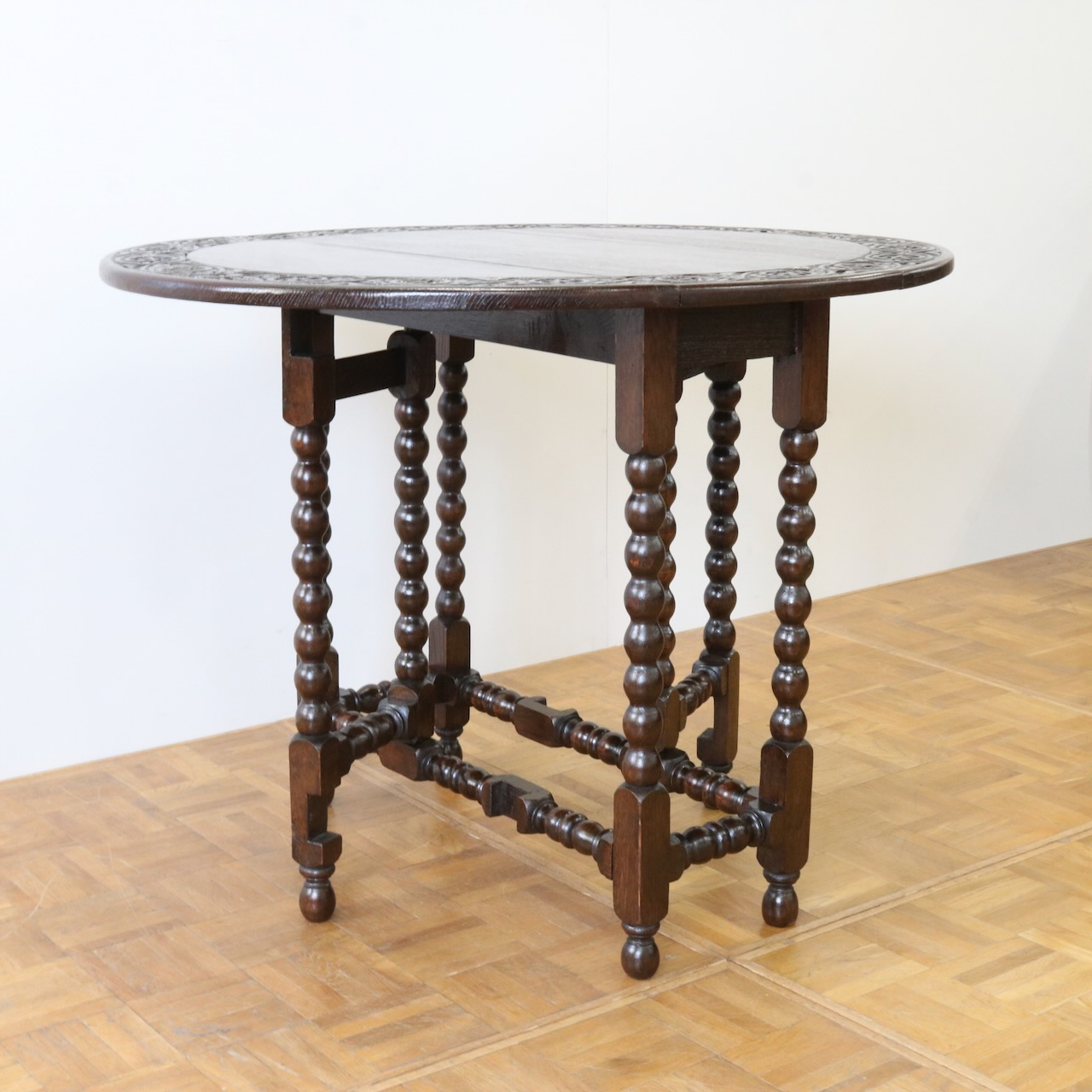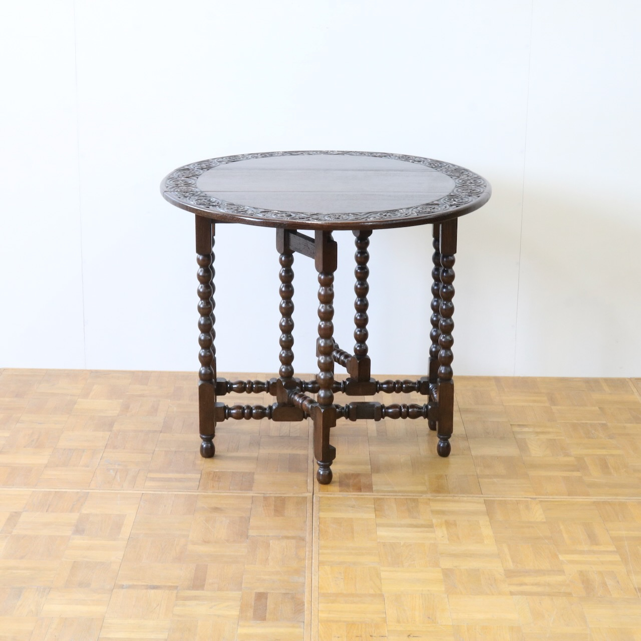 配送料の目安 ▶︎1930年代、オーク材のゲートレッグテーブル。天板縁にしっかりと彫り込まれた葉が見事です。ボビン型の脚も丁寧に造られ、アンティークらしい趣のあるテーブルです。