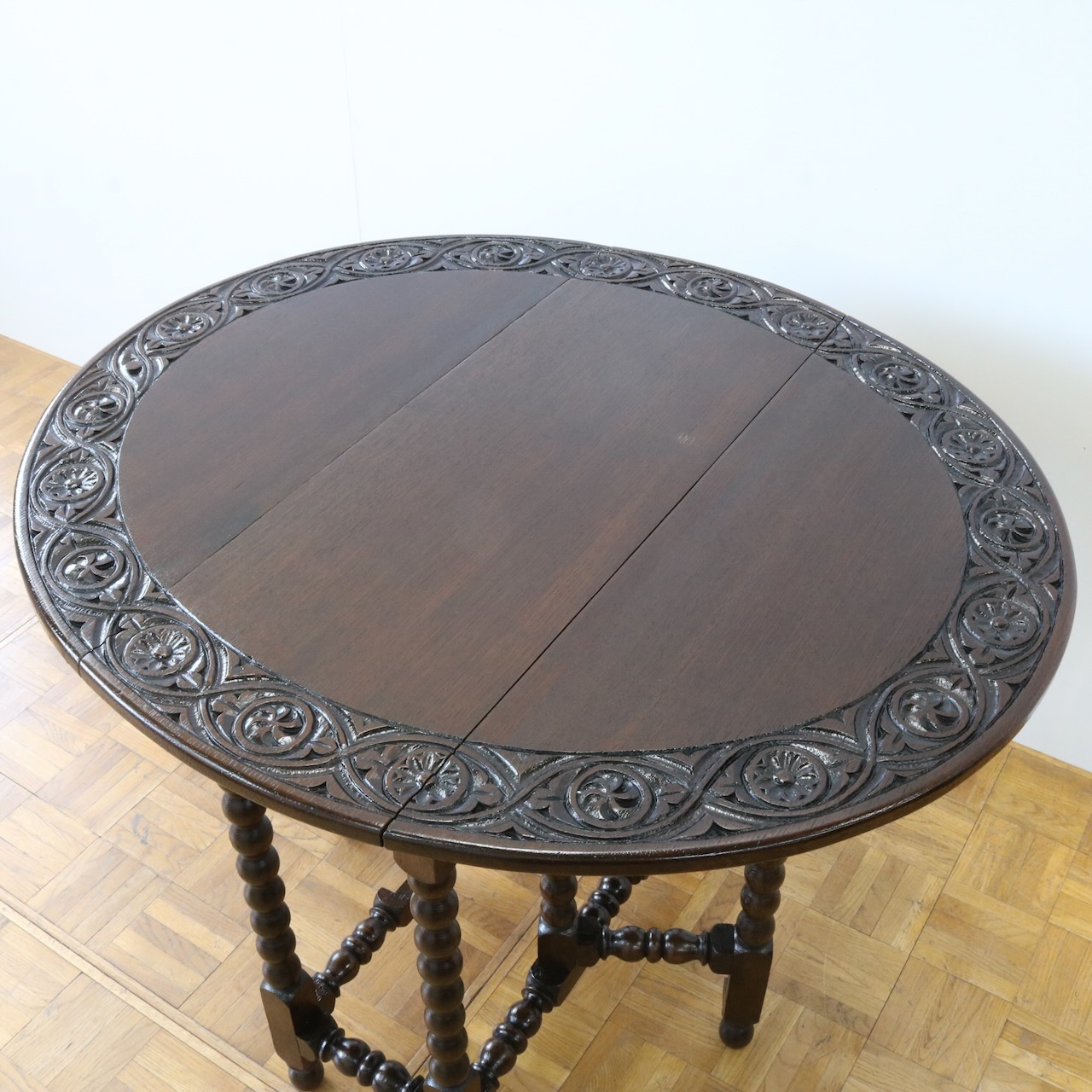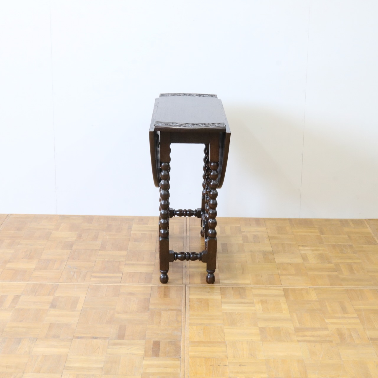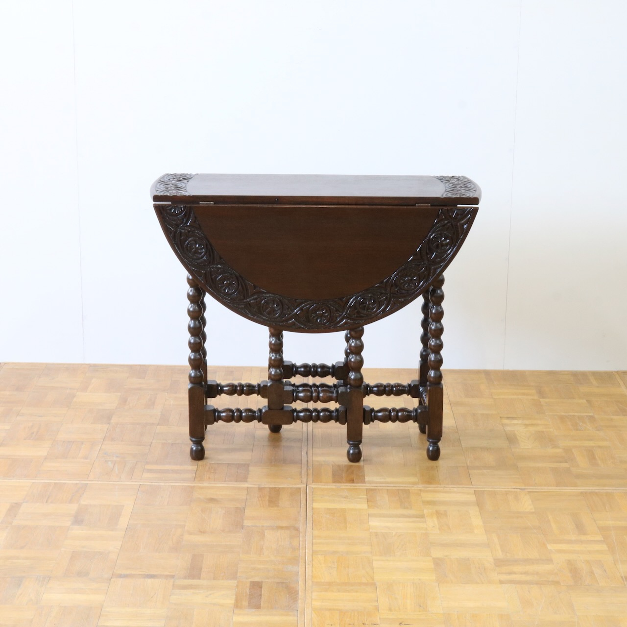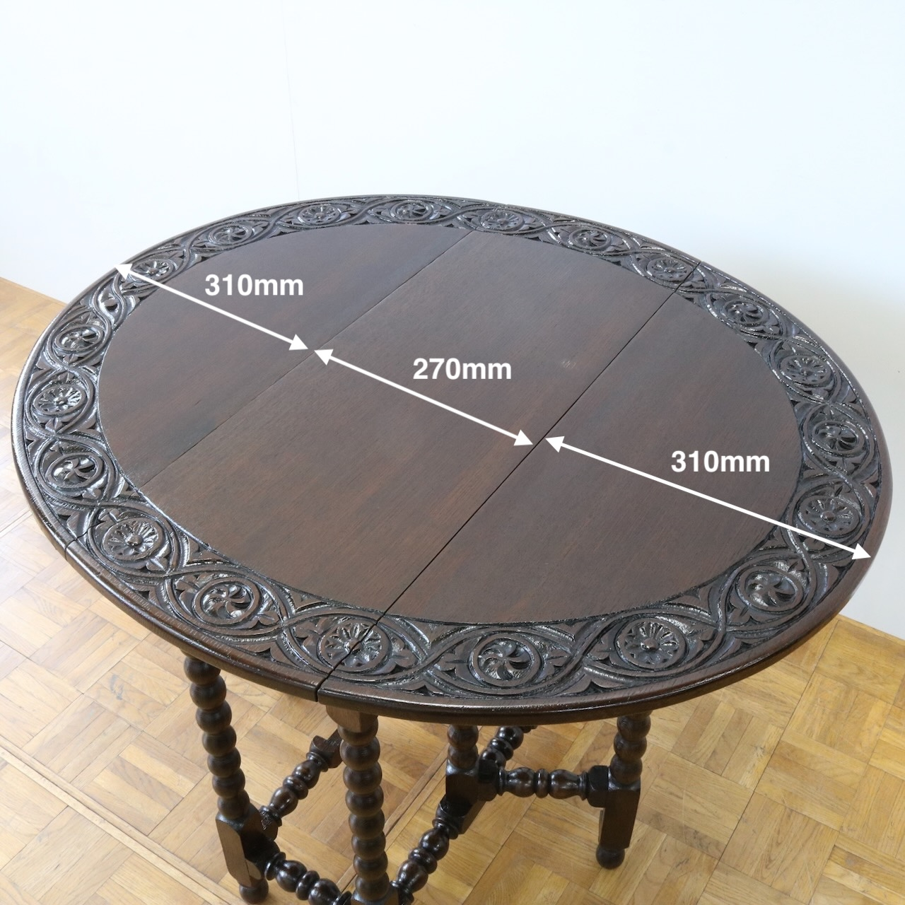 配送料の目安 ▶︎1930年代、オーク材のゲートレッグテーブル。天板縁にしっかりと彫り込まれた葉が見事です。ボビン型の脚も丁寧に造られ、アンティークらしい趣のあるテーブルです。