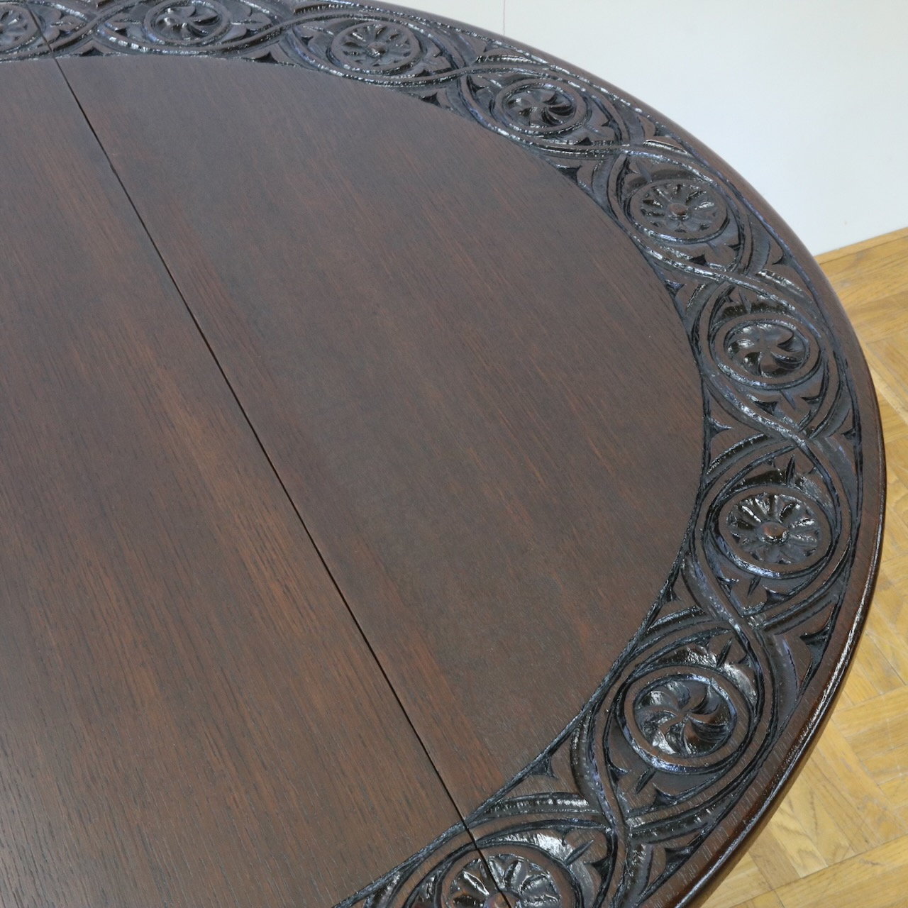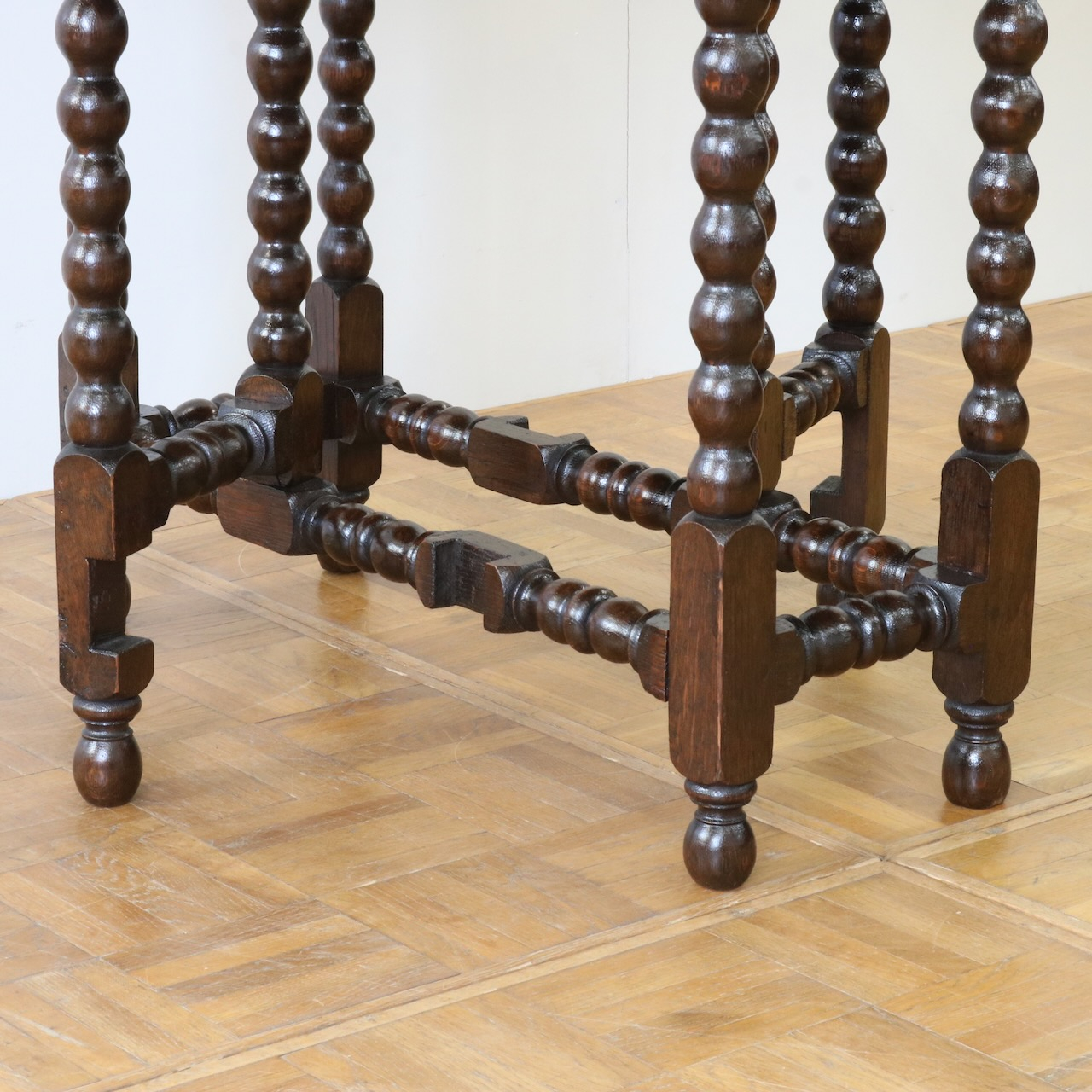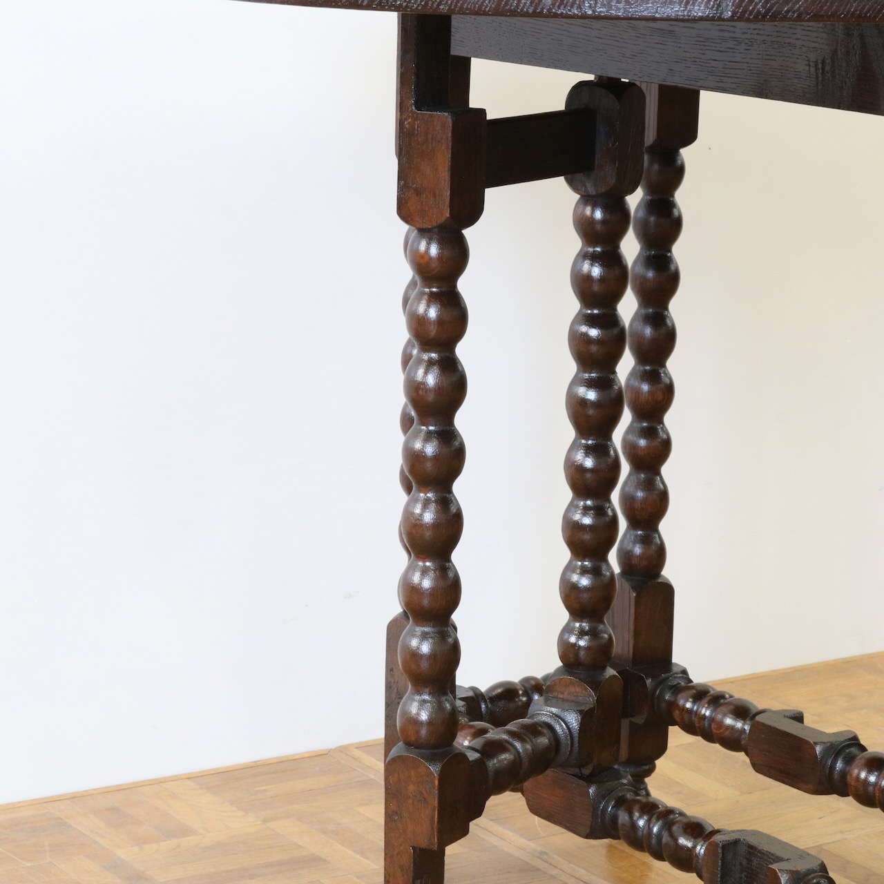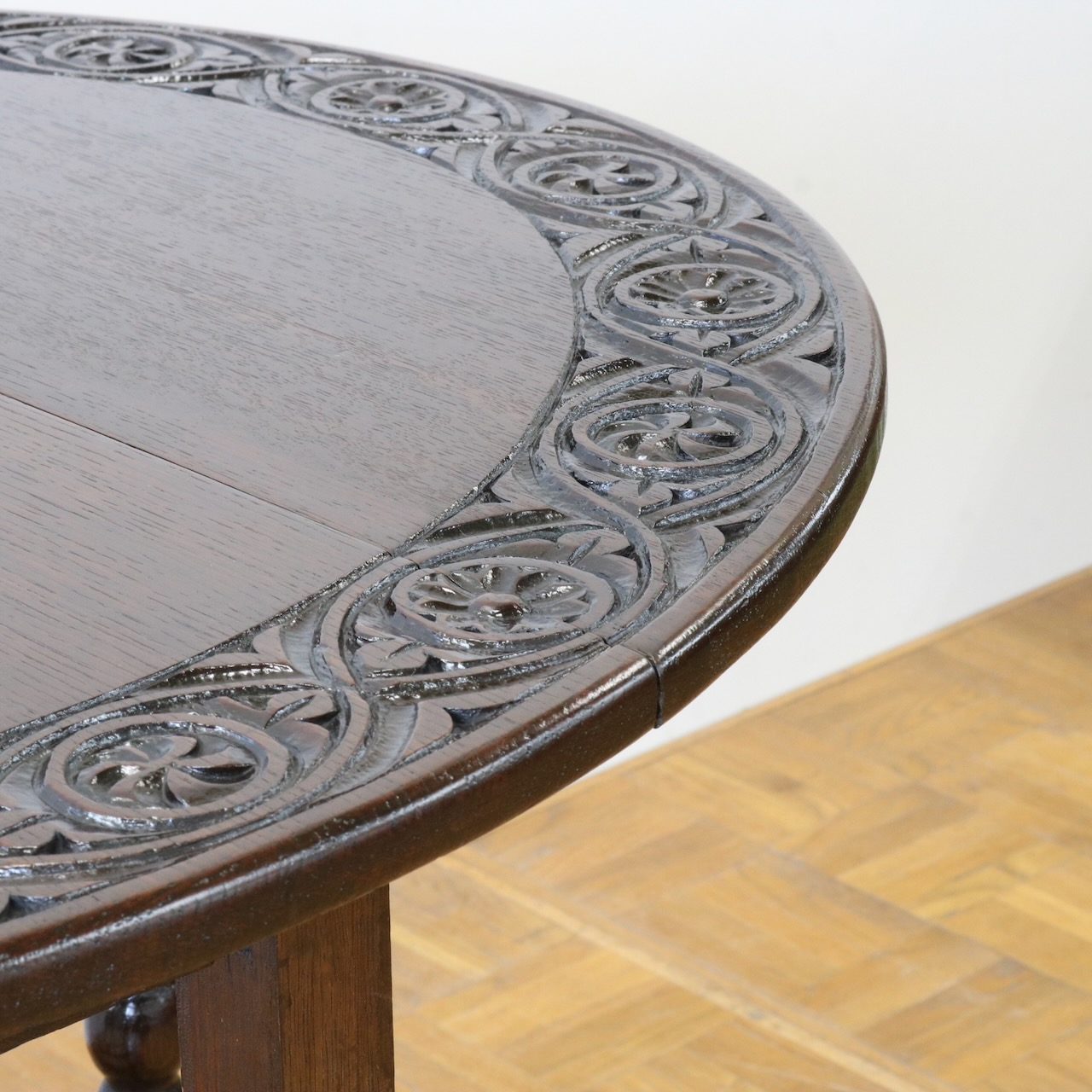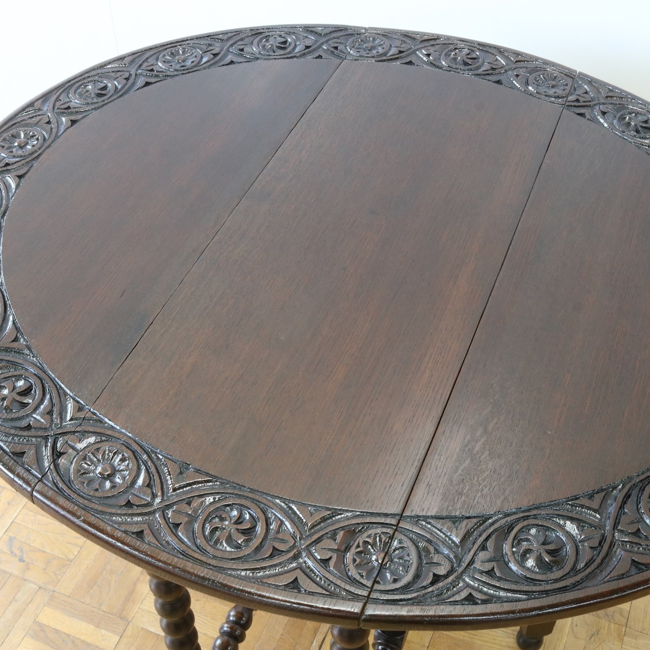 配送料の目安 ▶︎1930年代、オーク材のゲートレッグテーブル。天板縁にしっかりと彫り込まれた葉が見事です。ボビン型の脚も丁寧に造られ、アンティークらしい趣のあるテーブルです。