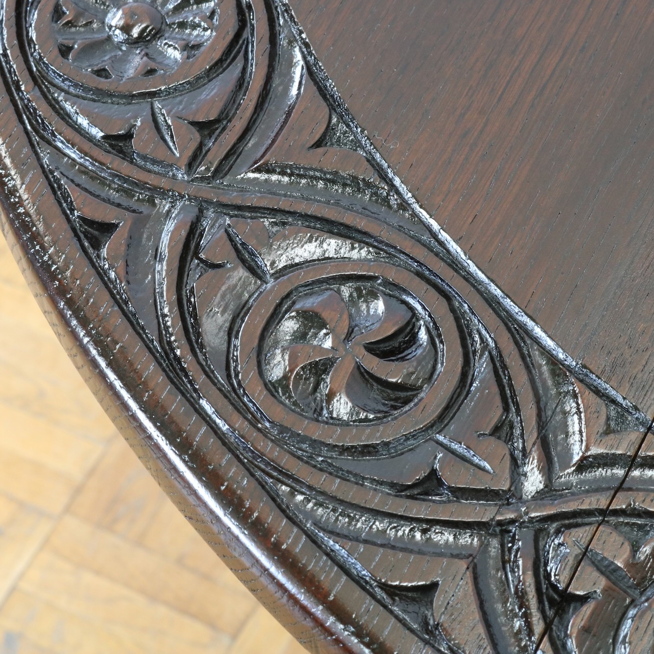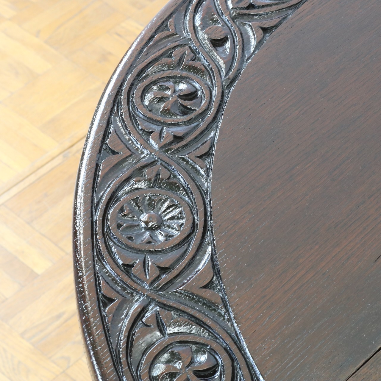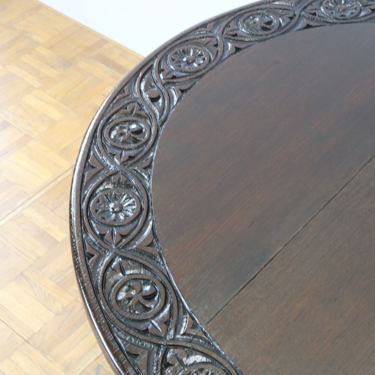 天板縁にぐるりと施された彫刻装飾がユニークです。