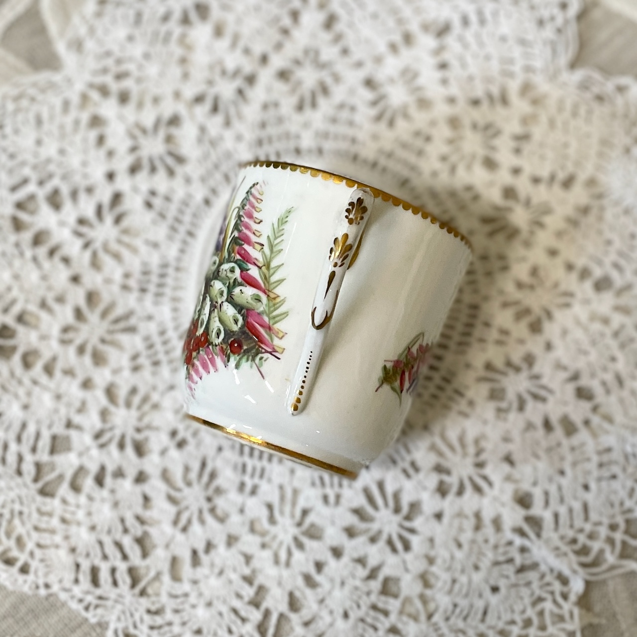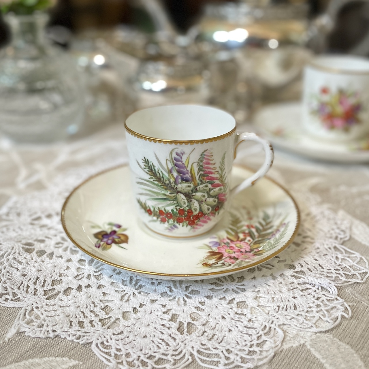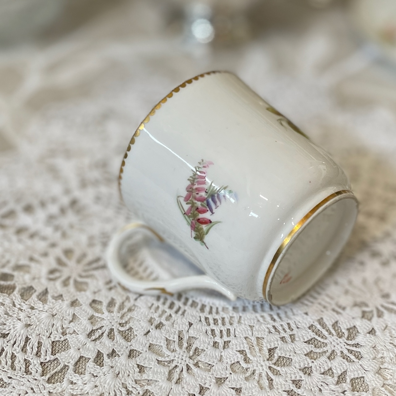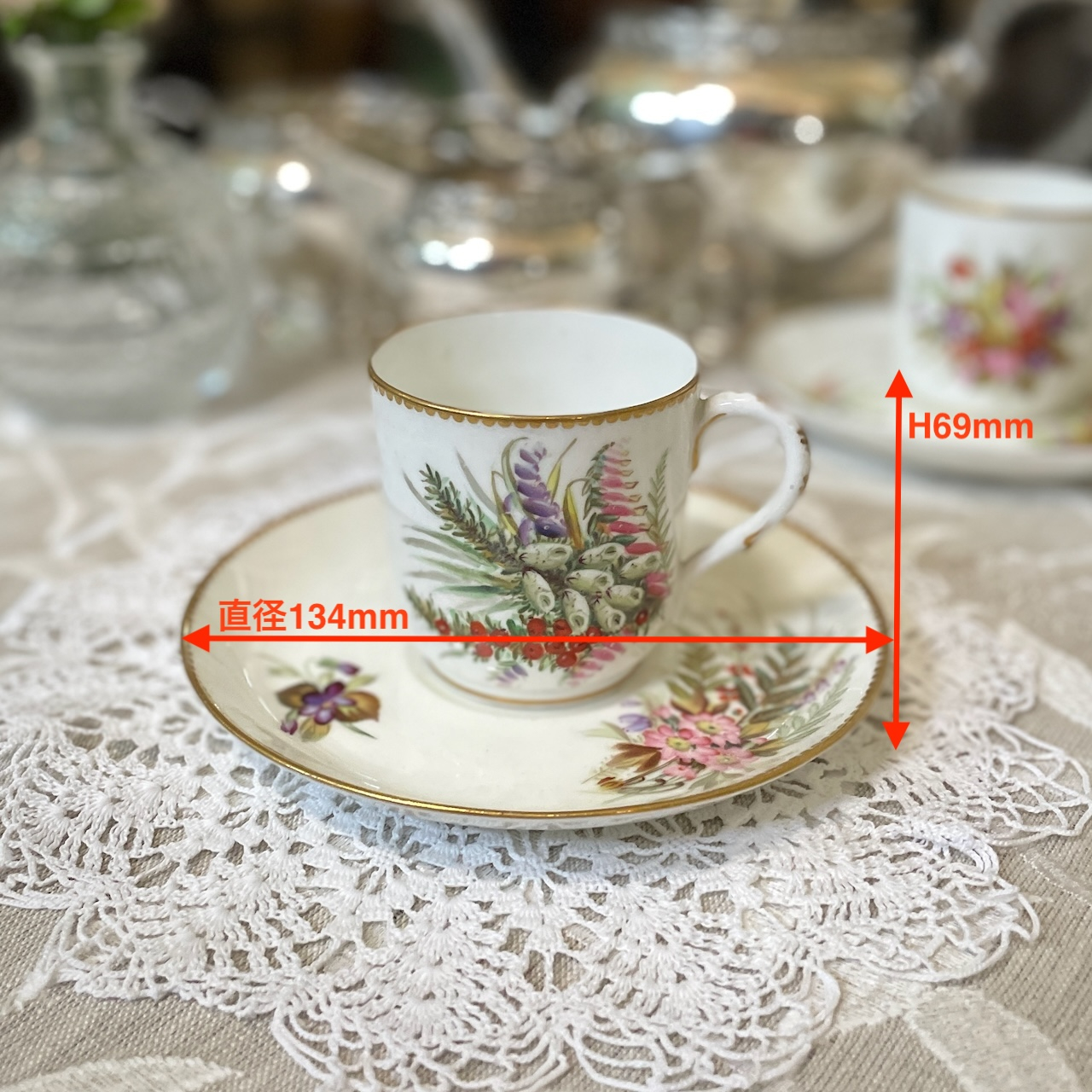 配送料の目安 ▶︎英国の名窯Royal Worcester、1875年頃のコーヒーカップ。野に咲く花々を束ねたような瑞々しさを感じさせるお花柄がデザインされています。縁の金彩飾りも可愛らしく上品な印象です。(402-R-0014カップアンドソーサーと絵柄違いです。)
