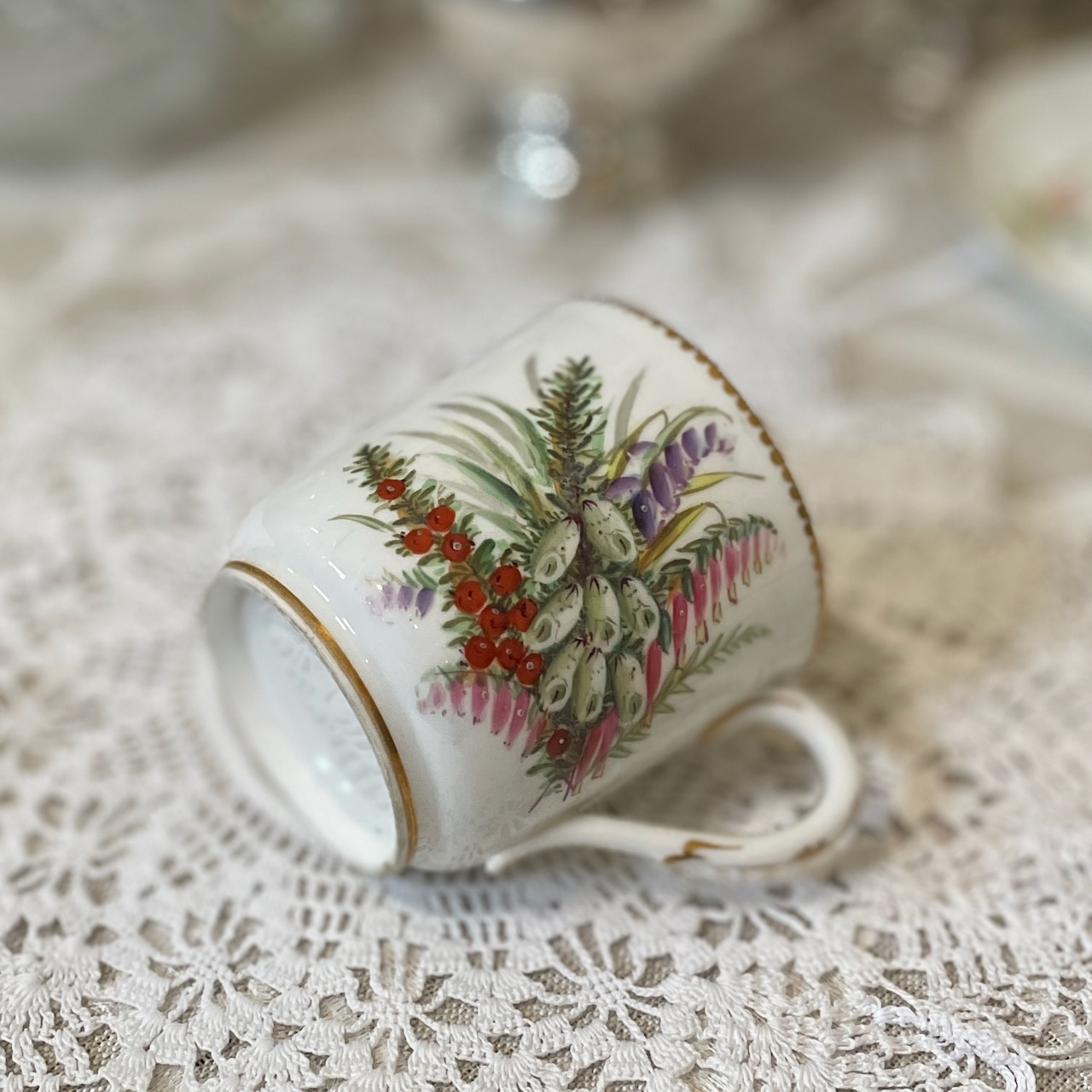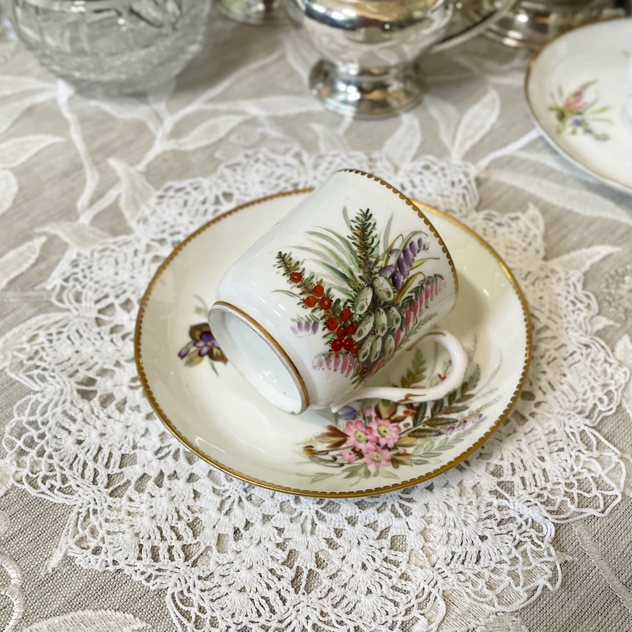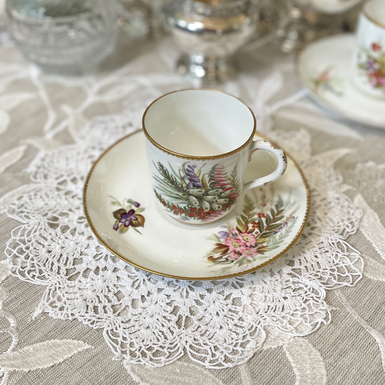 配送料の目安 ▶︎英国の名窯Royal Worcester、1875年頃のコーヒーカップ。野に咲く花々を束ねたような瑞々しさを感じさせるお花柄がデザインされています。縁の金彩飾りも可愛らしく上品な印象です。(402-R-0014カップアンドソーサーと絵柄違いです。)