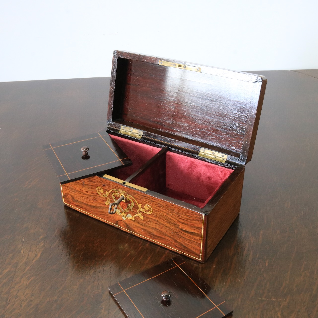 もともとはティーキャディーとして、2種類の茶葉を分けて入れていたものですが、内側に赤いベロア生地を張って、様々な小物を収納できるケースとして仕上げました。