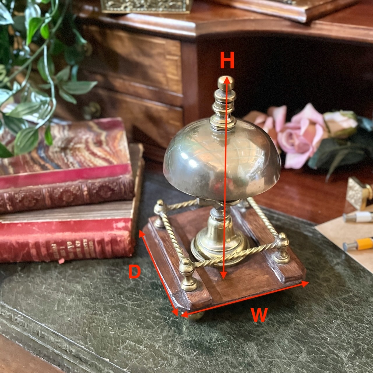 配送料の目安 ▶︎英国エドワーディアン、真鍮製の卓上ベル。トップを強く押すと綺麗な音が響きます。オーク材のベースにバルコニーのように巡らされた真鍮飾りのデザインも優れており、置くだけでクラシックな雰囲気を演出できる一品です。ショップやレストランのカウンター、エントランスにいかがでしょうか。