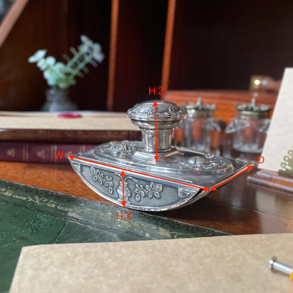 配送料の目安 ▶︎1900年代、シルバープレートのブロッター。万年筆などで書いた後に余分なインクを吸い取るための文具です。花々のエンボス加工が施されたシルバーがエレガントな雰囲気。デスクに置いてクラシックなライティングスペースのコーディネートにおすすめのアイテム。