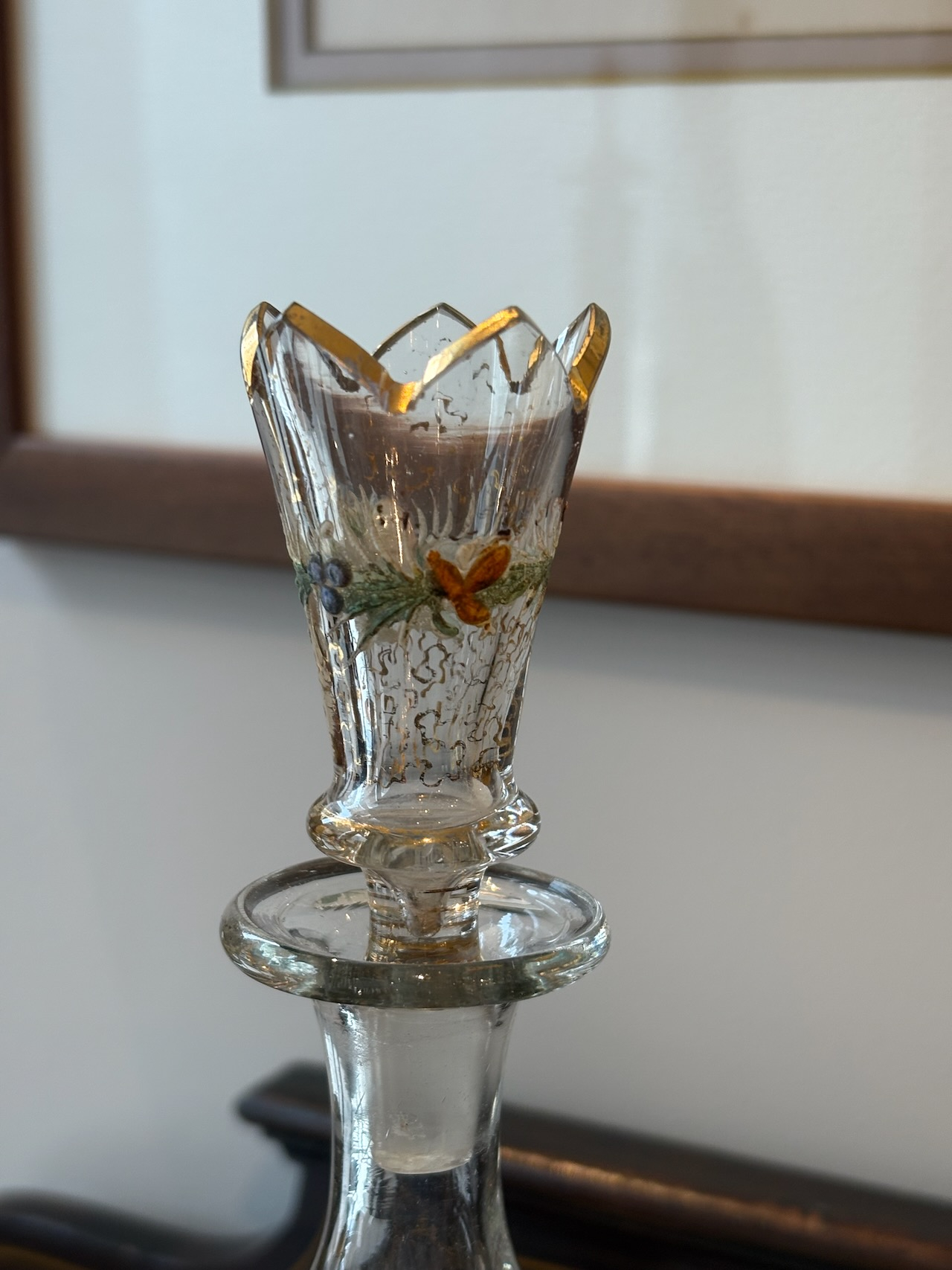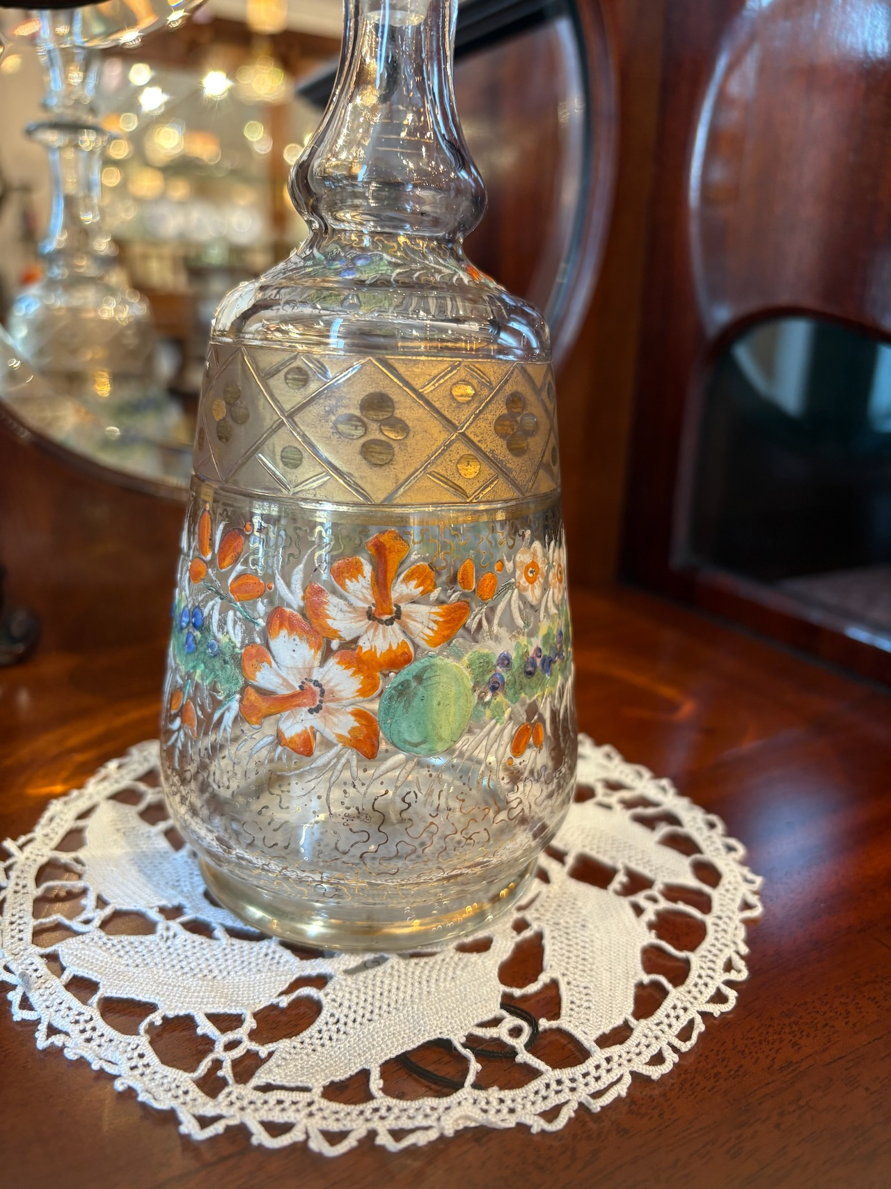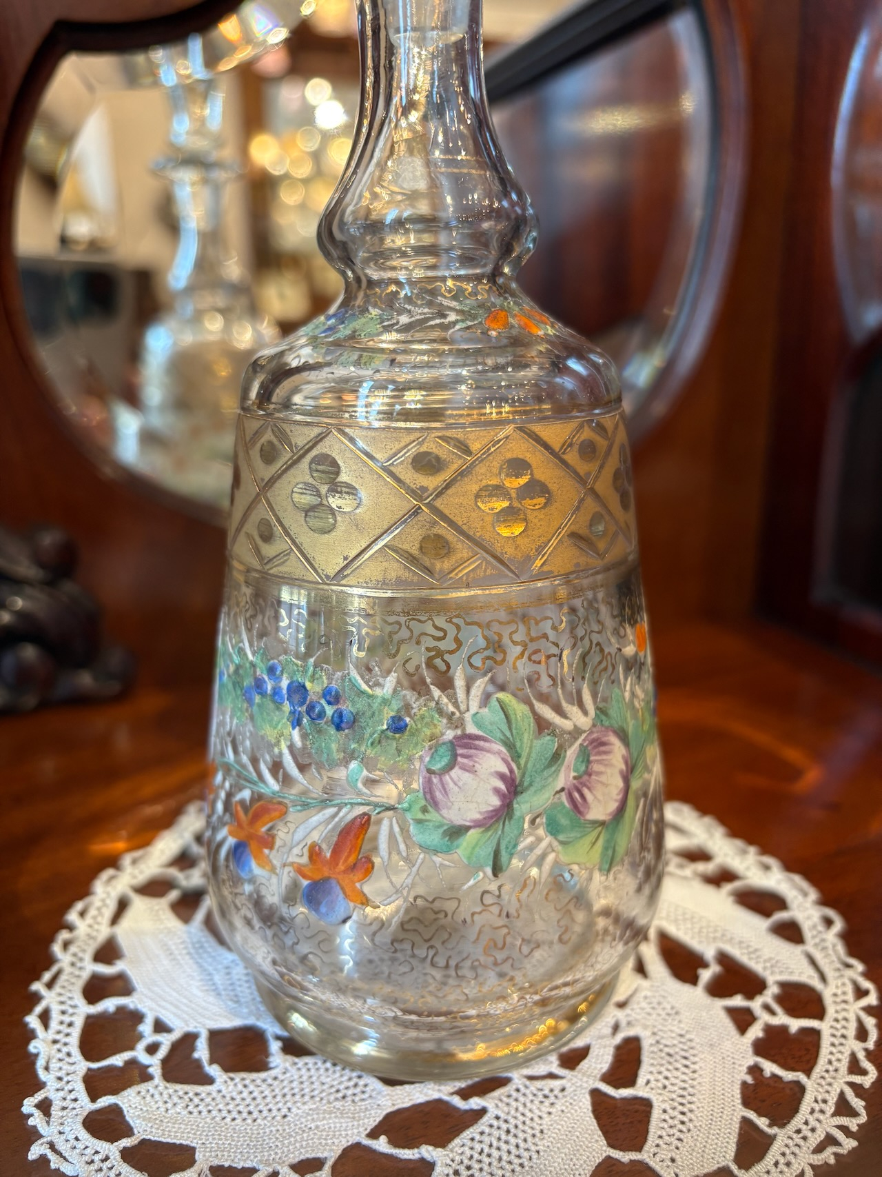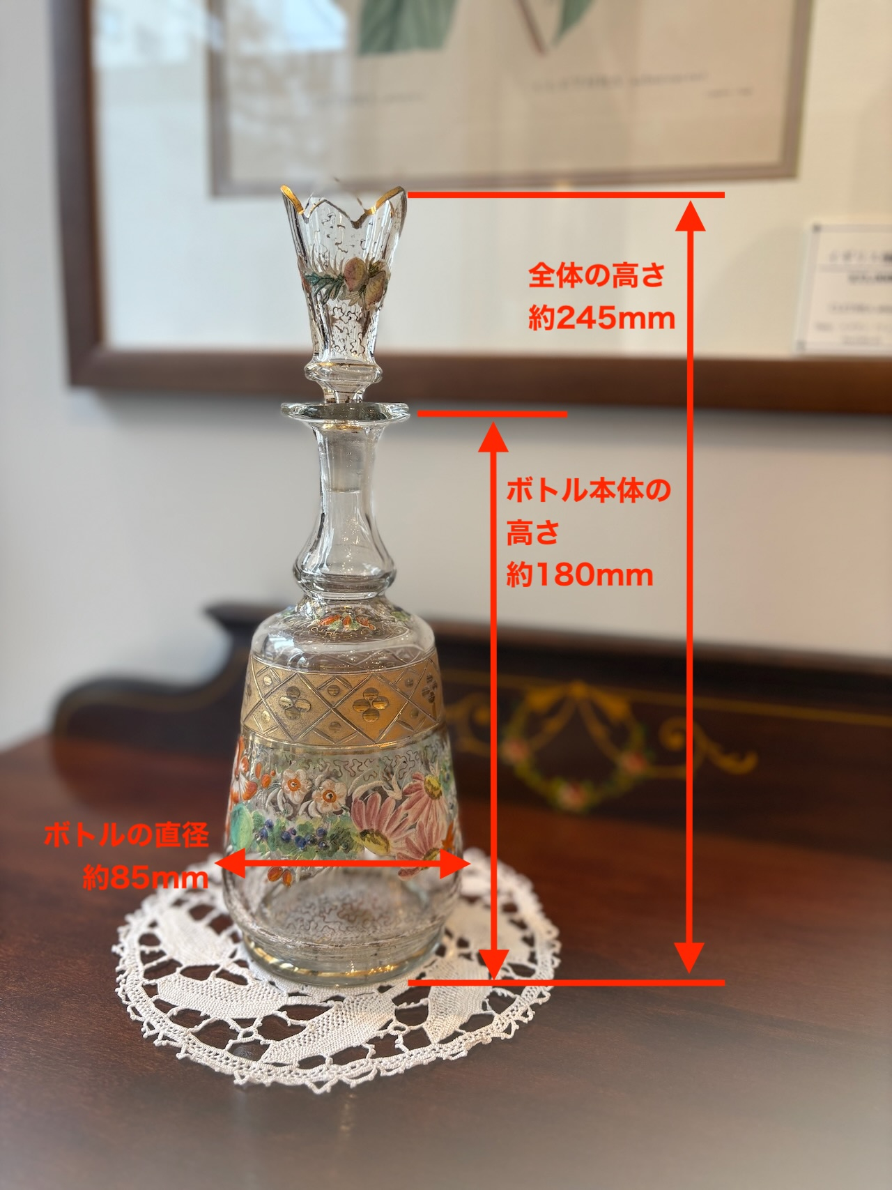 ガラスのデキャンタボトル。金彩とエナメルペイントがゴージャスに施された逸品。サイズも手頃で手の中に収まる感じが使い易さの良いデキャンタです。