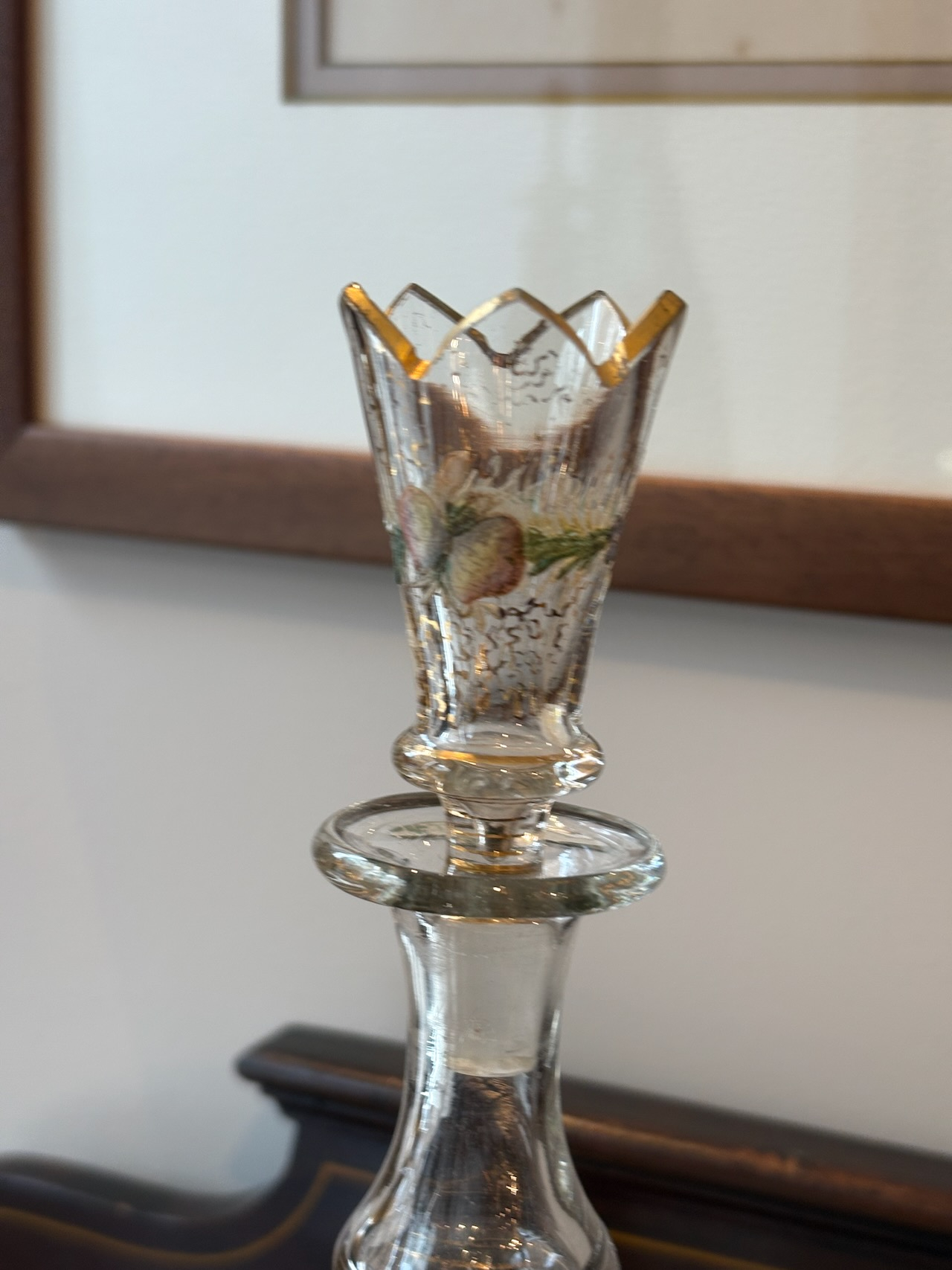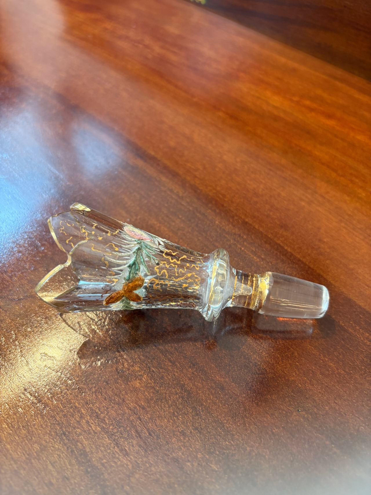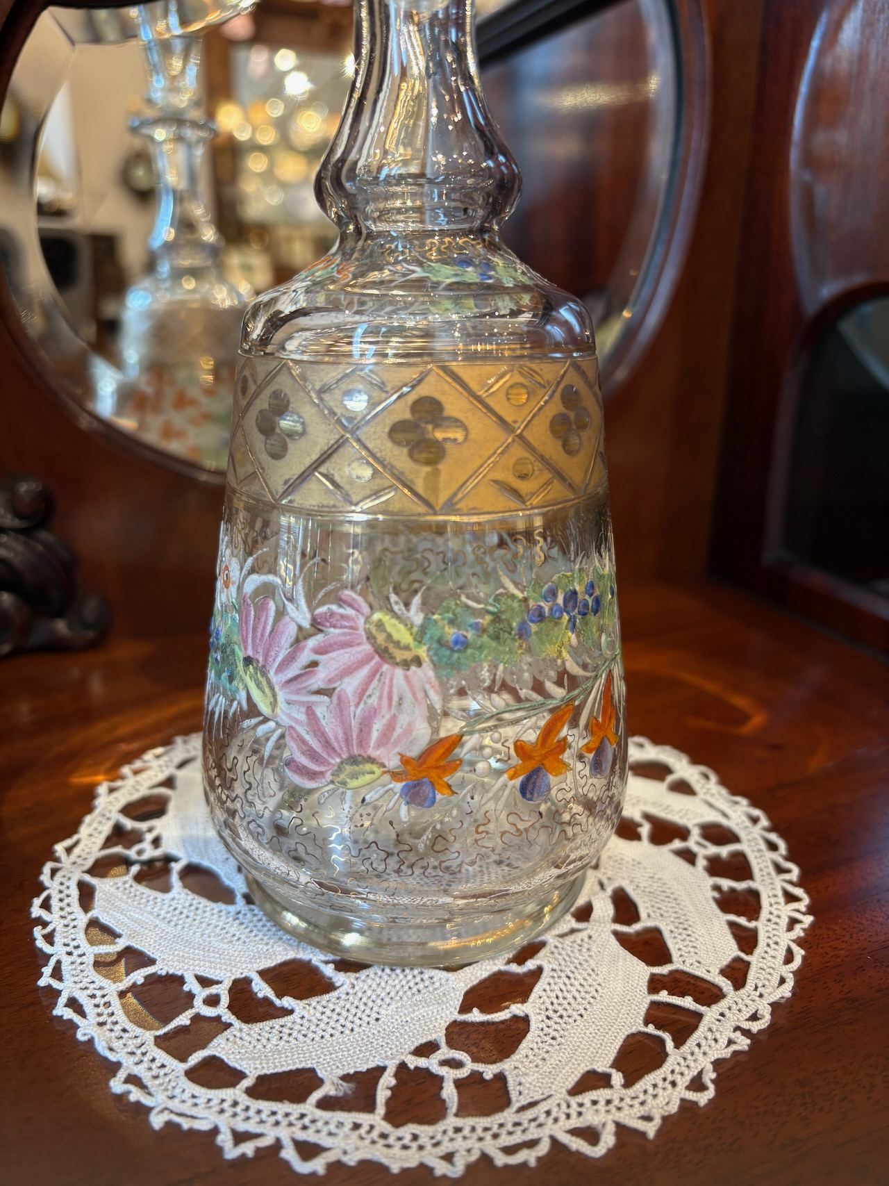 ガラスのデキャンタボトル。金彩とエナメルペイントがゴージャスに施された逸品。サイズも手頃で手の中に収まる感じが使い易さの良いデキャンタです。