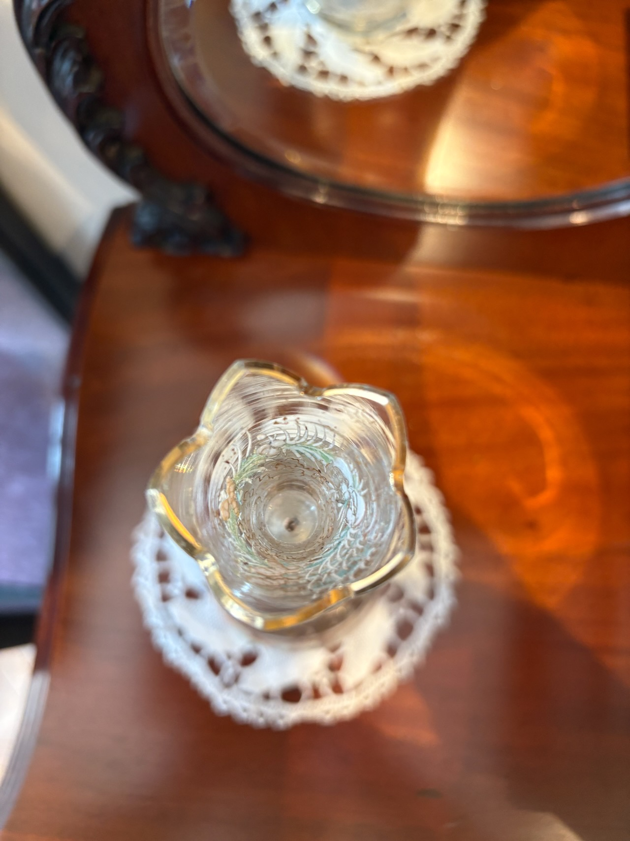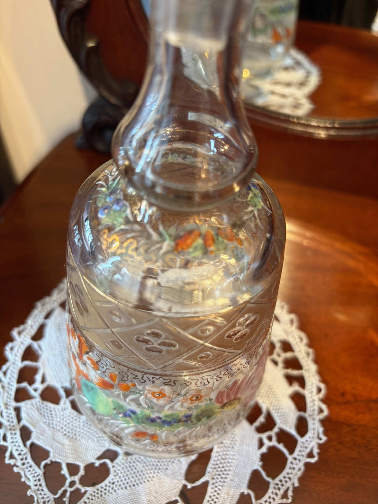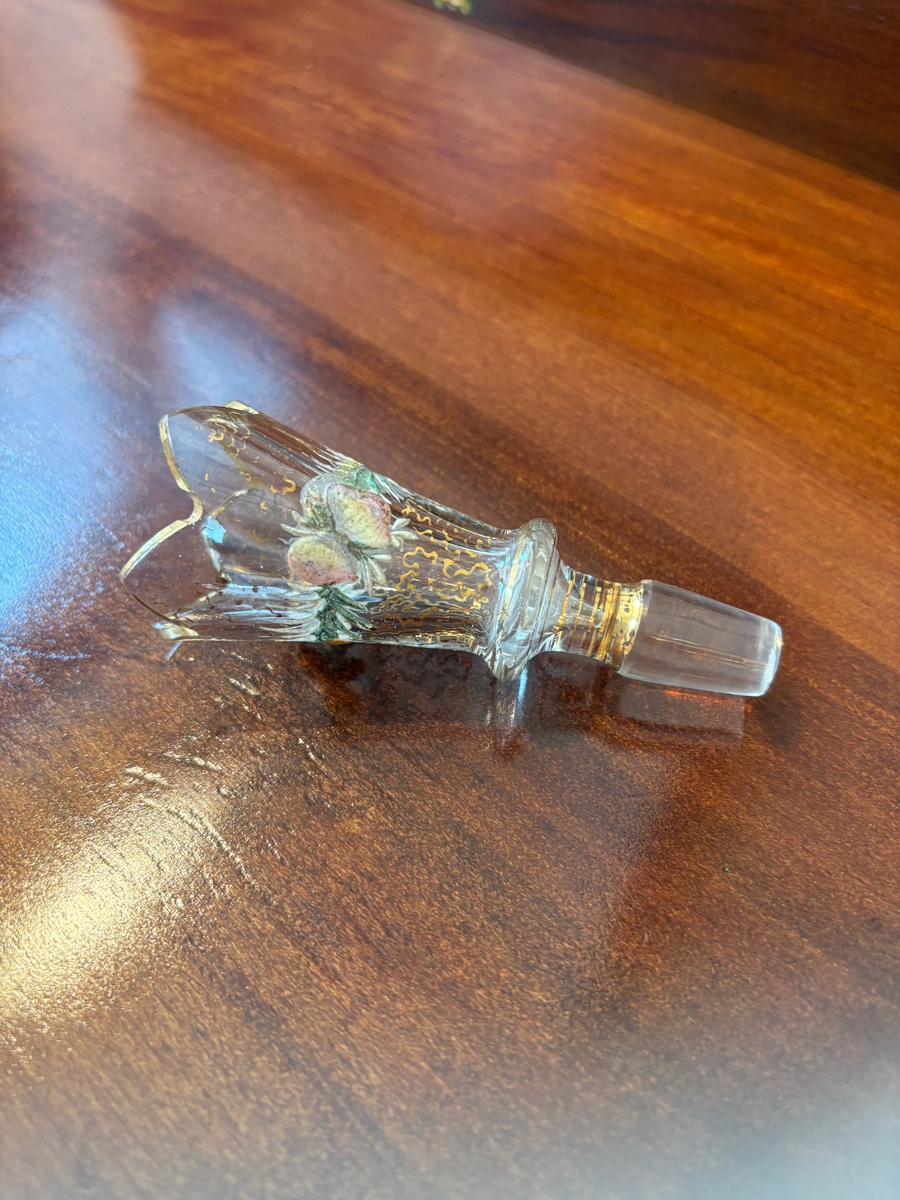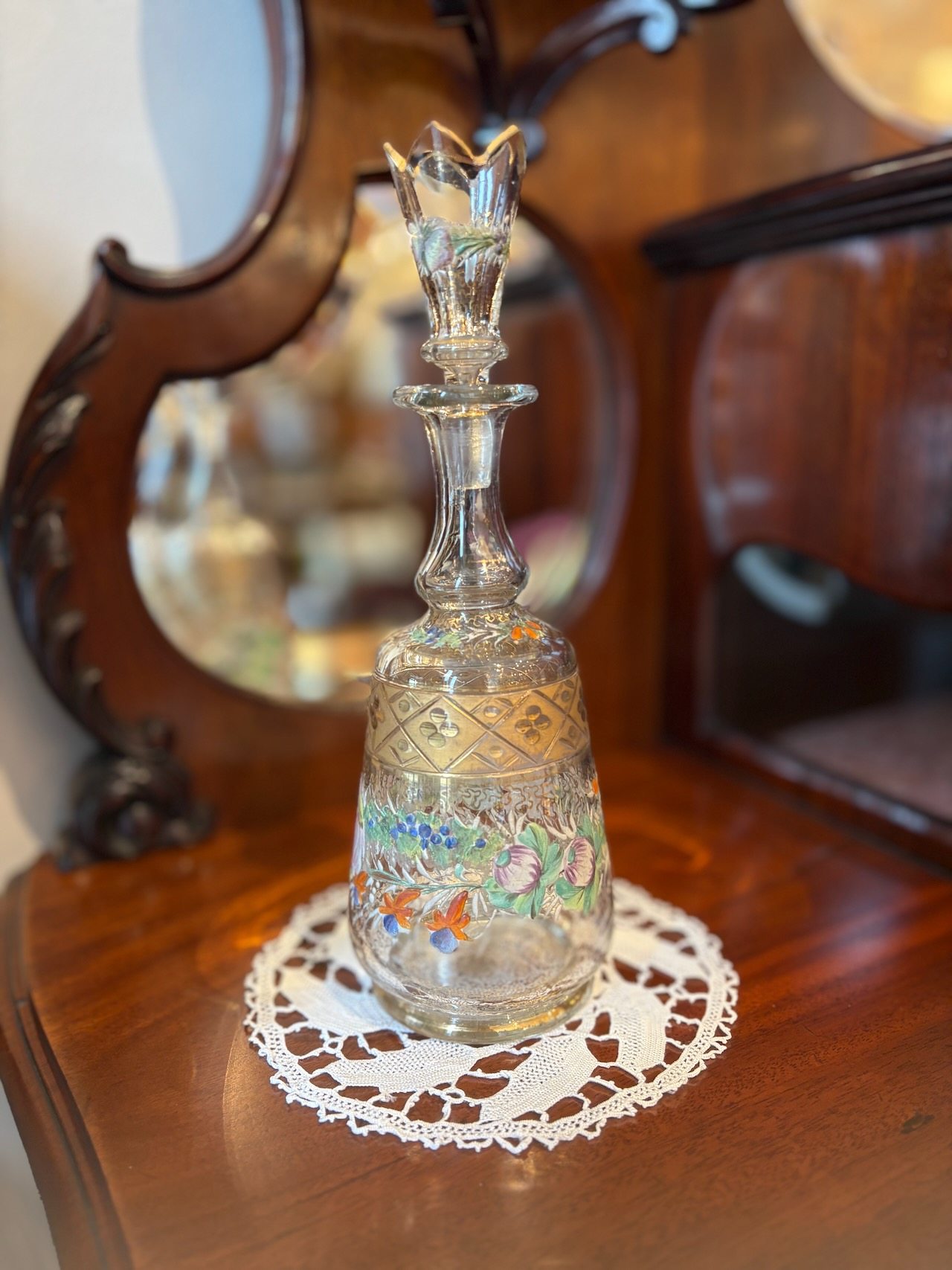 ガラスのデキャンタボトル。金彩とエナメルペイントがゴージャスに施された逸品。サイズも手頃で手の中に収まる感じが使い易さの良いデキャンタです。