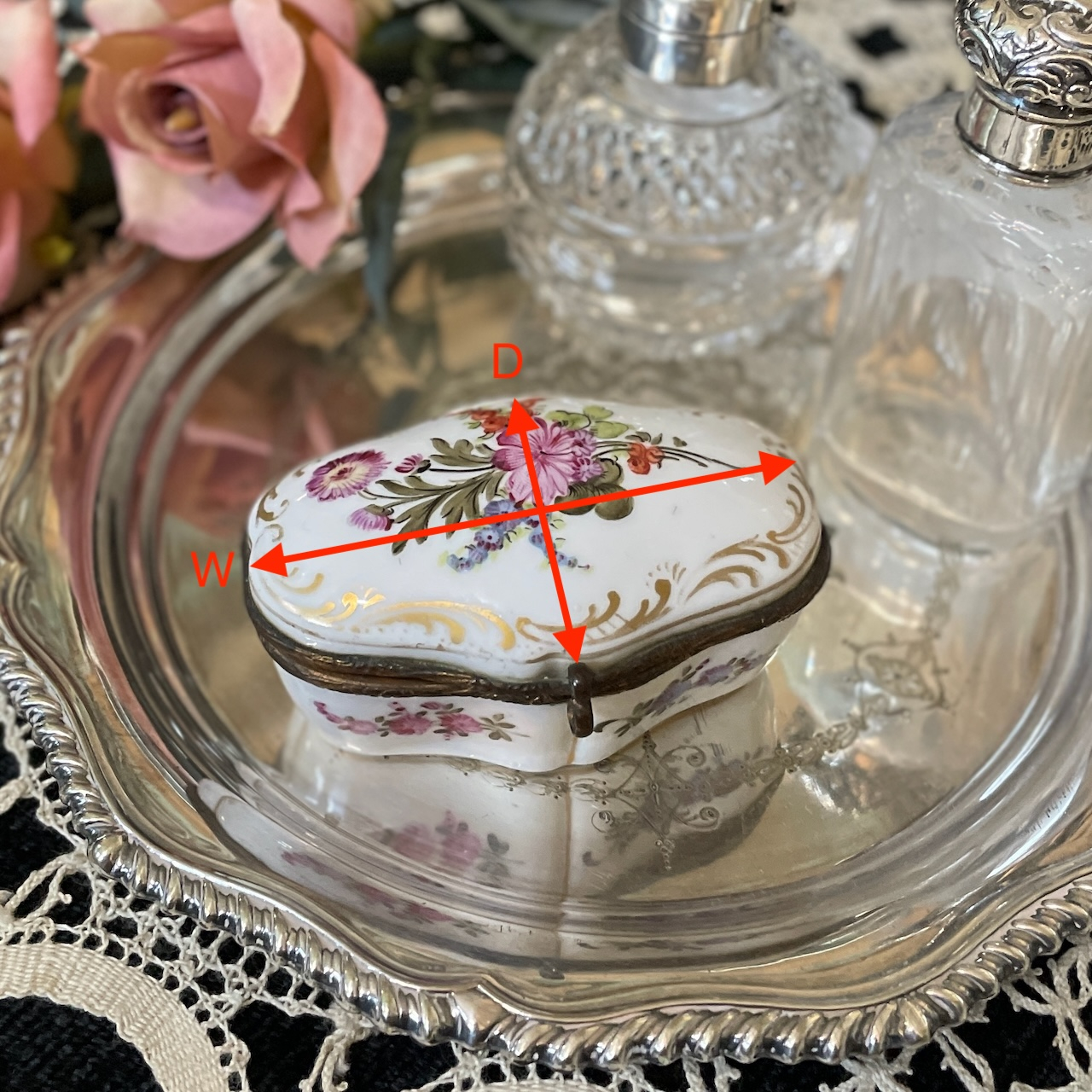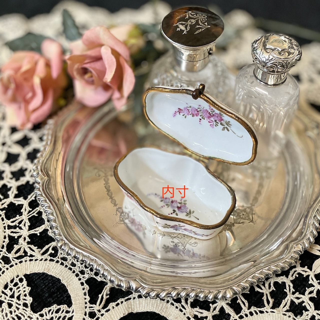 お花はすべてハンドペイントで描かれていて、非常に状態の良いお品です。内側に絵柄があるのも嬉しいですね。繊細なお花は彩りも鮮やか、金彩の縁取りで小さいながらも華やかです。ピルケースとして、小さなアクセサリー入れとして、いつもそばにあると嬉しくなるアイテムです。