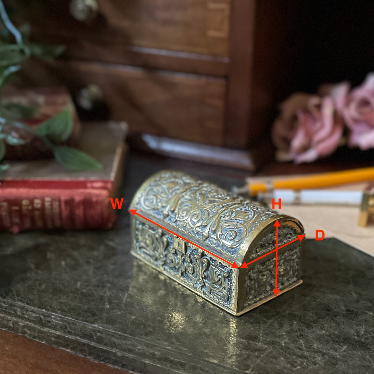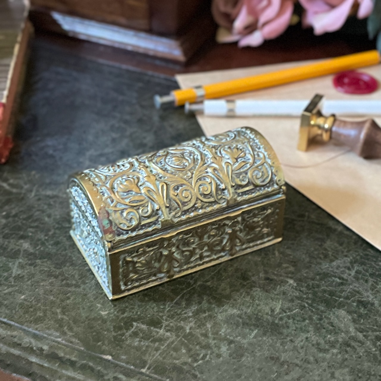配送料の目安 ▶︎英国ヴィクトリアン、真鍮製のスタンプボックスです。切手を入れる小箱で、アール・ヌーヴォー調の緻密な植物紋様が全体にあしらわれている非常に美しいお品です。