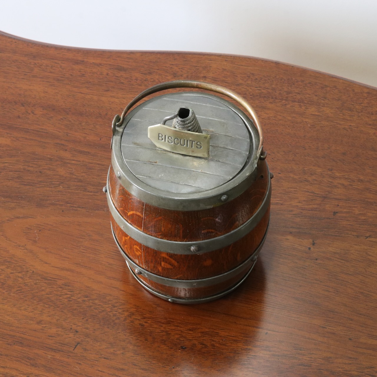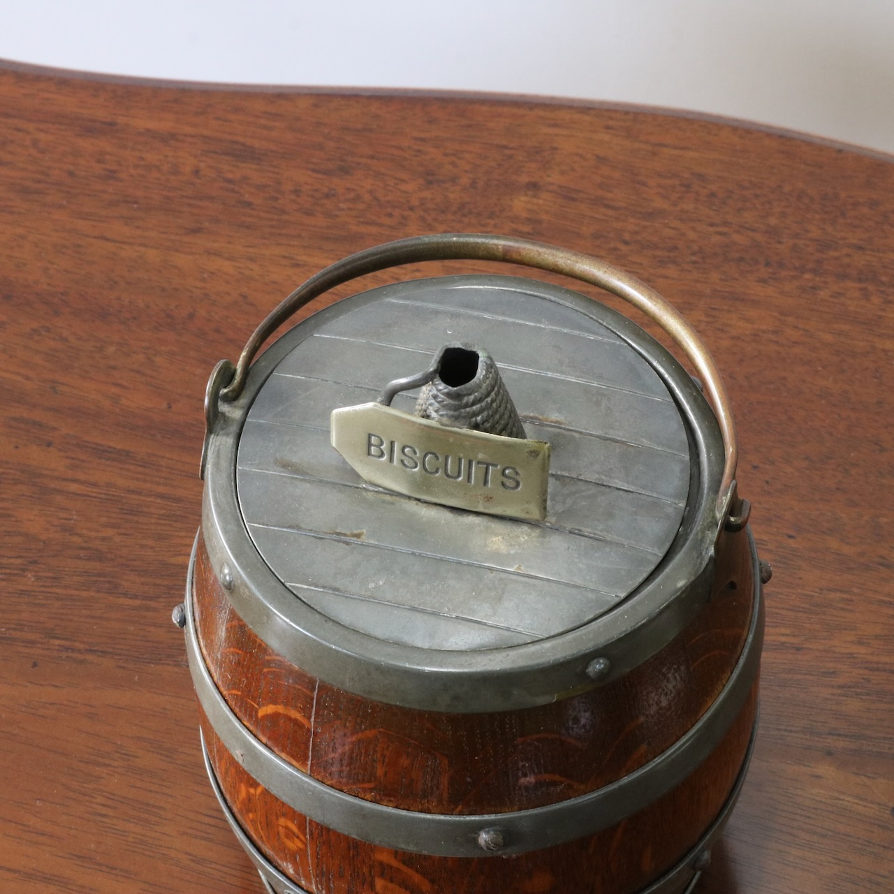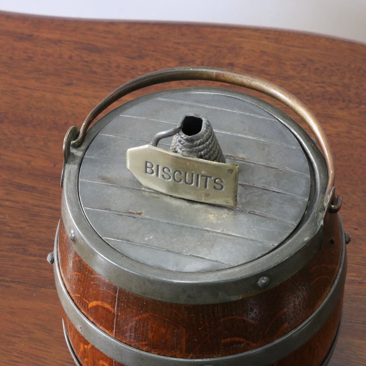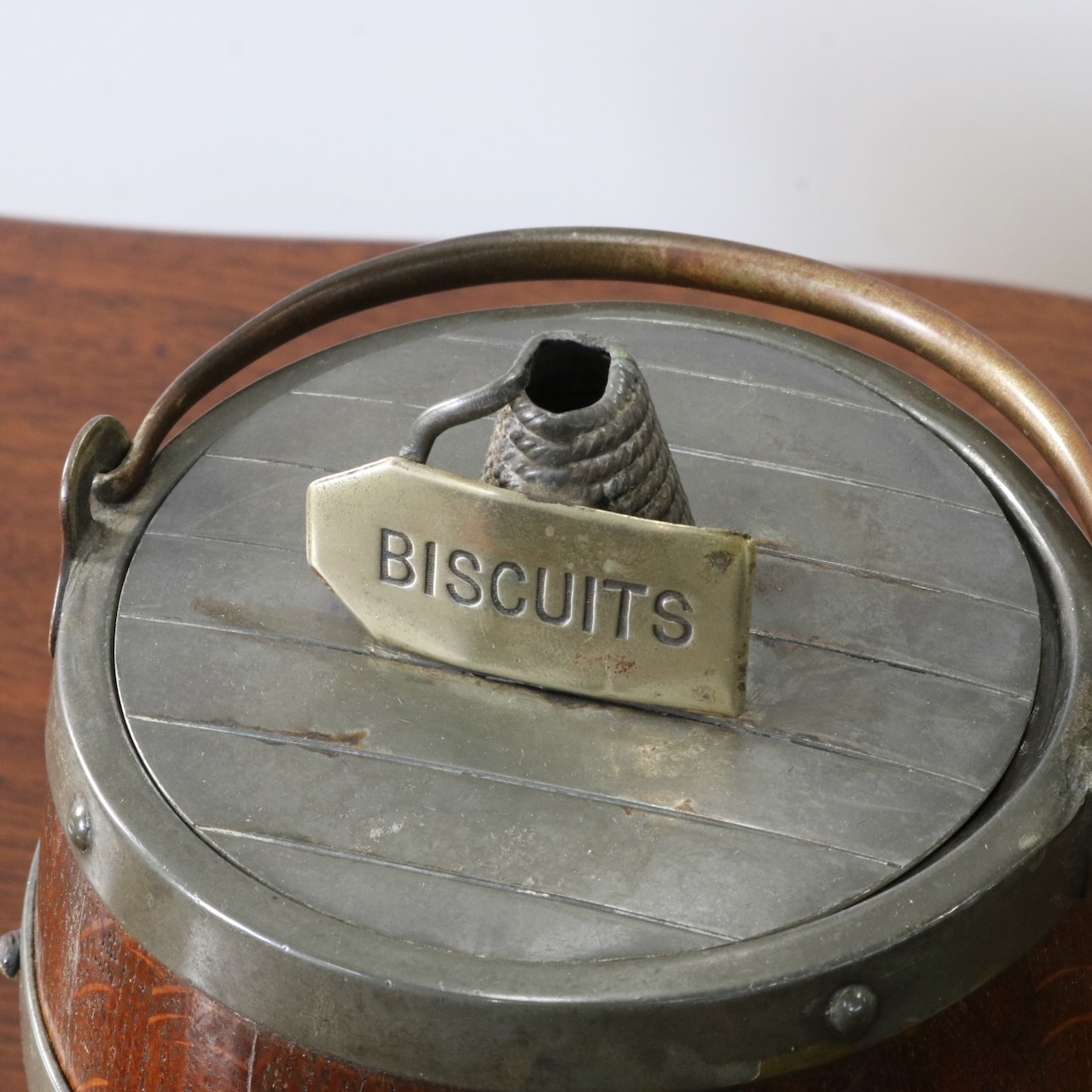 「BISCUITS」と書かれたピューターのフタがポイント。木と金属の組み合わせも良い雰囲気です。