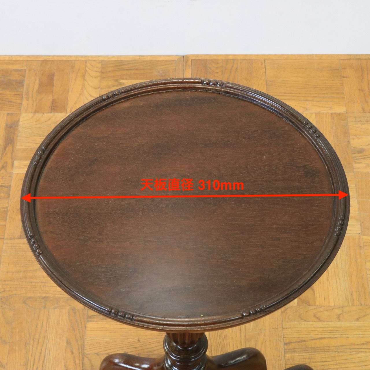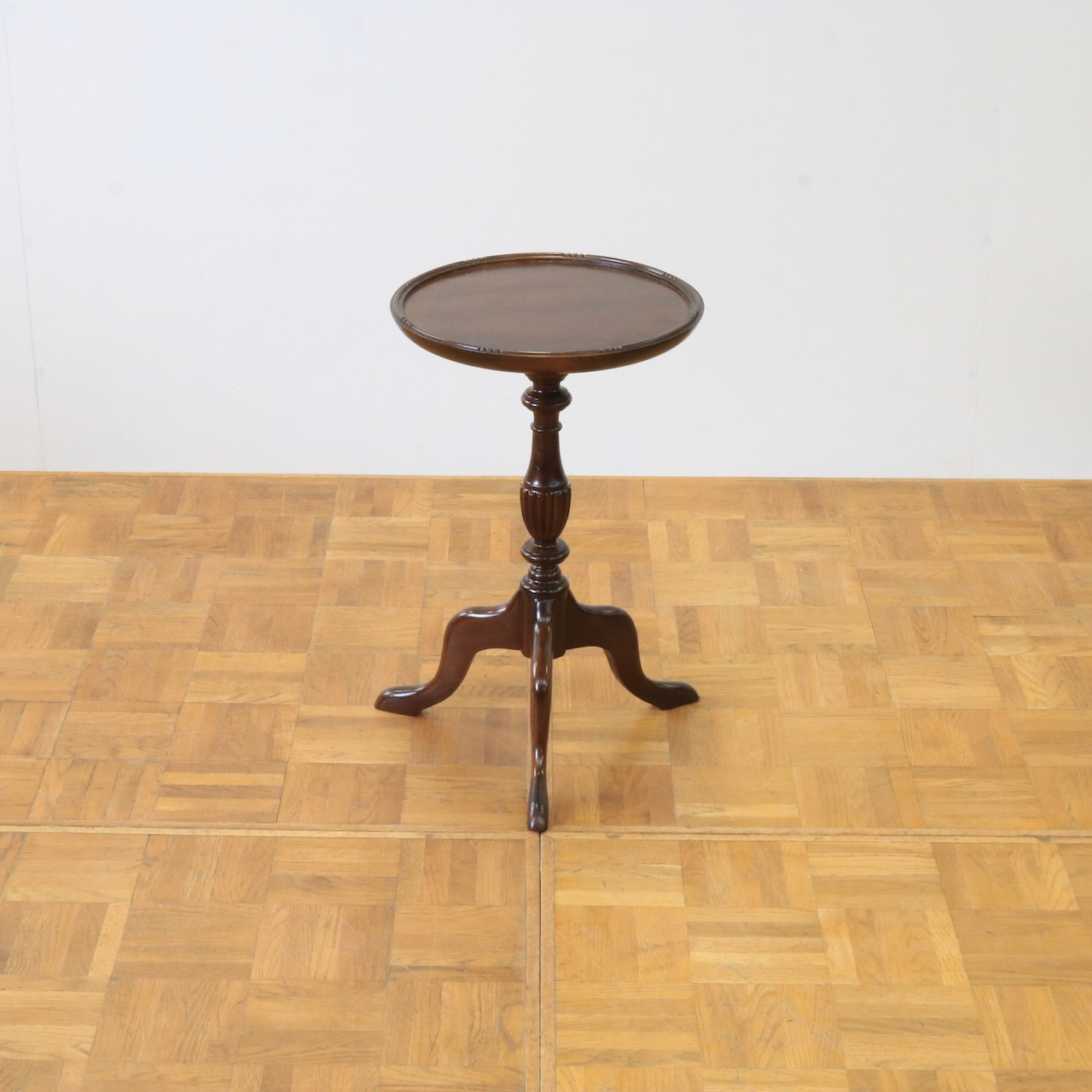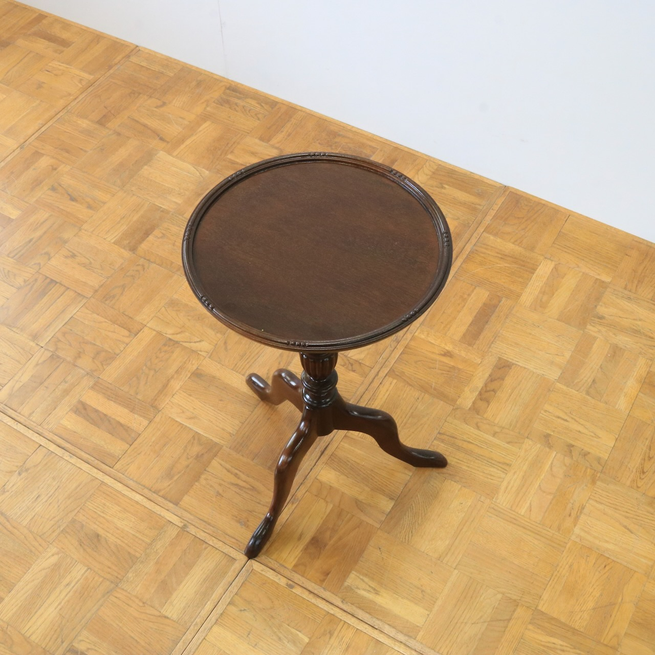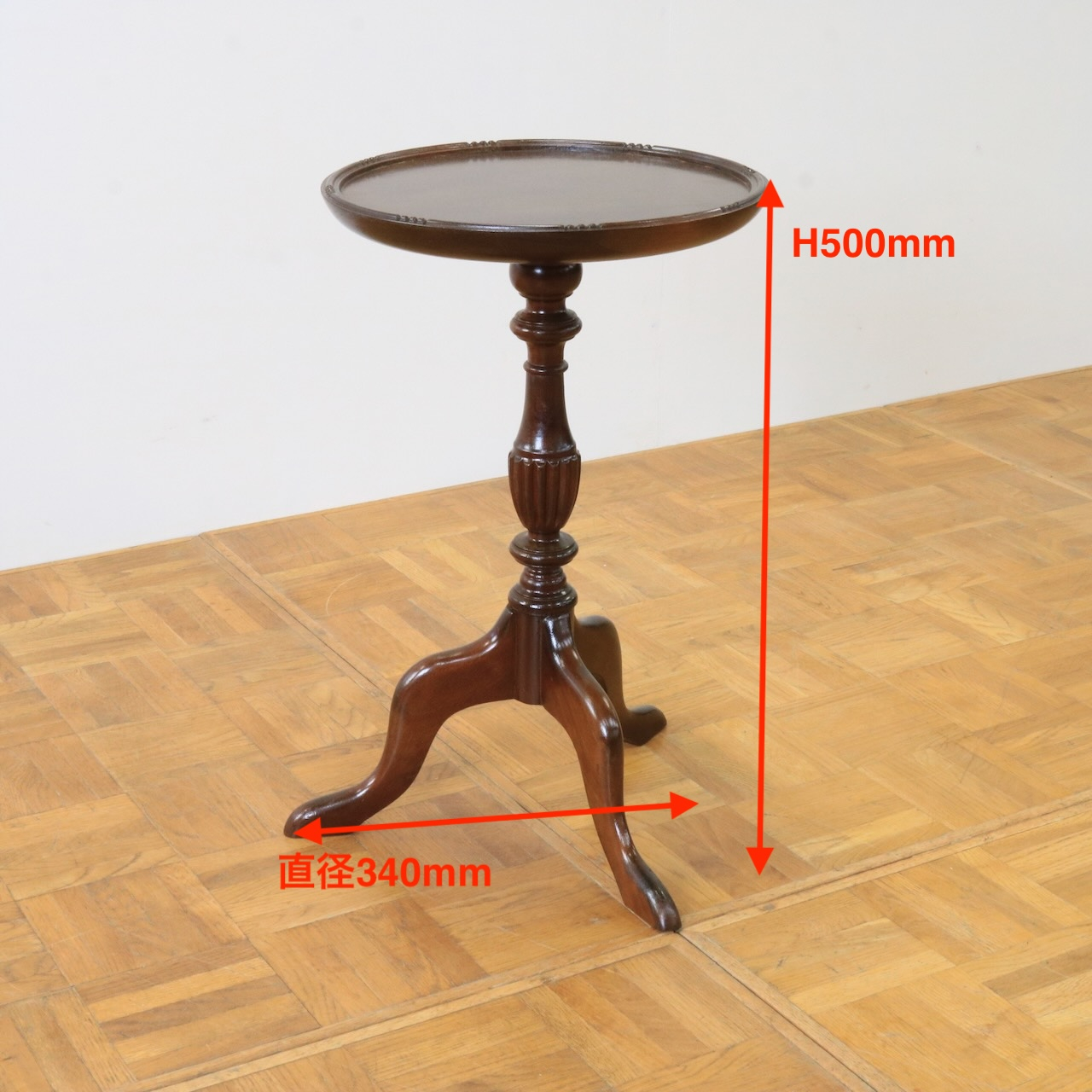 配送料の目安 ▶︎マホガニー材のワインテーブル。シンプルでどんなシーンにも合わせやすい小さなテーブルですが、天板の縁やトライポッドの脚の付け根のデザインに個性が光ります。