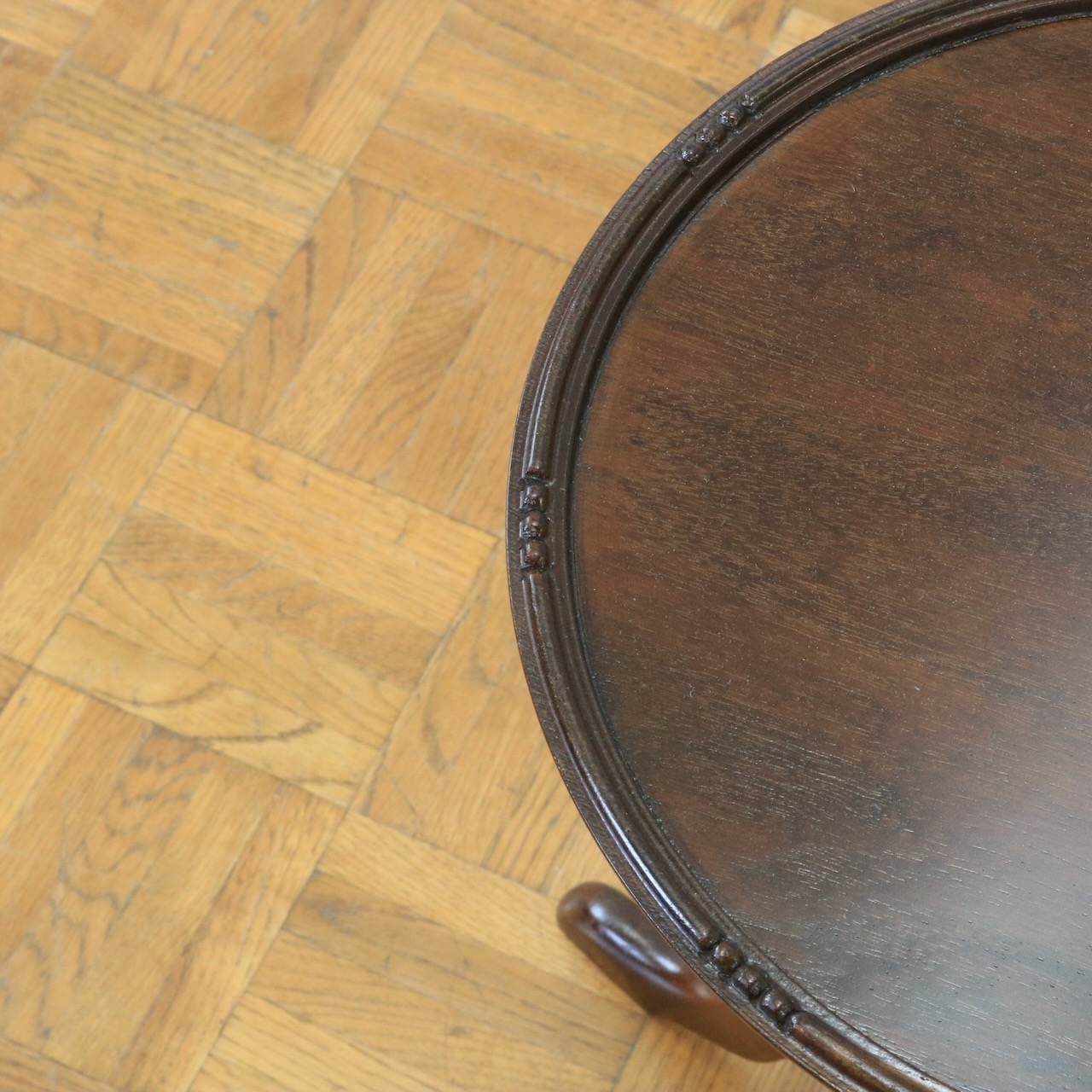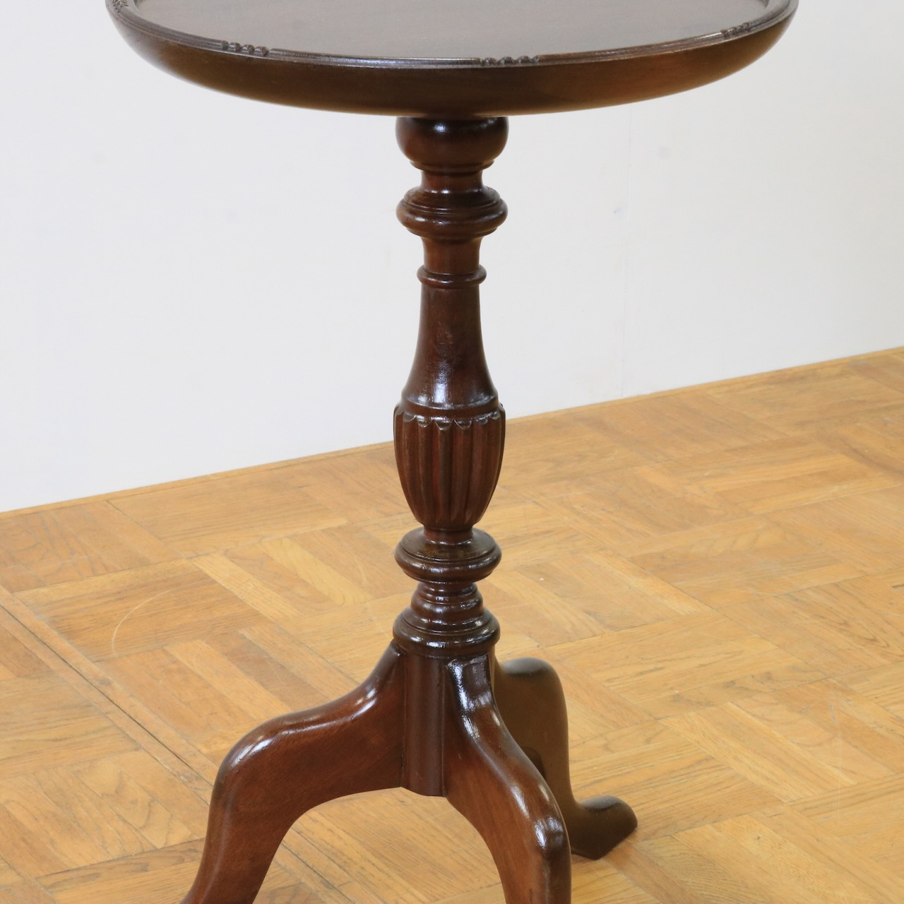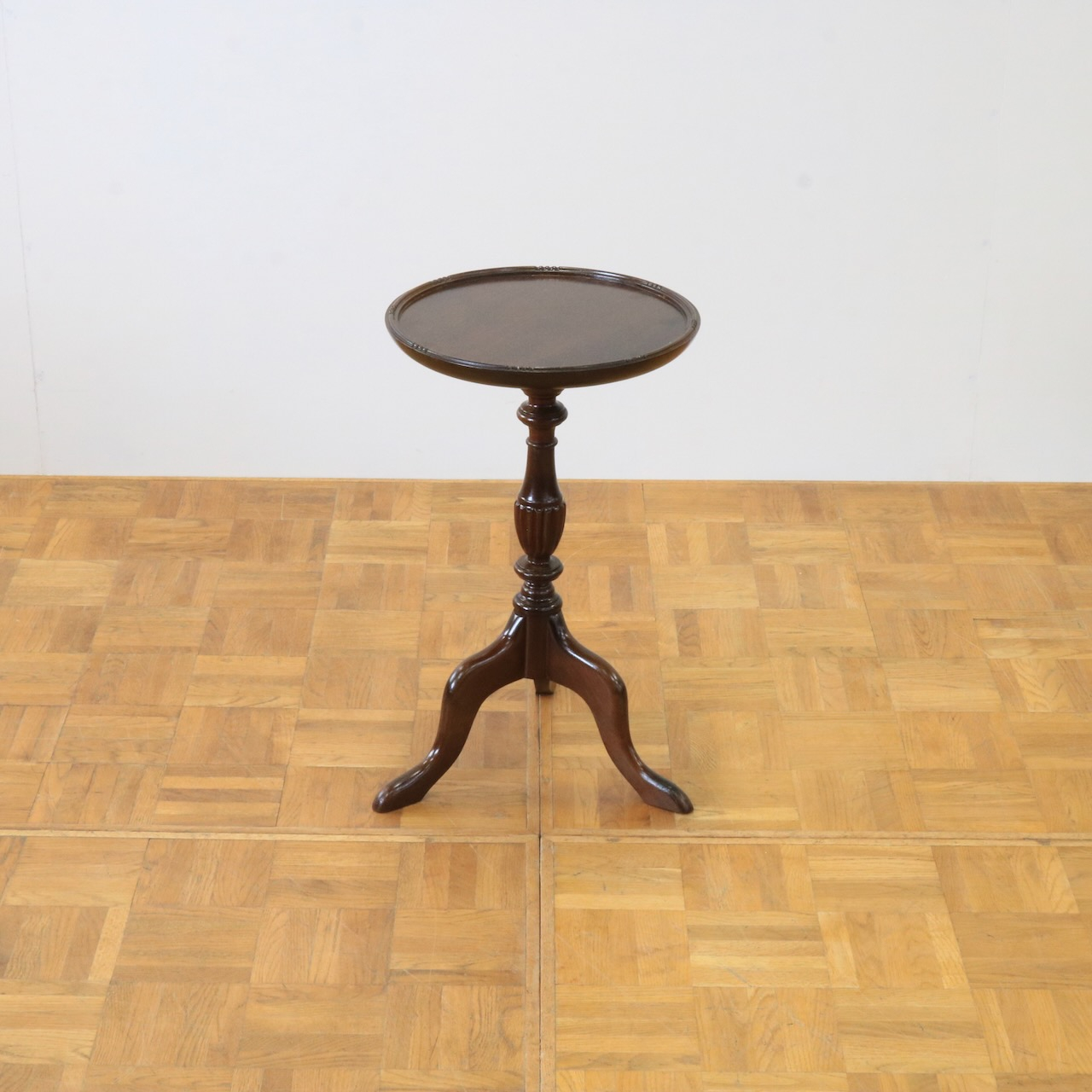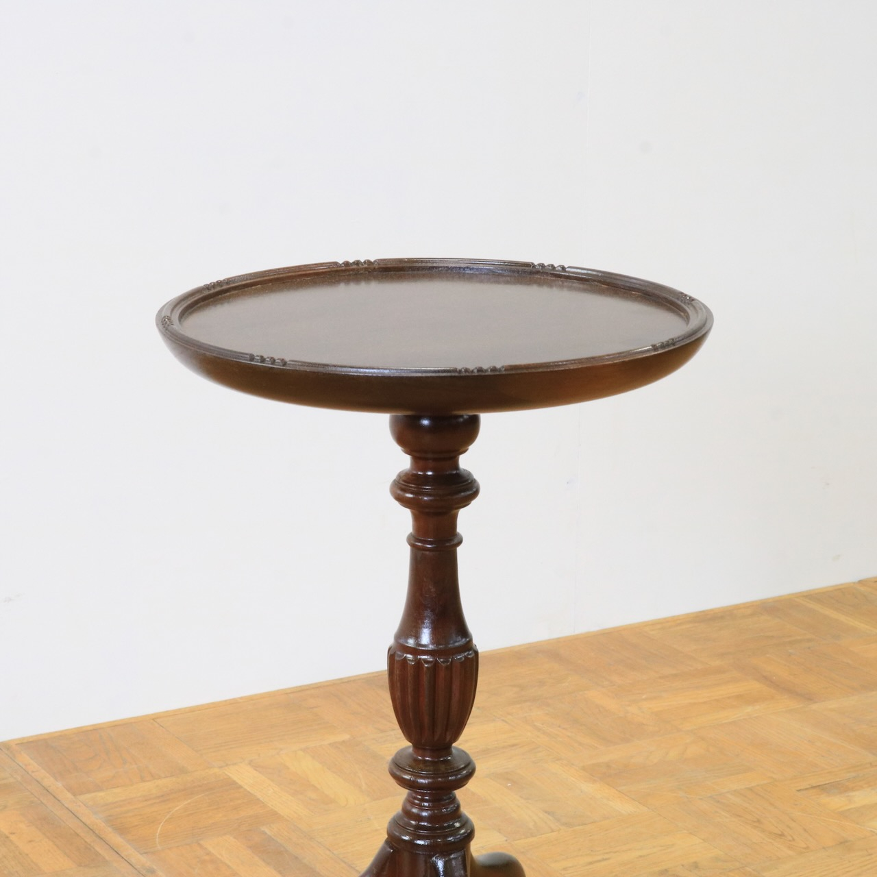 配送料の目安 ▶︎マホガニー材のワインテーブル。シンプルでどんなシーンにも合わせやすい小さなテーブルですが、天板の縁やトライポッドの脚の付け根のデザインに個性が光ります。