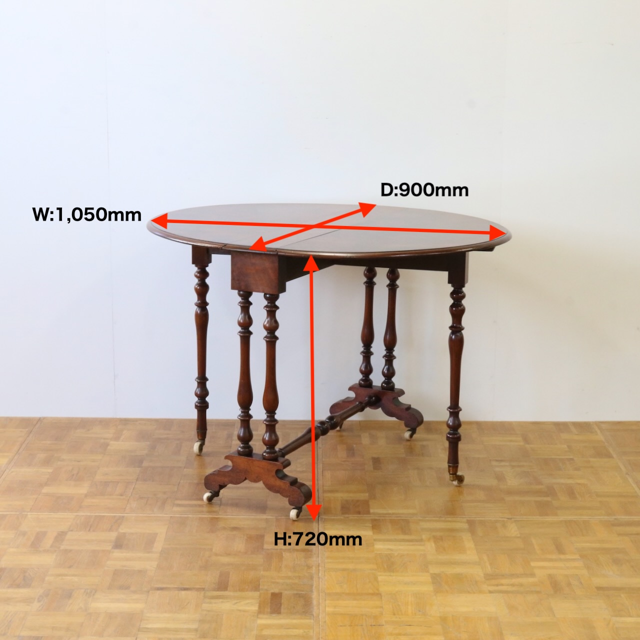 サザーランドという別名は、ヴィクトリアの女官長で、友人でもあったサザーランド公爵夫人が注文し、作らせたことがこのテーブルの名前の由来と言われています。折り畳むととても小さくなるテーブルで、コンパクトで場所をとらずに使えるため、朝食やお茶用のテーブルとして重宝されていました。今ではとても希少なアンティークアイテムとなっています。