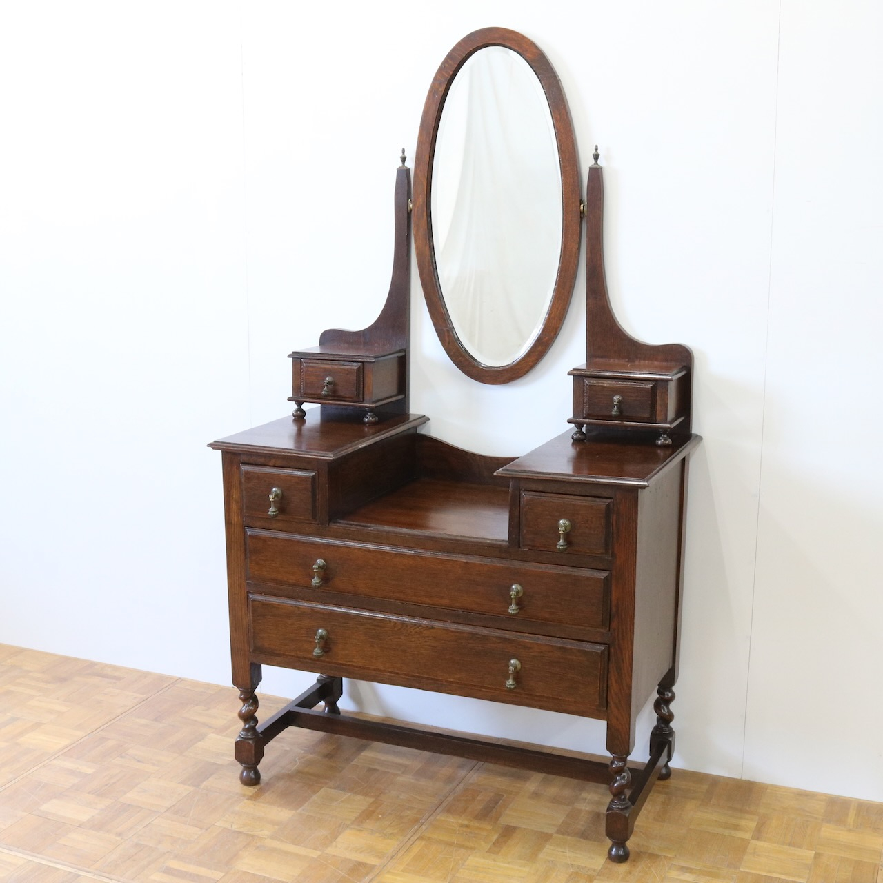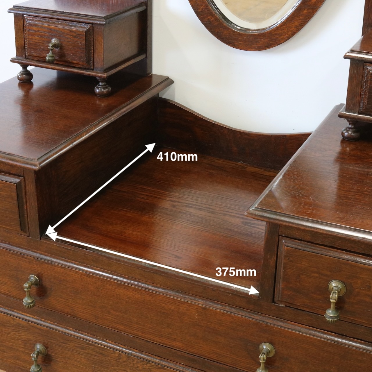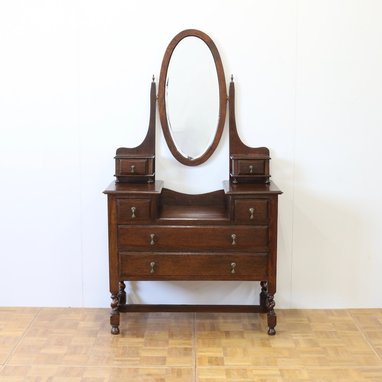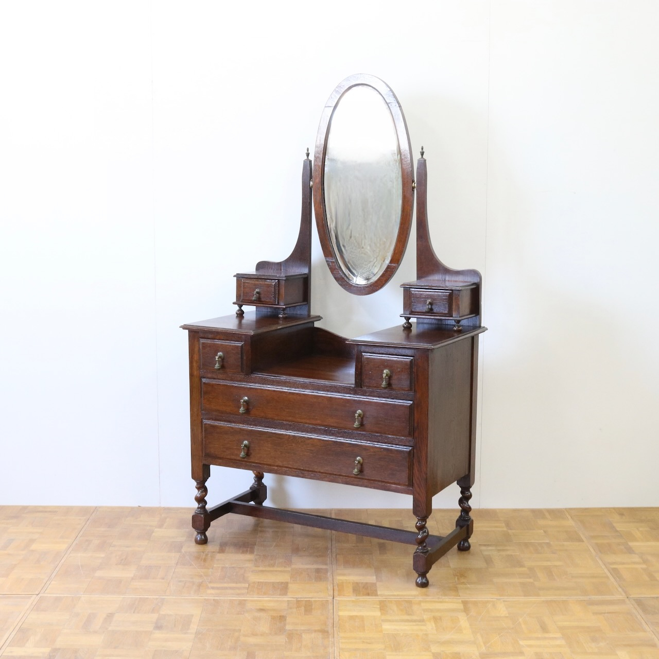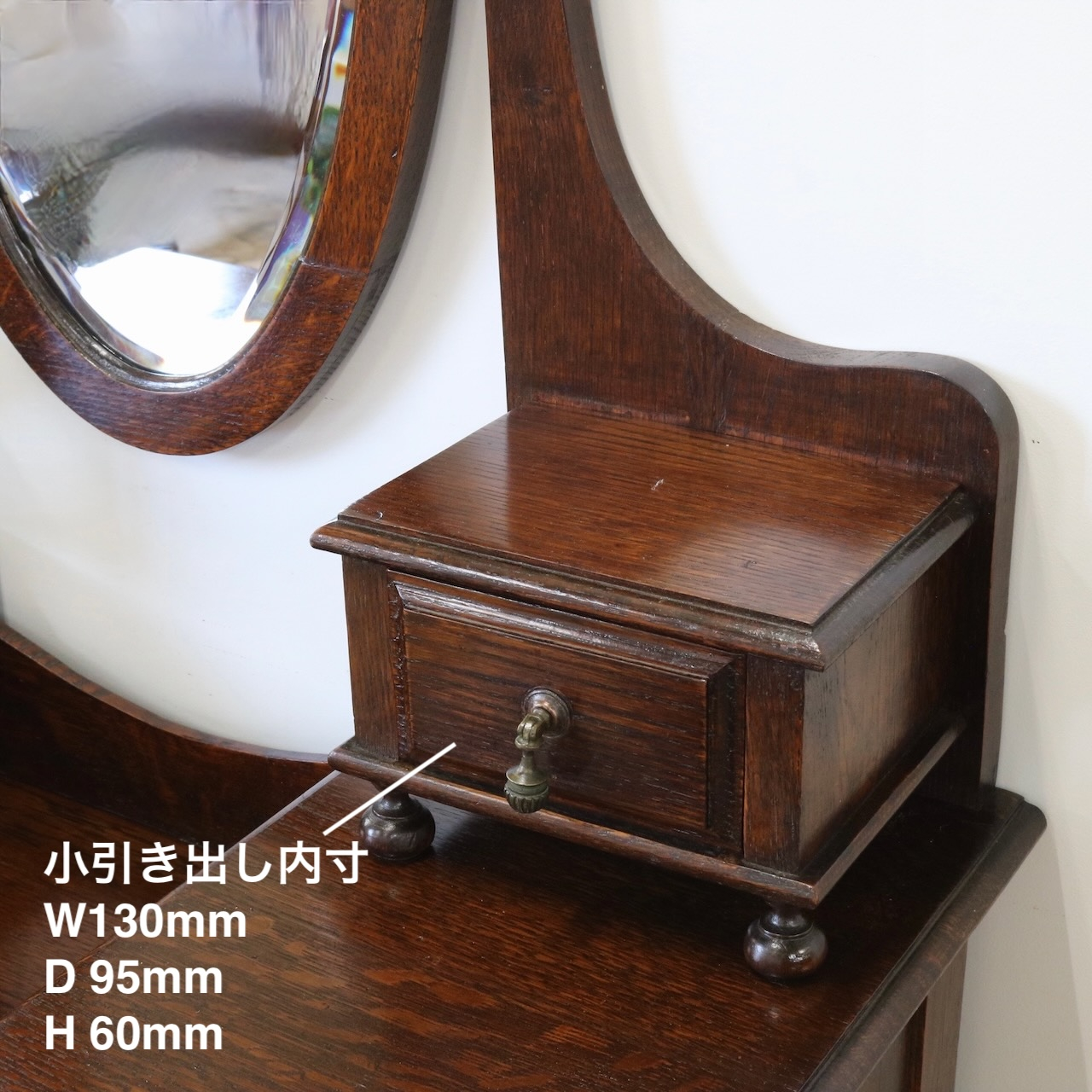 配送料の目安 ▶︎1930年代、オーク材のドレッシングチェスト。左右に分けられた収納と、楕円型のミラーが特徴的です。お化粧台としてだけでなく、収納力にも優れた便利な家具です。