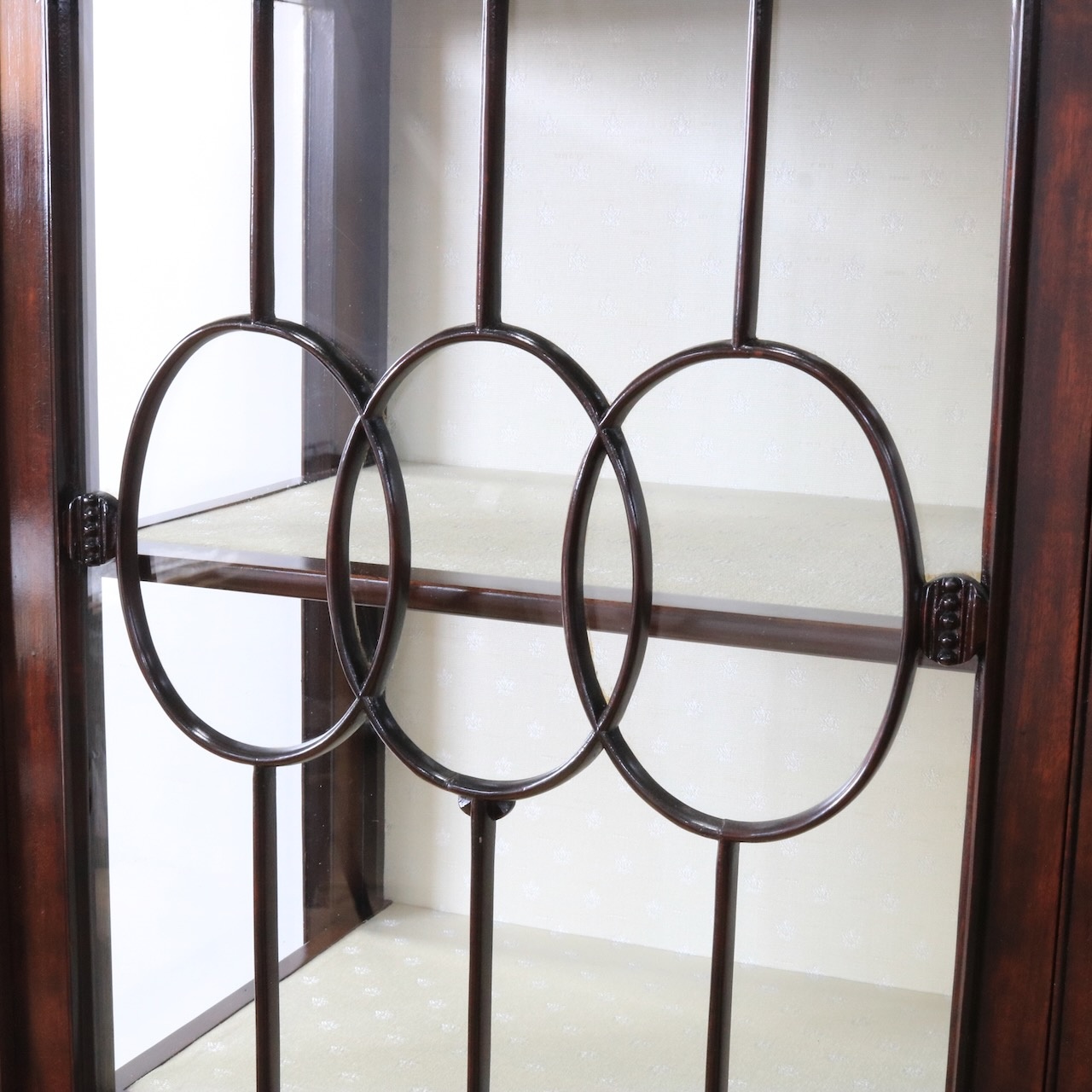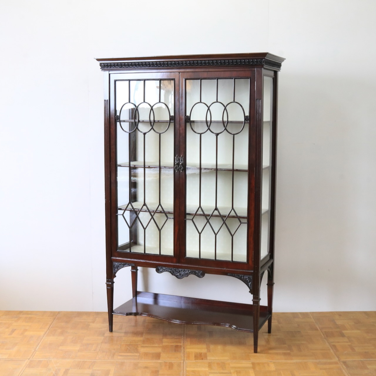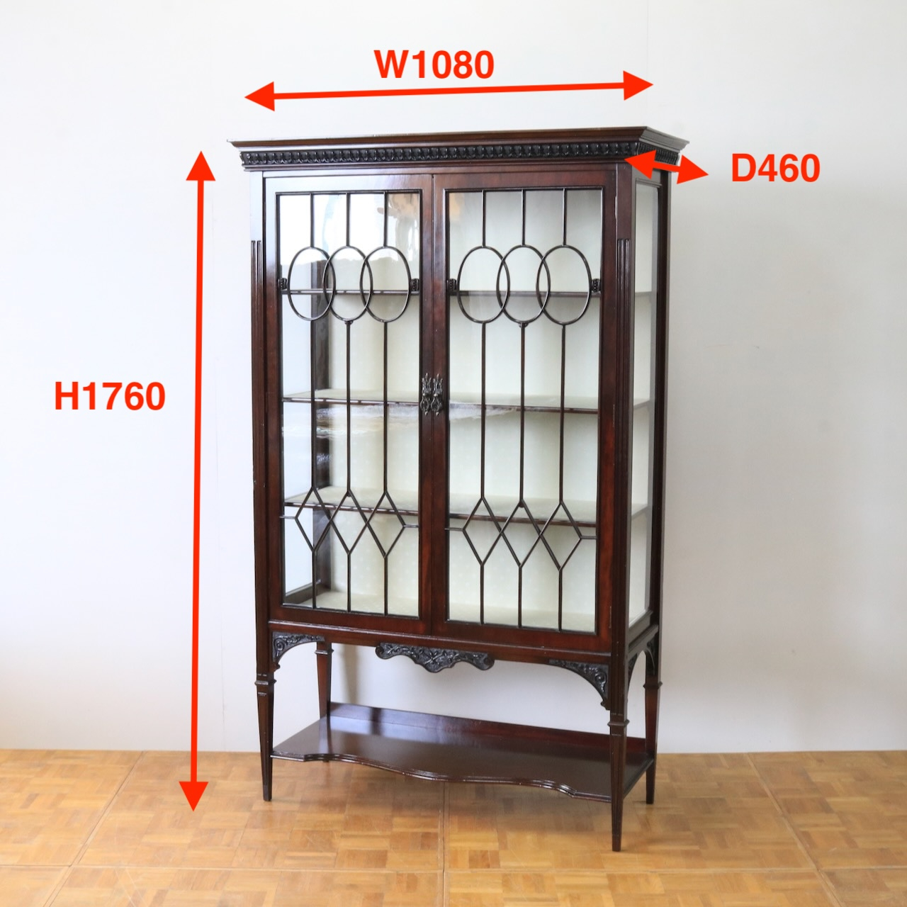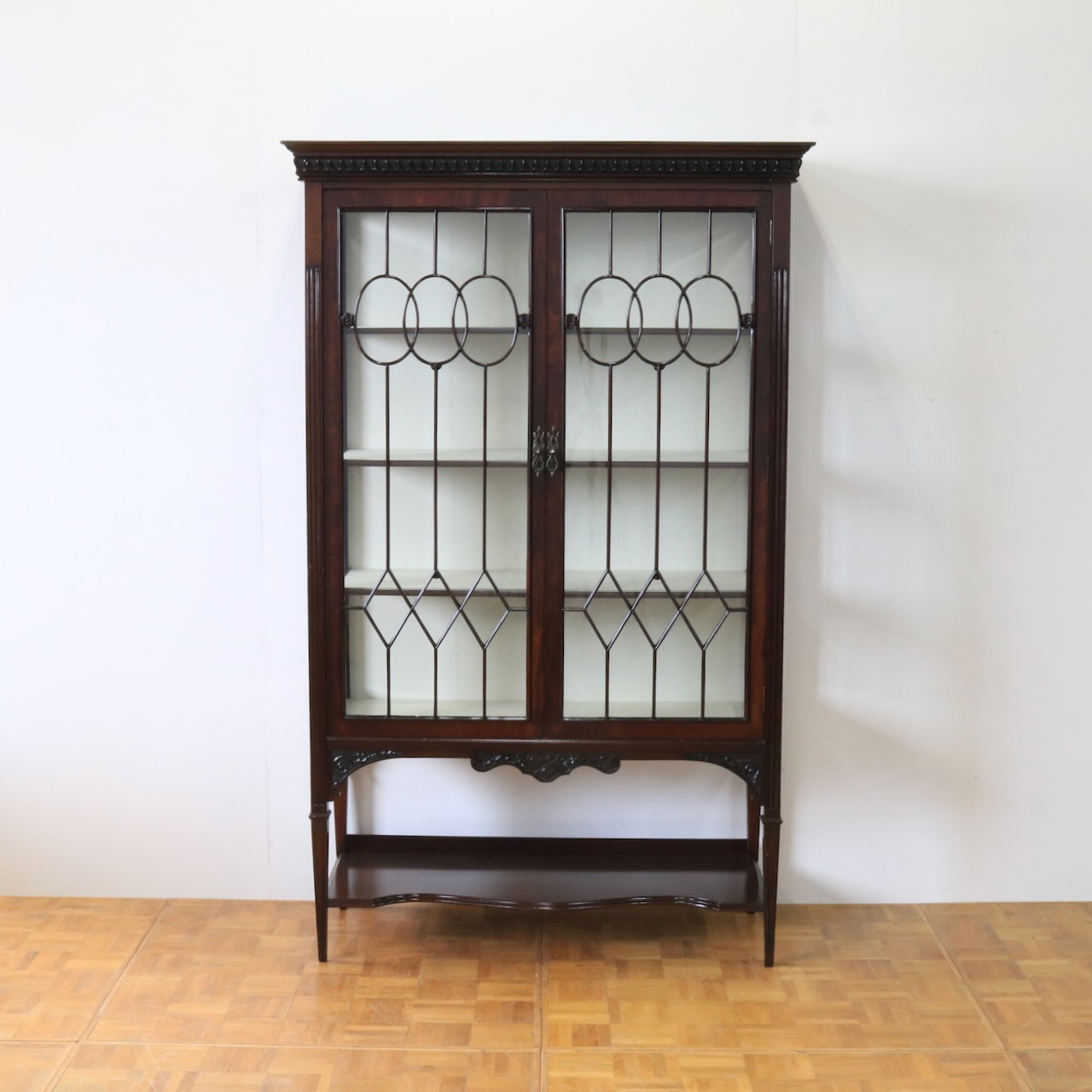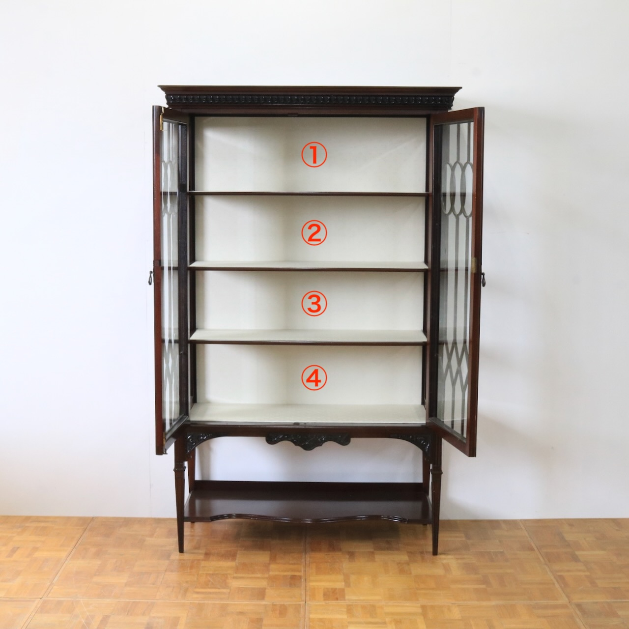 配送料の目安 ▶︎1920年代、マホガニーのグラスキャビネット。扉のオーバルとダイヤ柄を組み合わせた木の飾り縁がクラシックとモダンを融合させた素敵なデザインとなっています。4段で収納出来る内部も実用的なグラスキャビネットです。