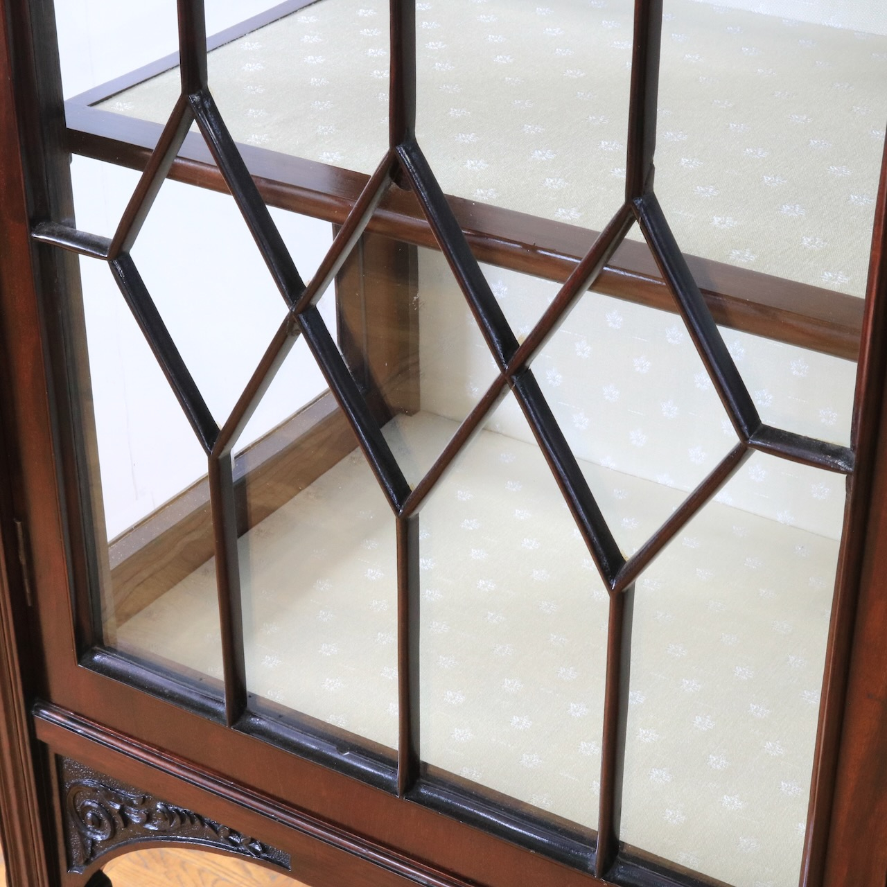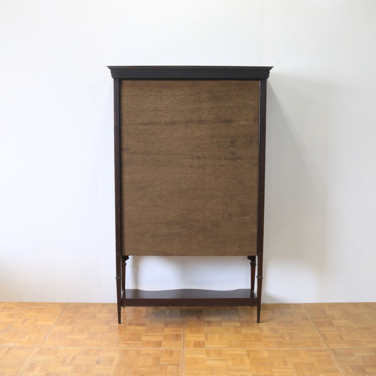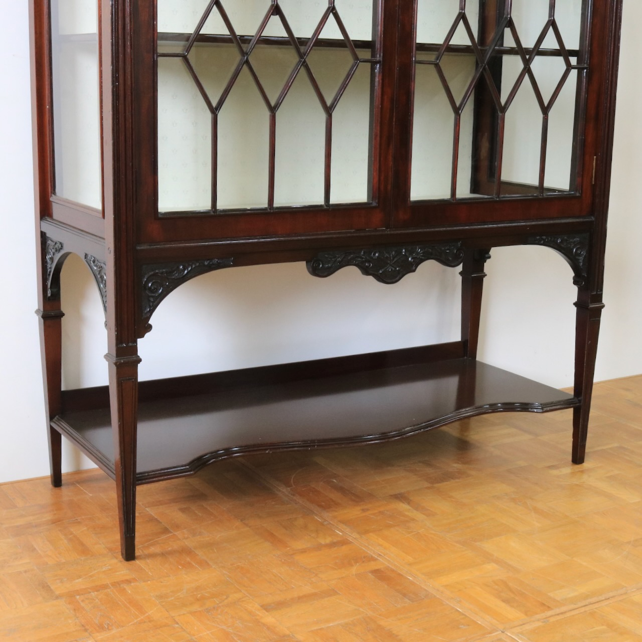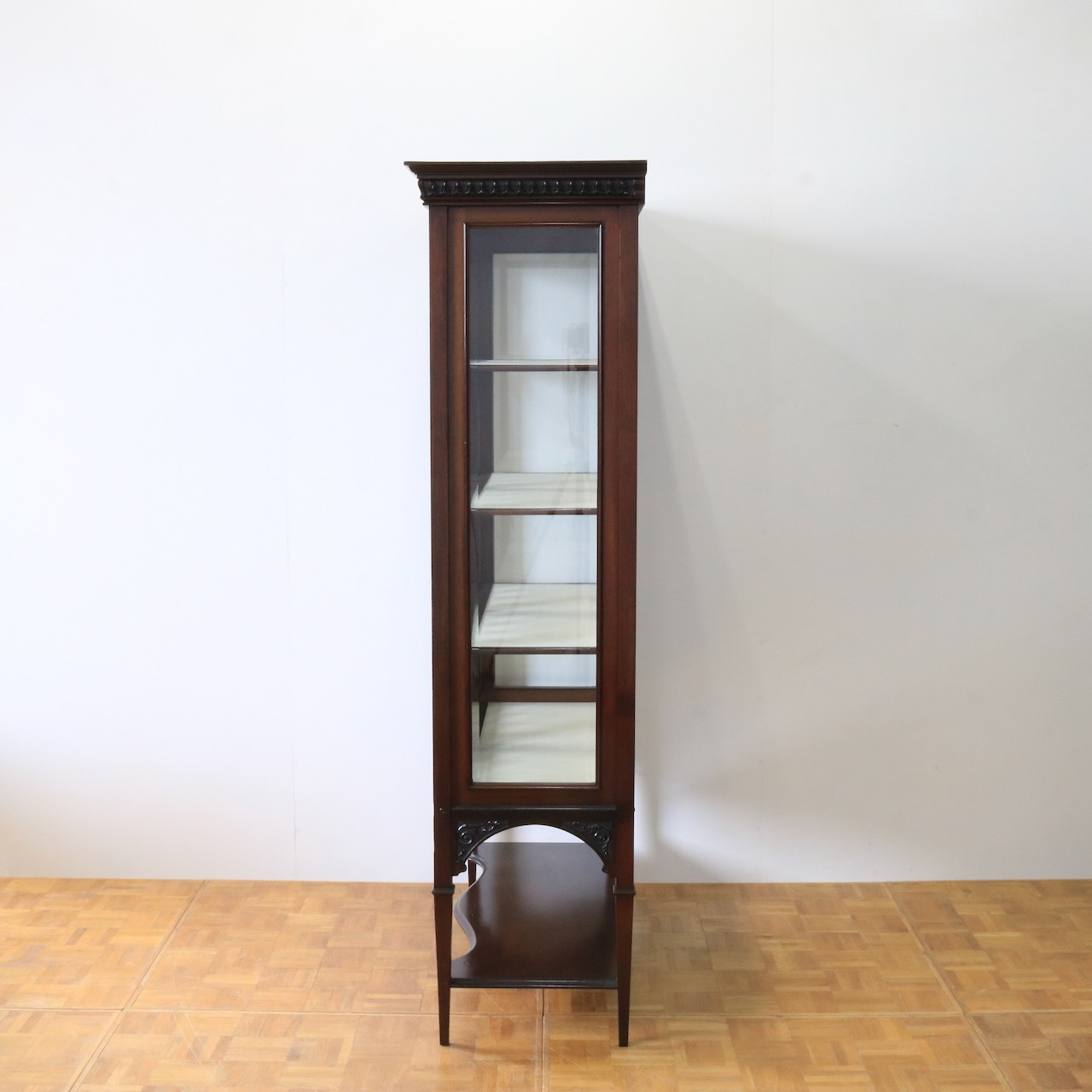 配送料の目安 ▶︎1920年代、マホガニーのグラスキャビネット。扉のオーバルとダイヤ柄を組み合わせた木の飾り縁がクラシックとモダンを融合させた素敵なデザインとなっています。4段で収納出来る内部も実用的なグラスキャビネットです。