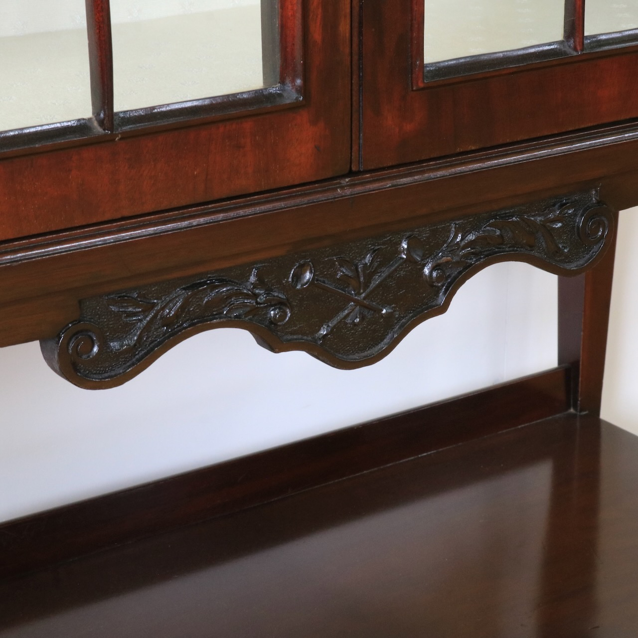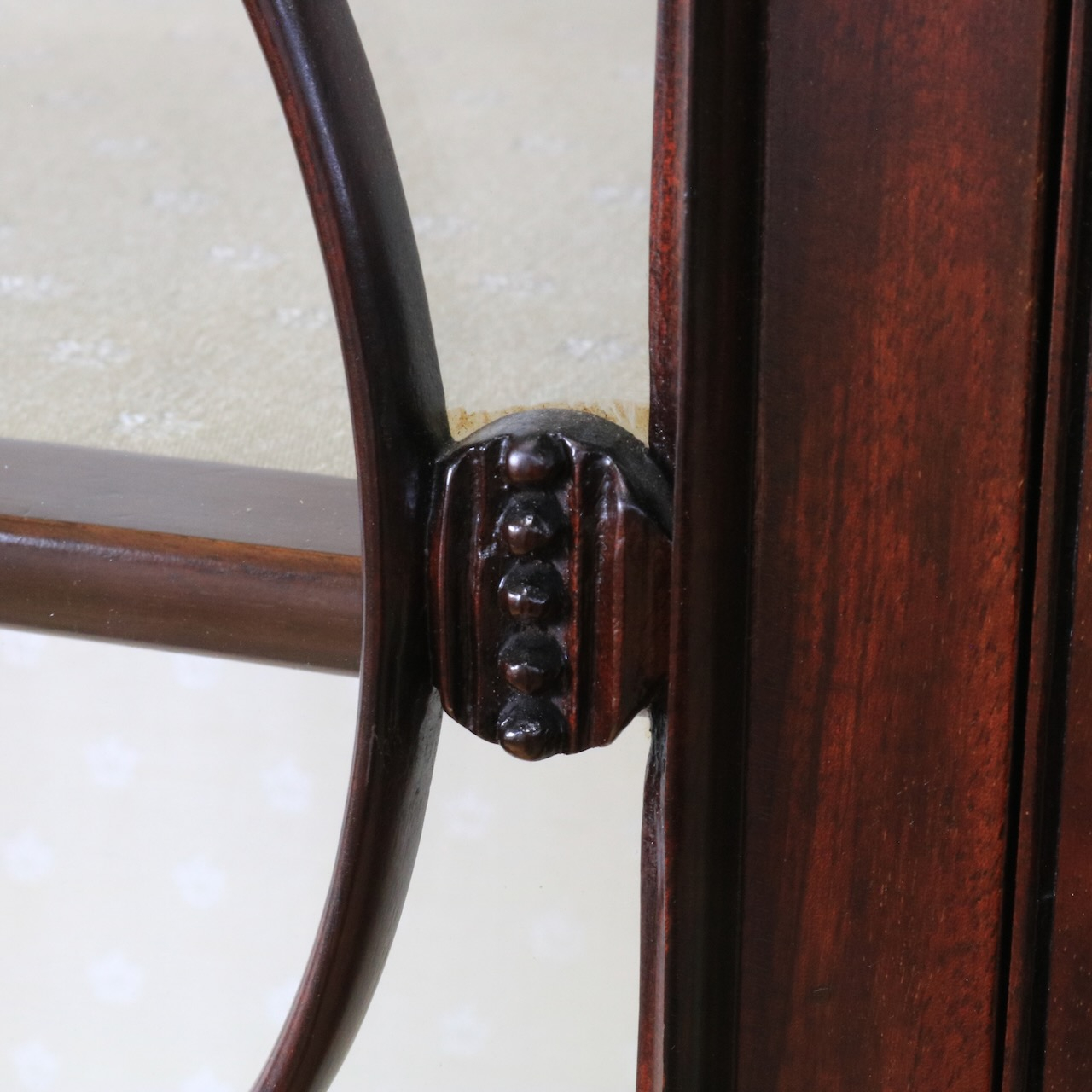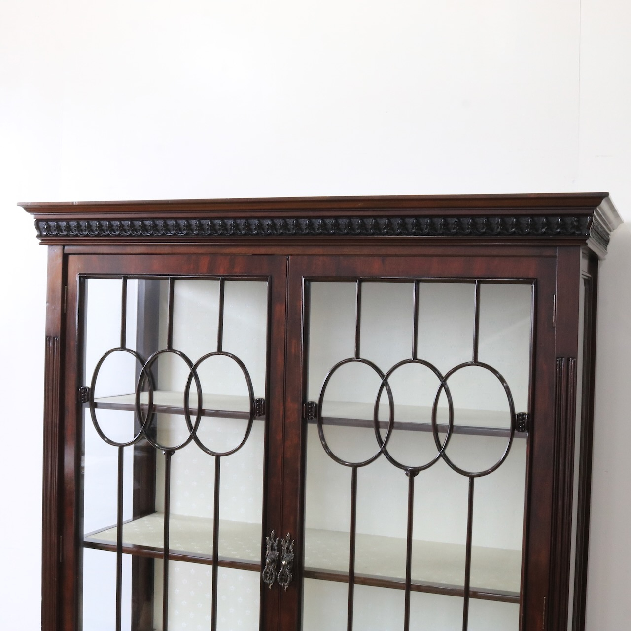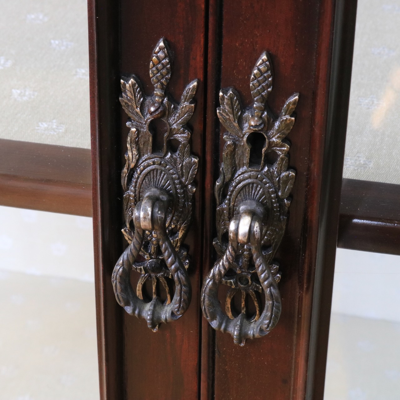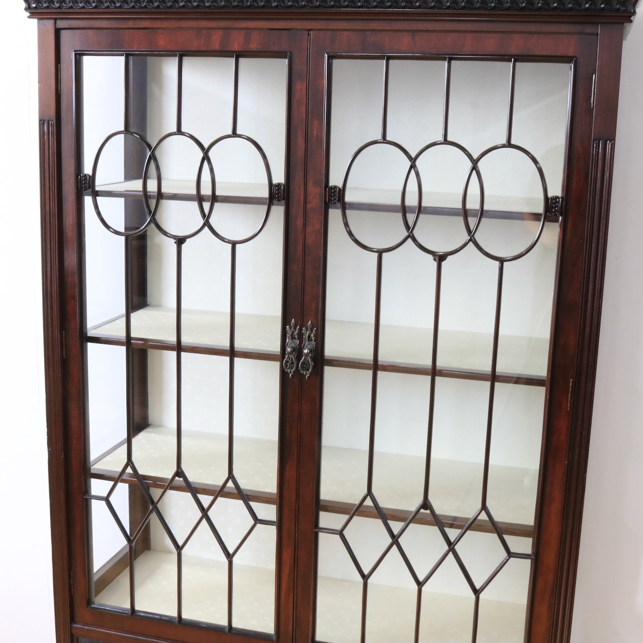 配送料の目安 ▶︎1920年代、マホガニーのグラスキャビネット。扉のオーバルとダイヤ柄を組み合わせた木の飾り縁がクラシックとモダンを融合させた素敵なデザインとなっています。4段で収納出来る内部も実用的なグラスキャビネットです。