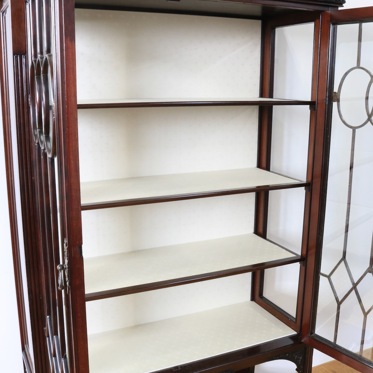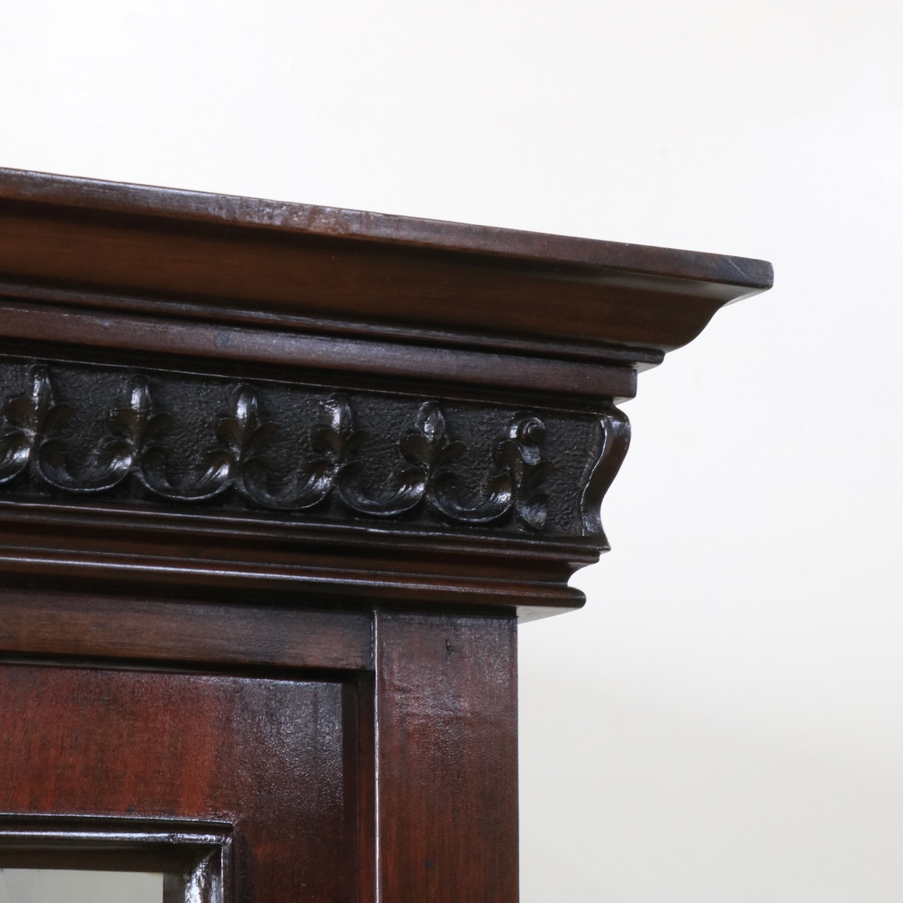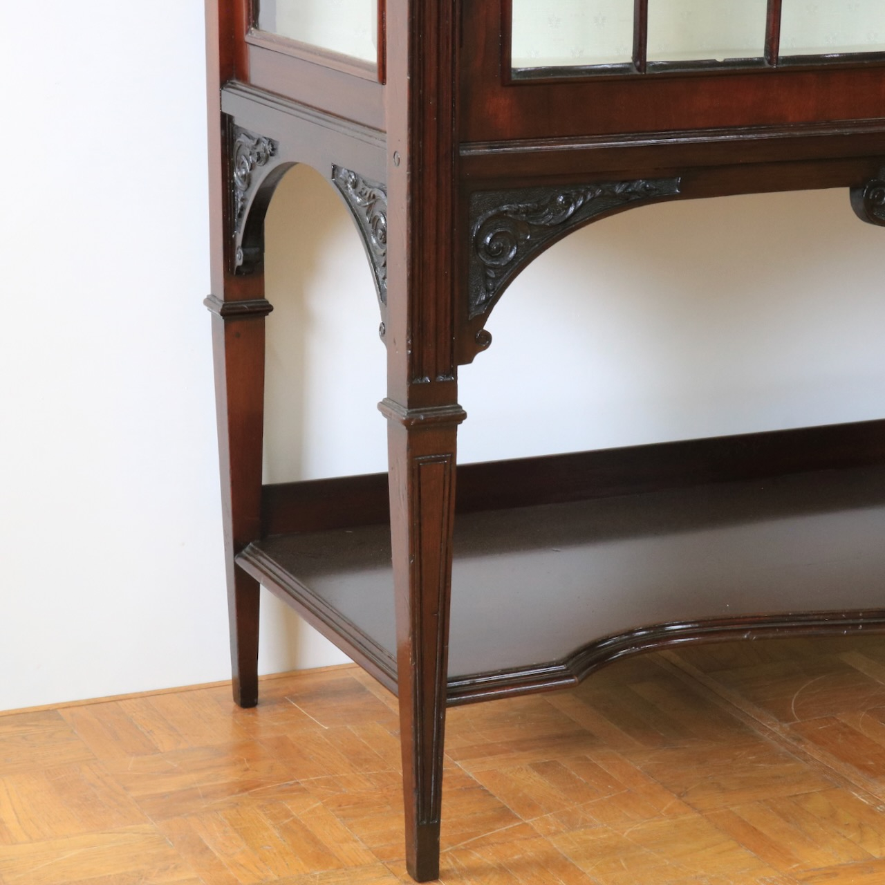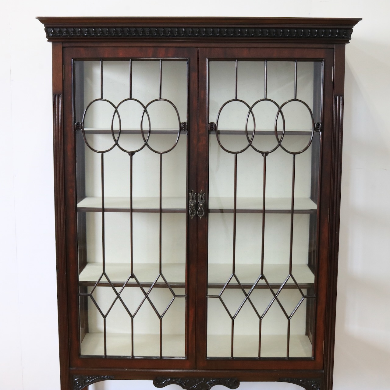 配送料の目安 ▶︎1920年代、マホガニーのグラスキャビネット。扉のオーバルとダイヤ柄を組み合わせた木の飾り縁がクラシックとモダンを融合させた素敵なデザインとなっています。4段で収納出来る内部も実用的なグラスキャビネットです。