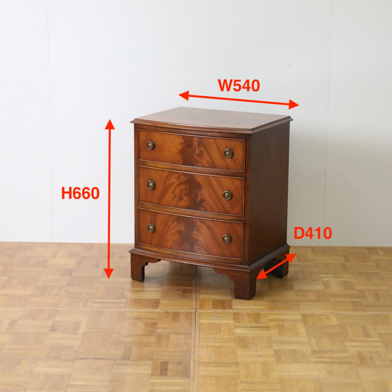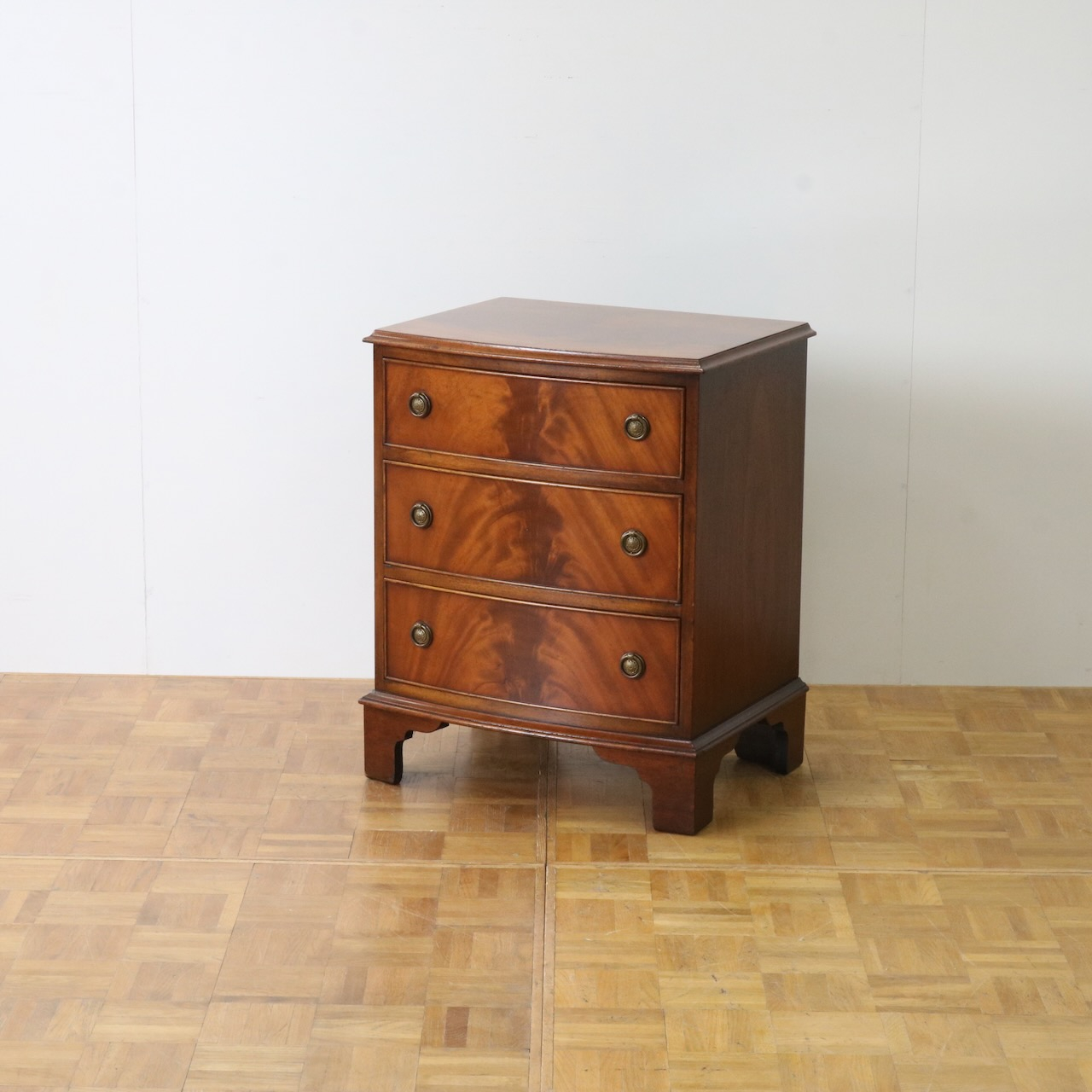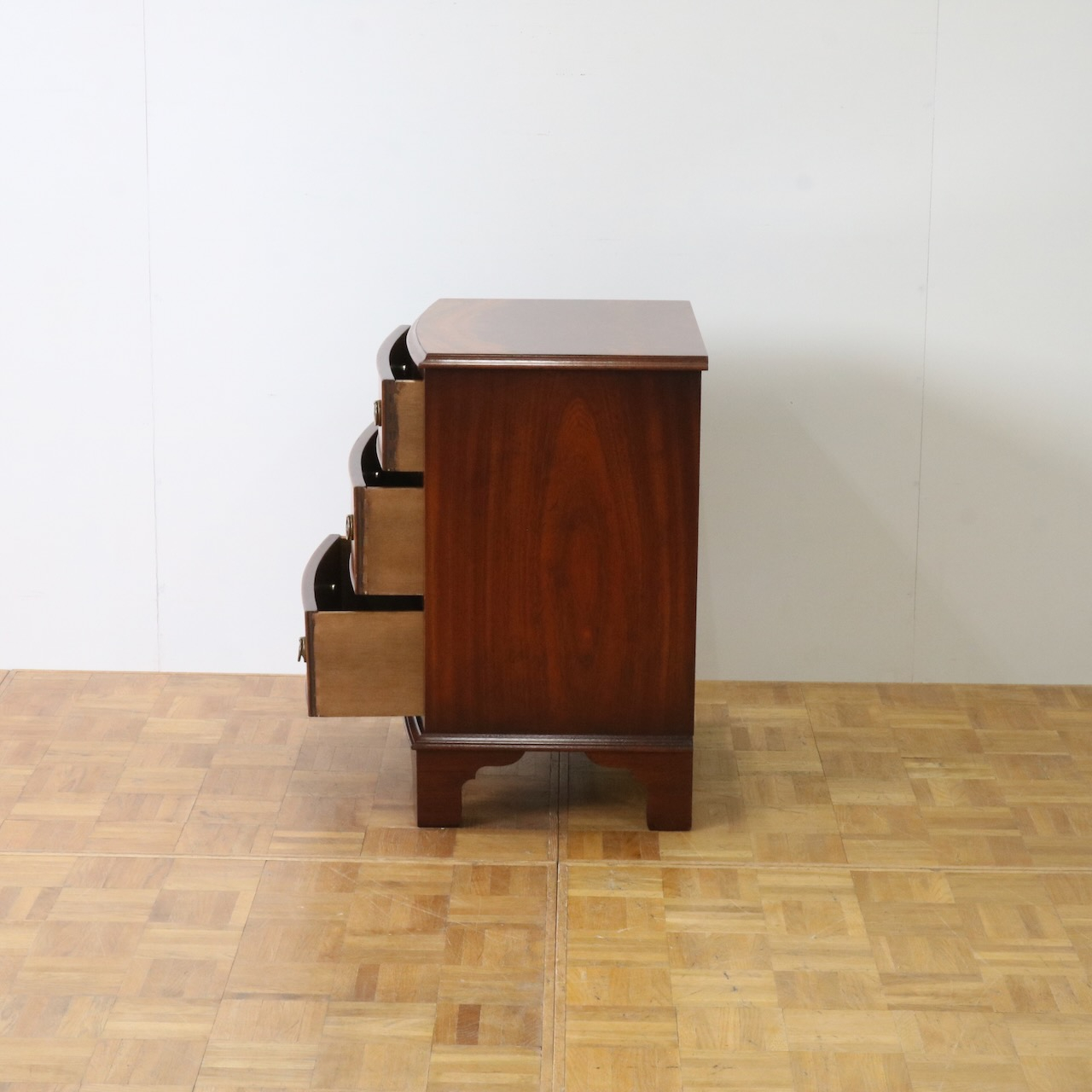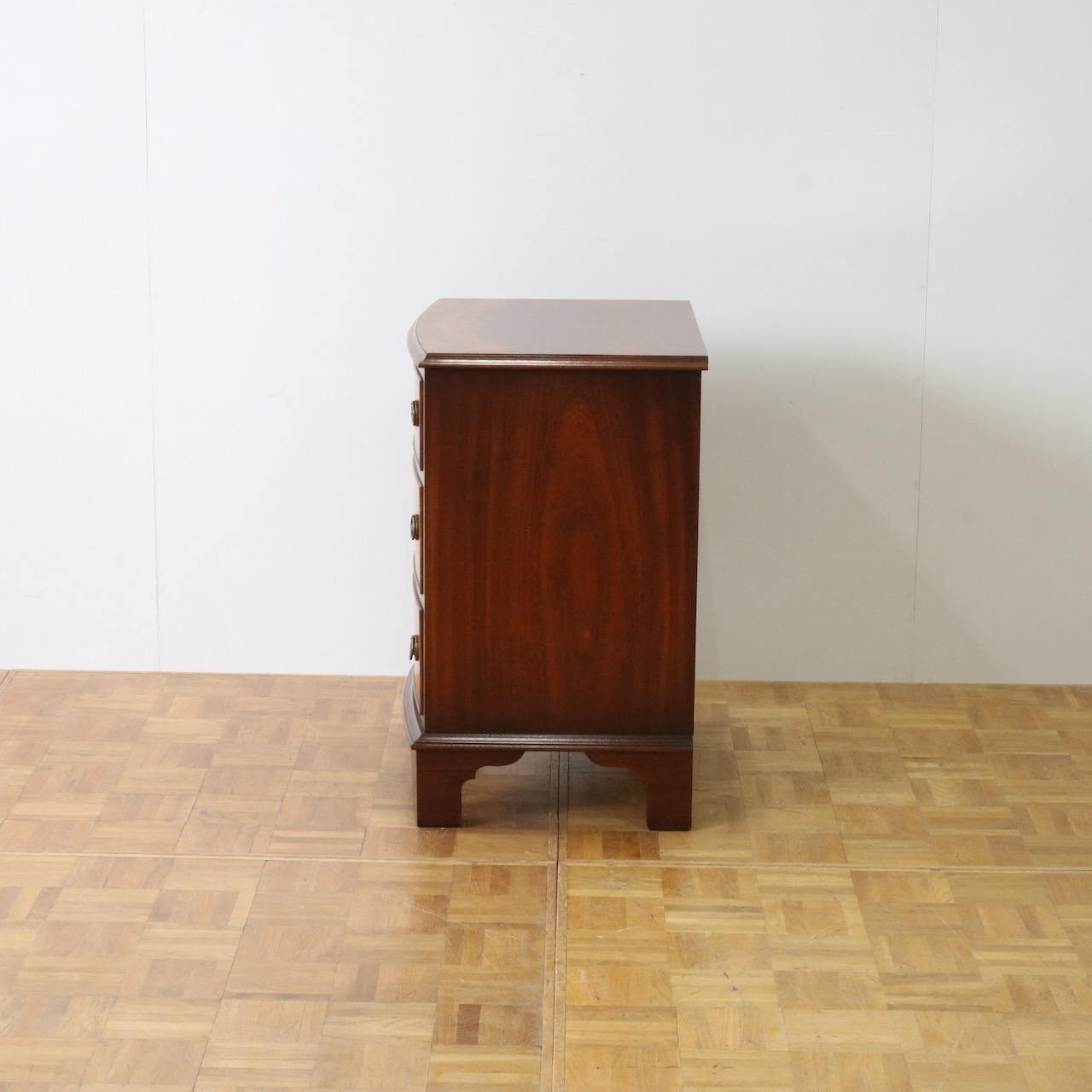 小ぶりなマホガニーのチェスト。緩やかに弧を描くトップや金具の装飾など、