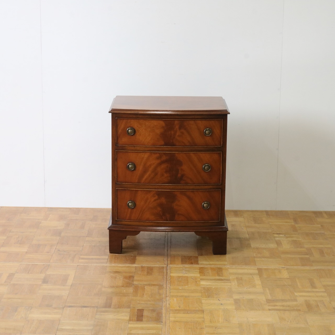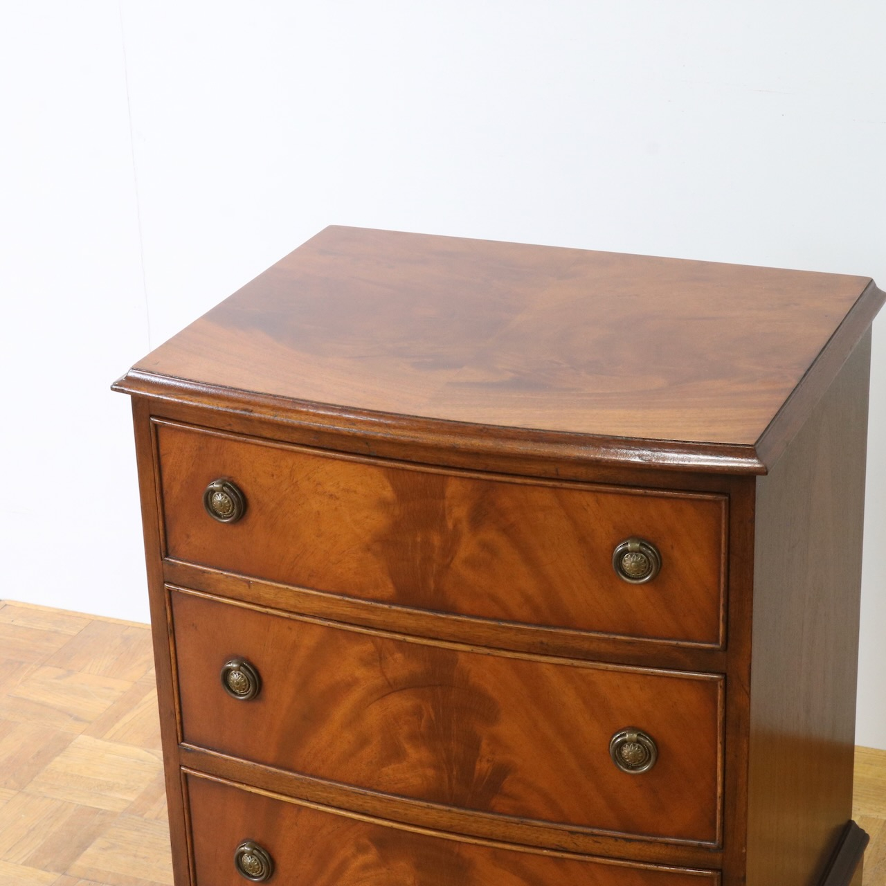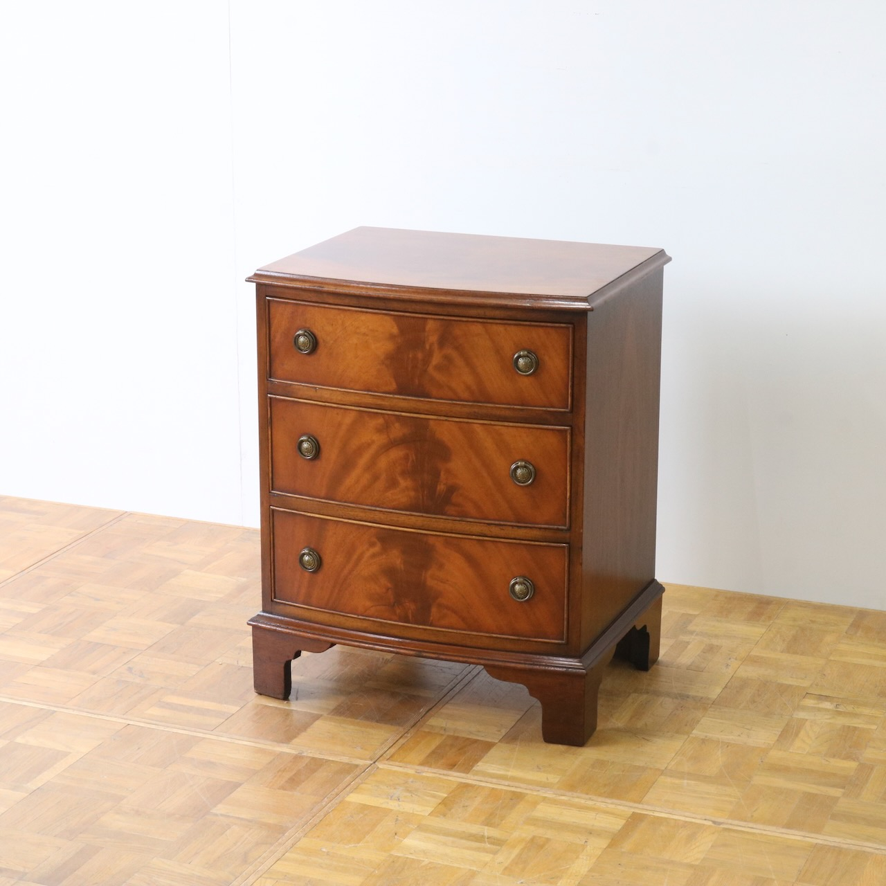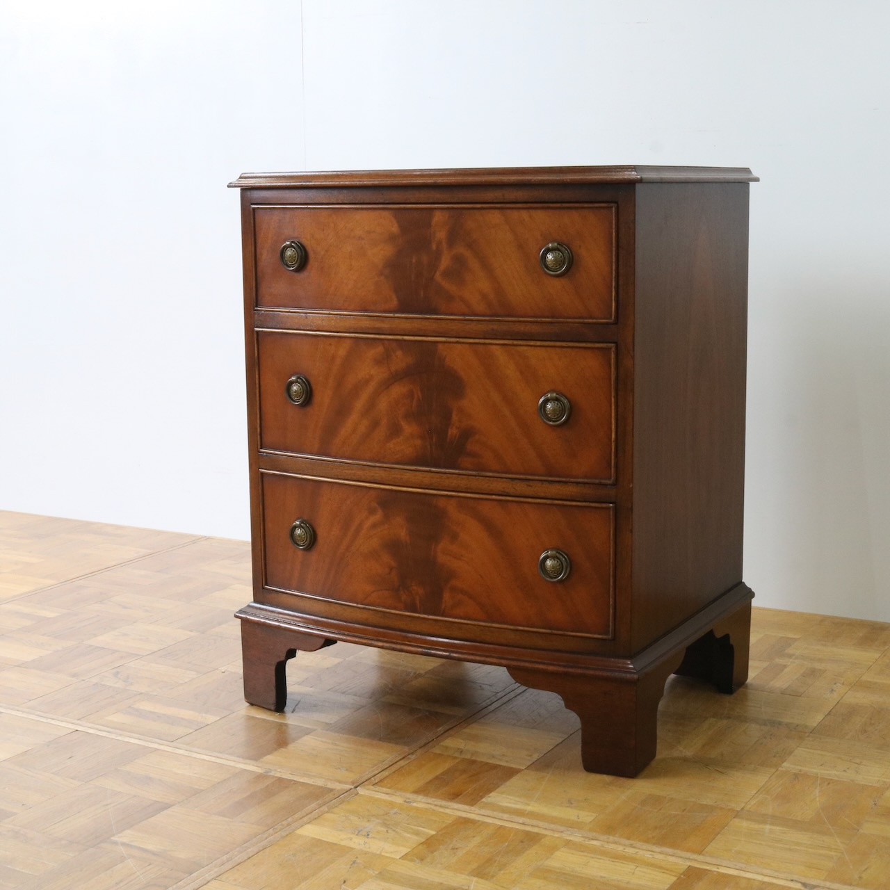 小ぶりなマホガニーのチェスト。緩やかに弧を描くトップや金具の装飾など、