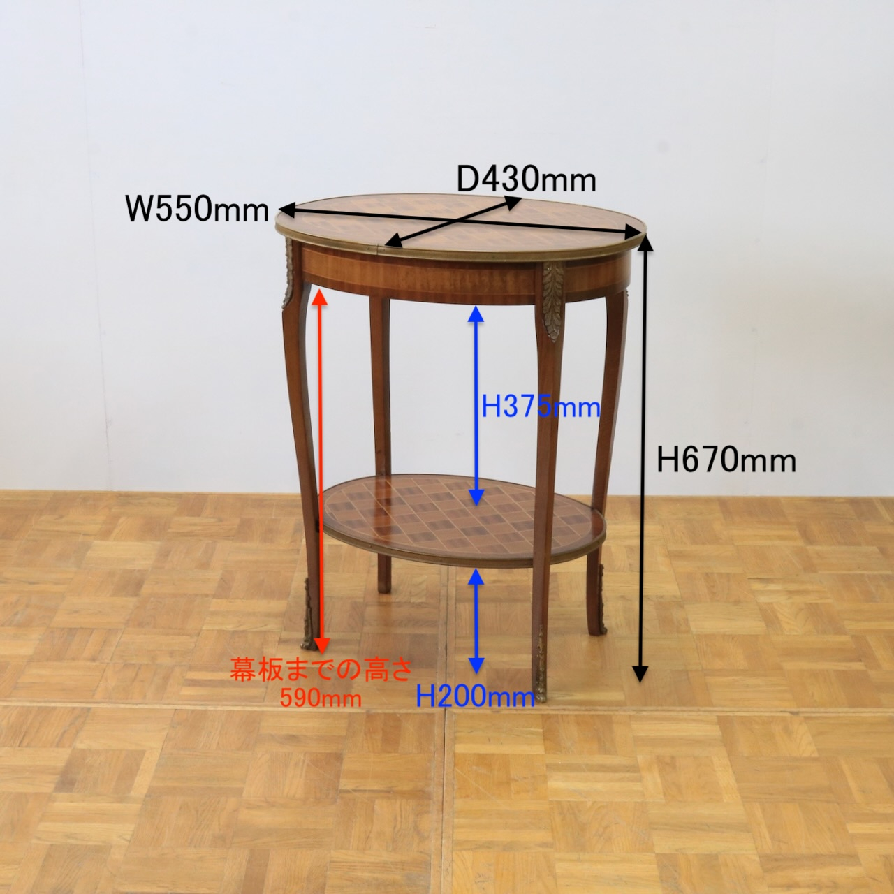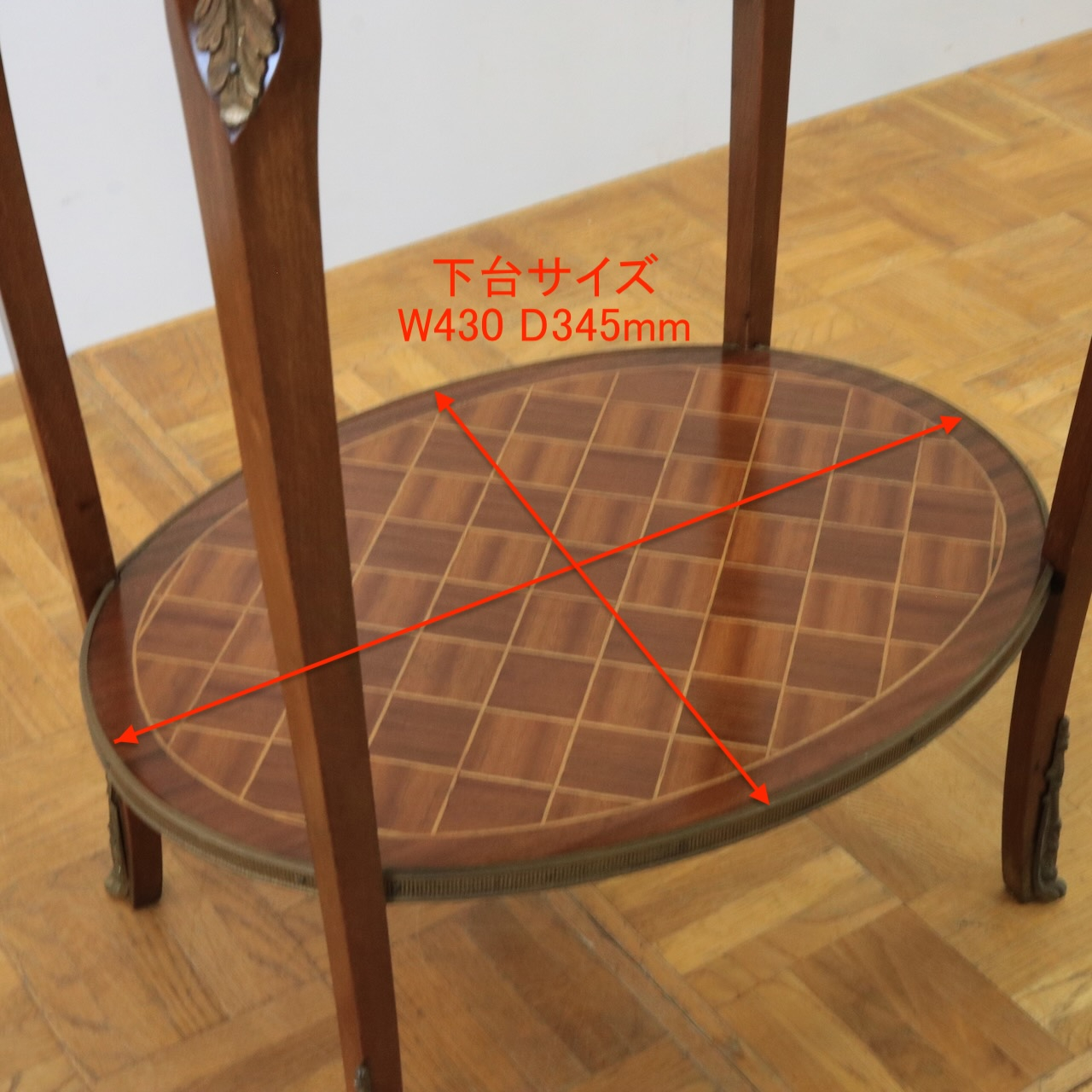 オーバルの天板と下部に付いた棚板にはインレイのパーケットリーが施され、優美なスモールテーブルです。