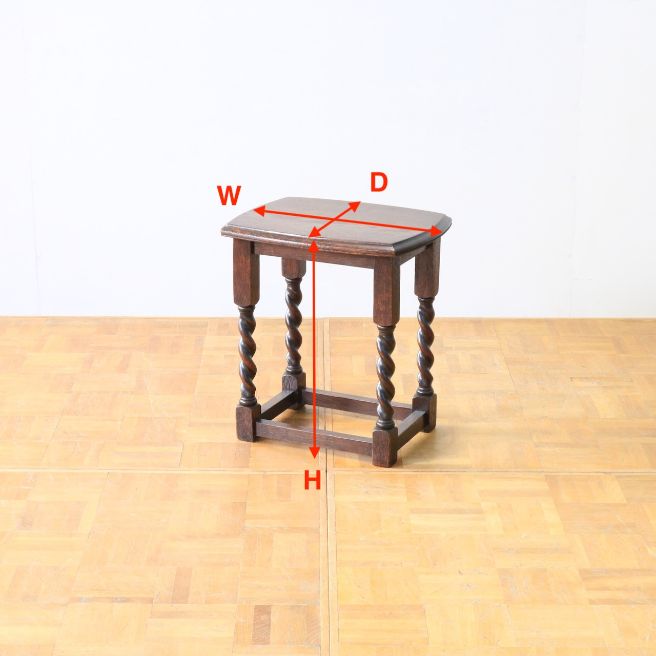 配送料の目安 ▶︎1930年代、オーク材のコーヒーテーブル。素朴で安定感のあるシルエットが魅力の小さなテーブルです。良質な無垢材の風合いと丁寧に作られたツイストレッグがアンティークならではの特長です。