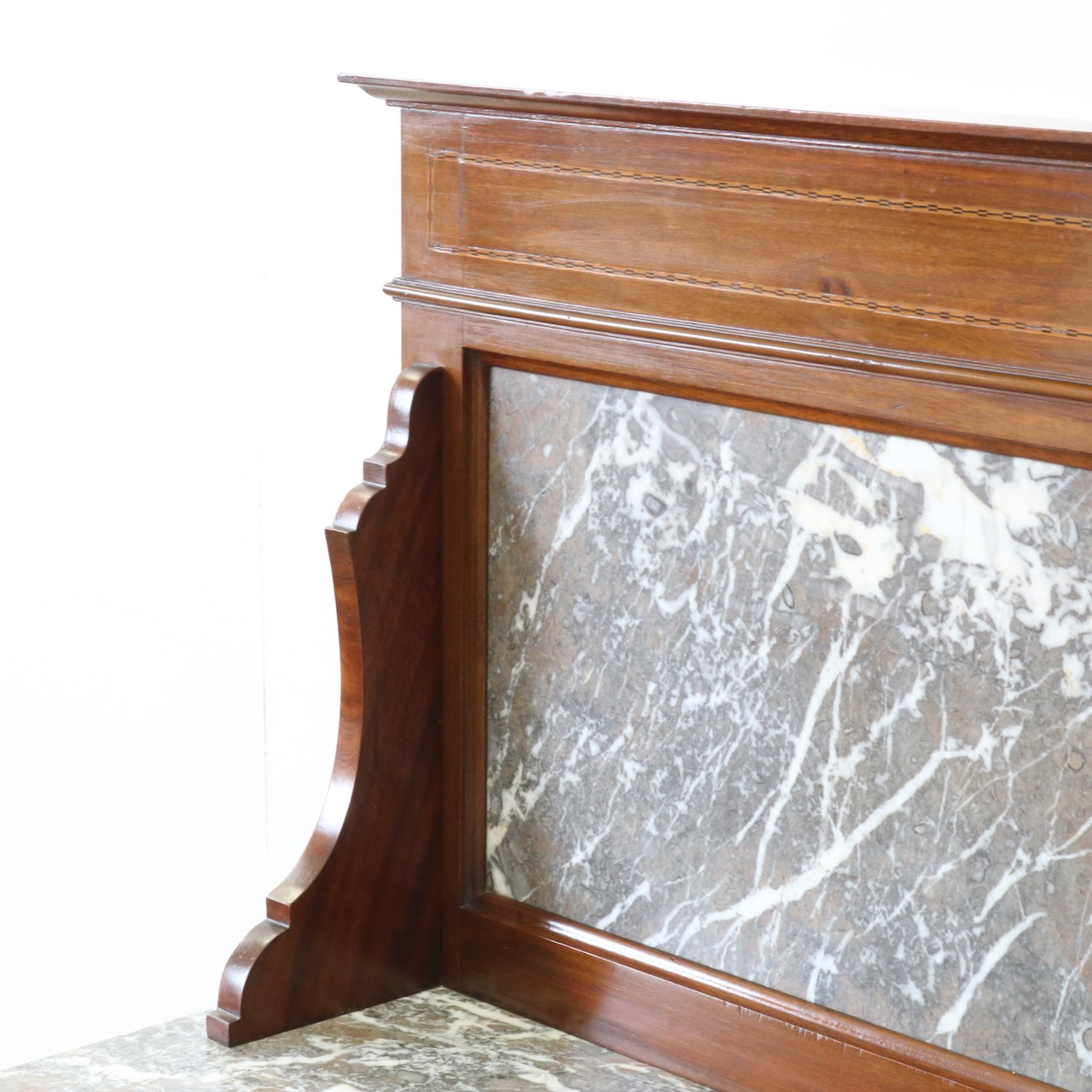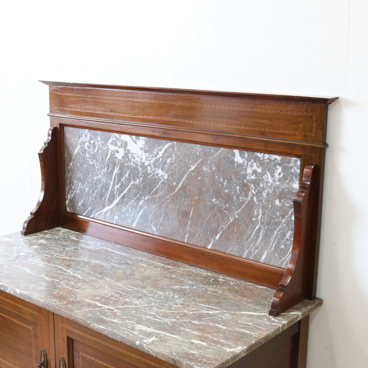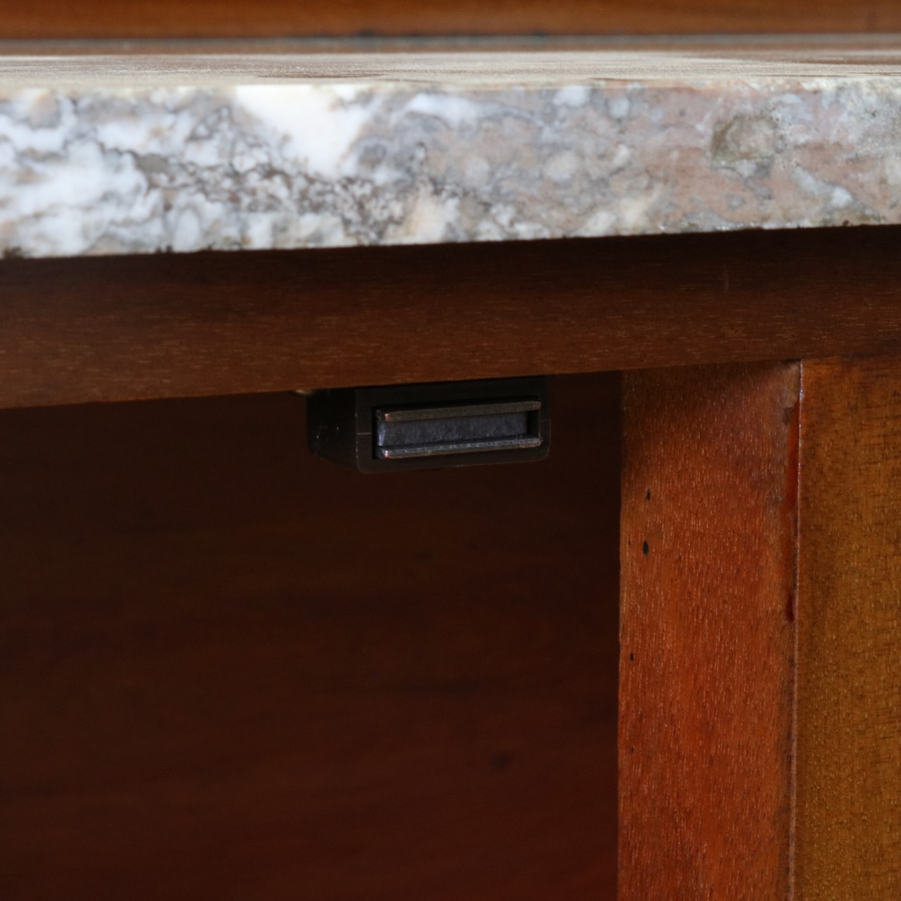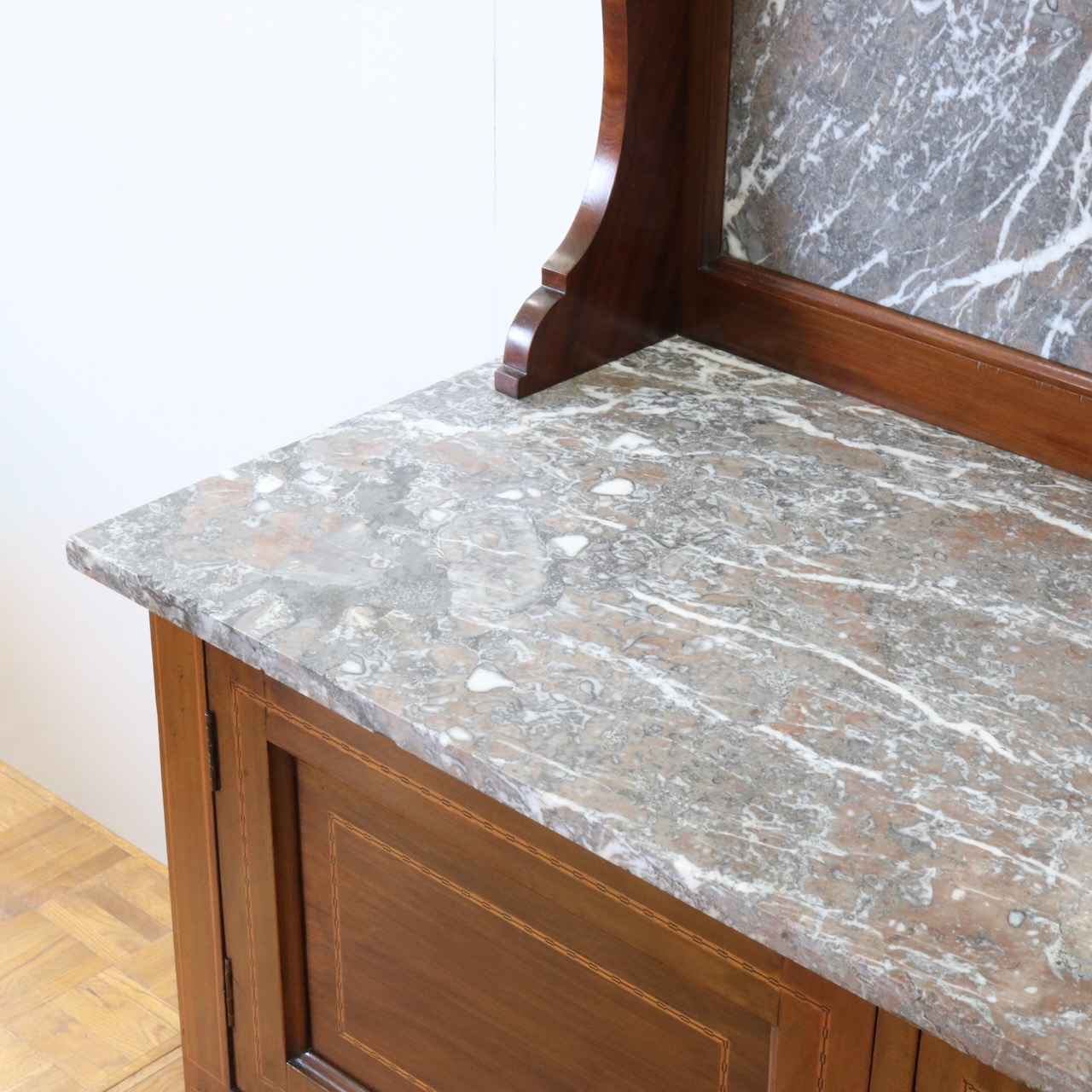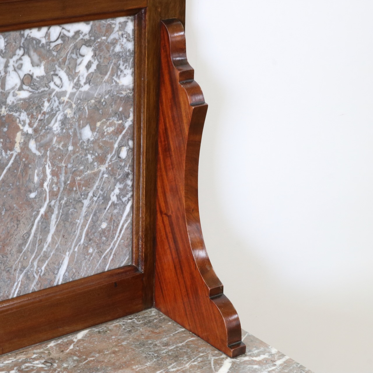 天板とパネル部分は大理石です。赤茶に灰色が混ざった地に白が良いアクセントになっています。