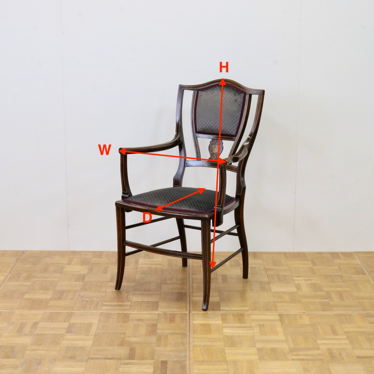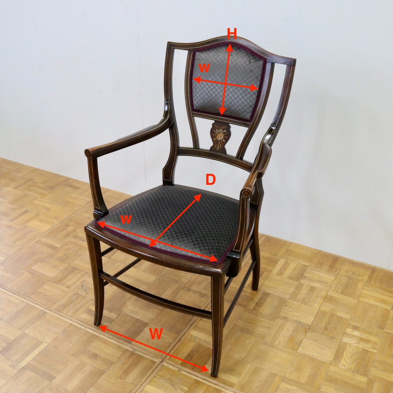 繊細なインレイ細工が施された背もたれ。洗練された佇まいでインテリアに華を添えるひと品です。
