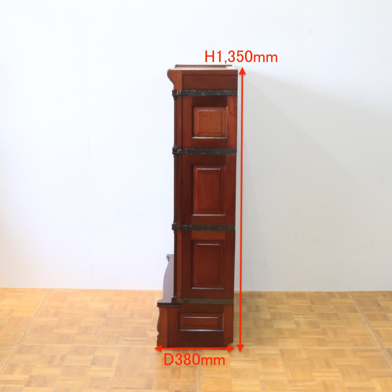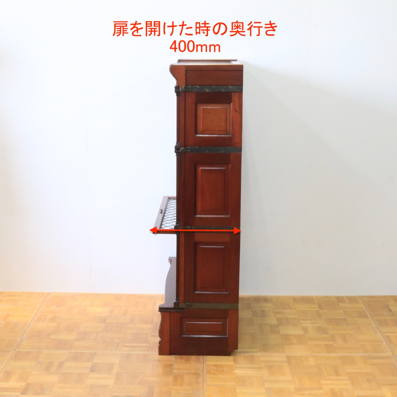 亀甲柄のリーデットグラスが施されたアンティークならではの逸品です。下部には引き出しも付いています。