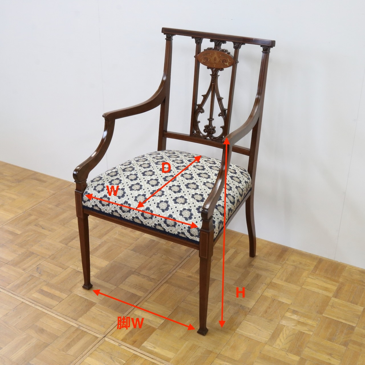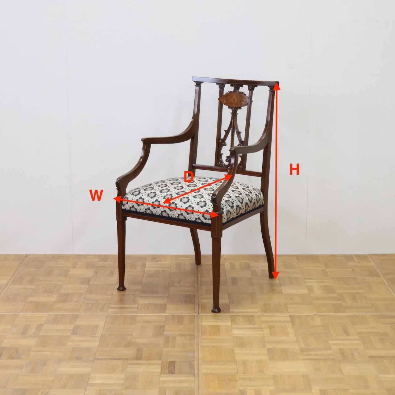 配送料の目安 ▶︎1910年代、マホガニーのアームチェアー。繊細な植物モチーフのインレイと彫刻が美しく目を引きます。インテリアに華を添える優雅なデザインです。