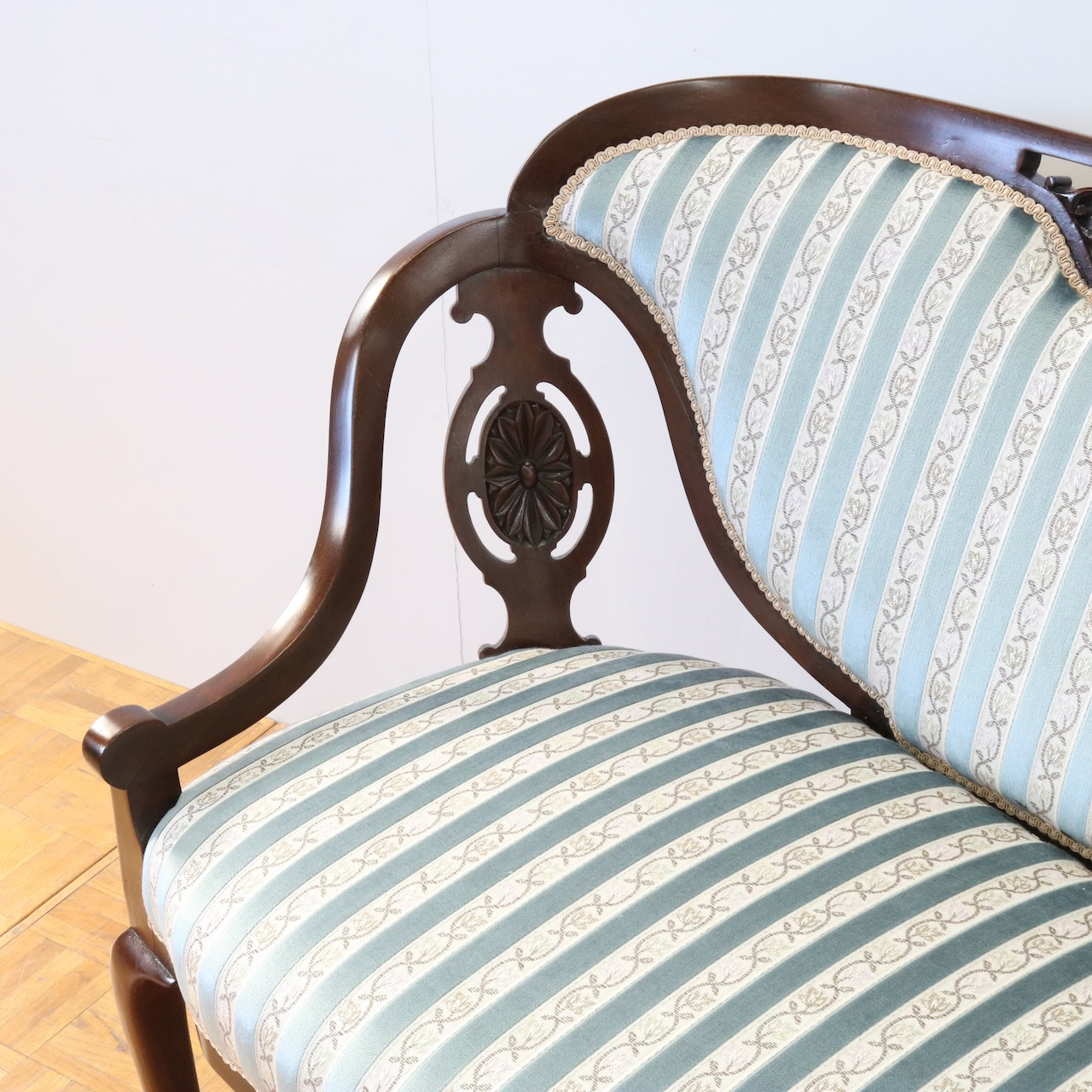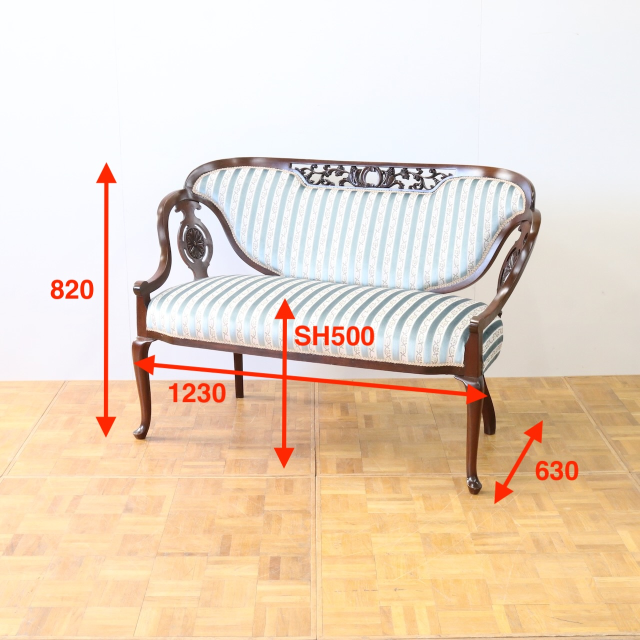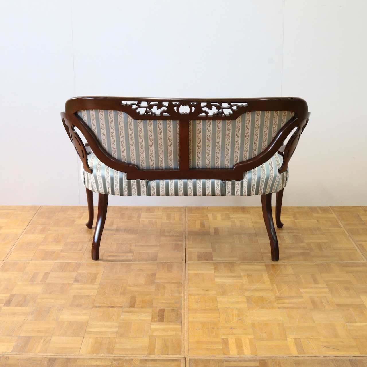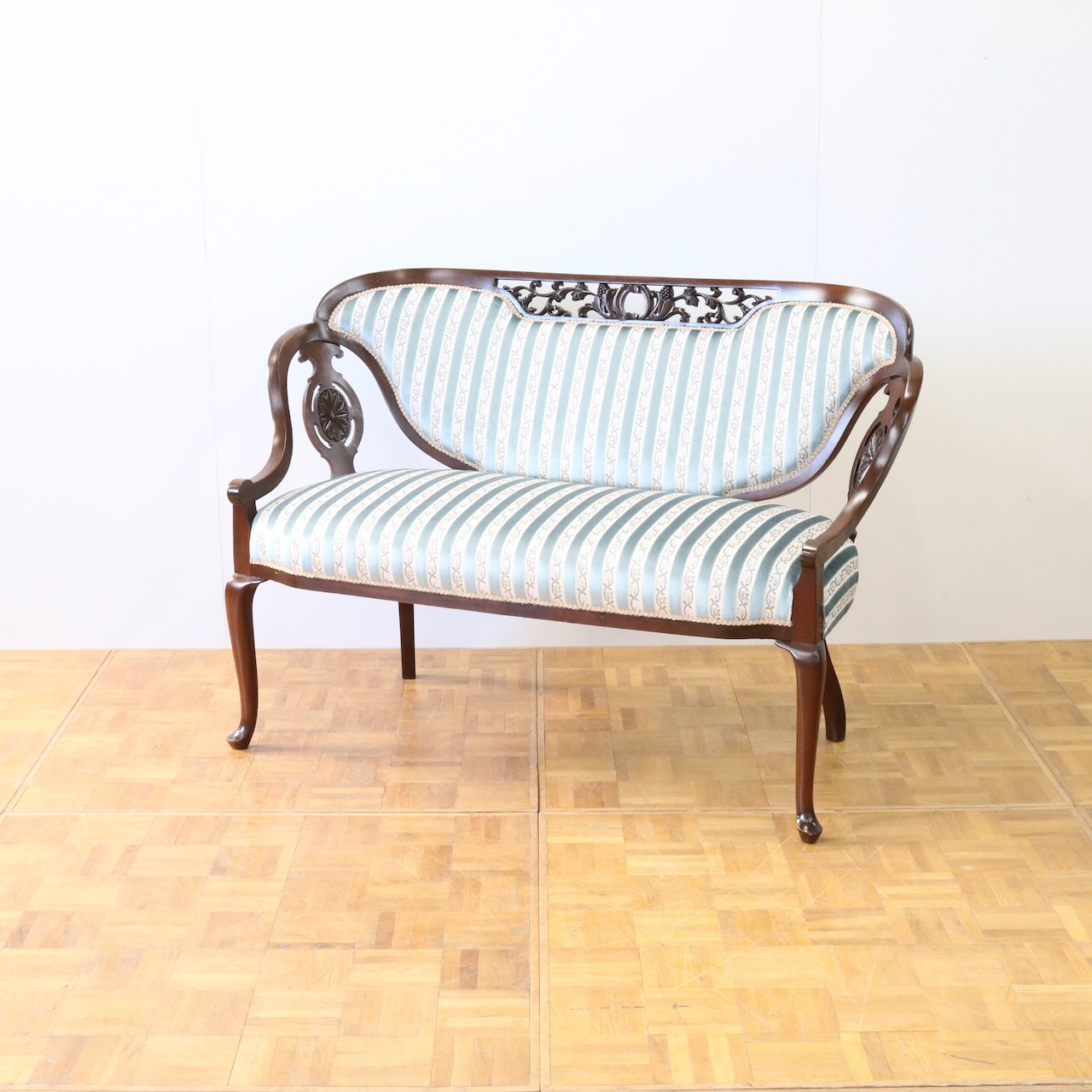 配送料の目安 ▶︎1910年代、マホガニー材のフレームで製作されたセティー。サイズも小振りでお部屋のアクセントになる二人掛けラブソファーです。