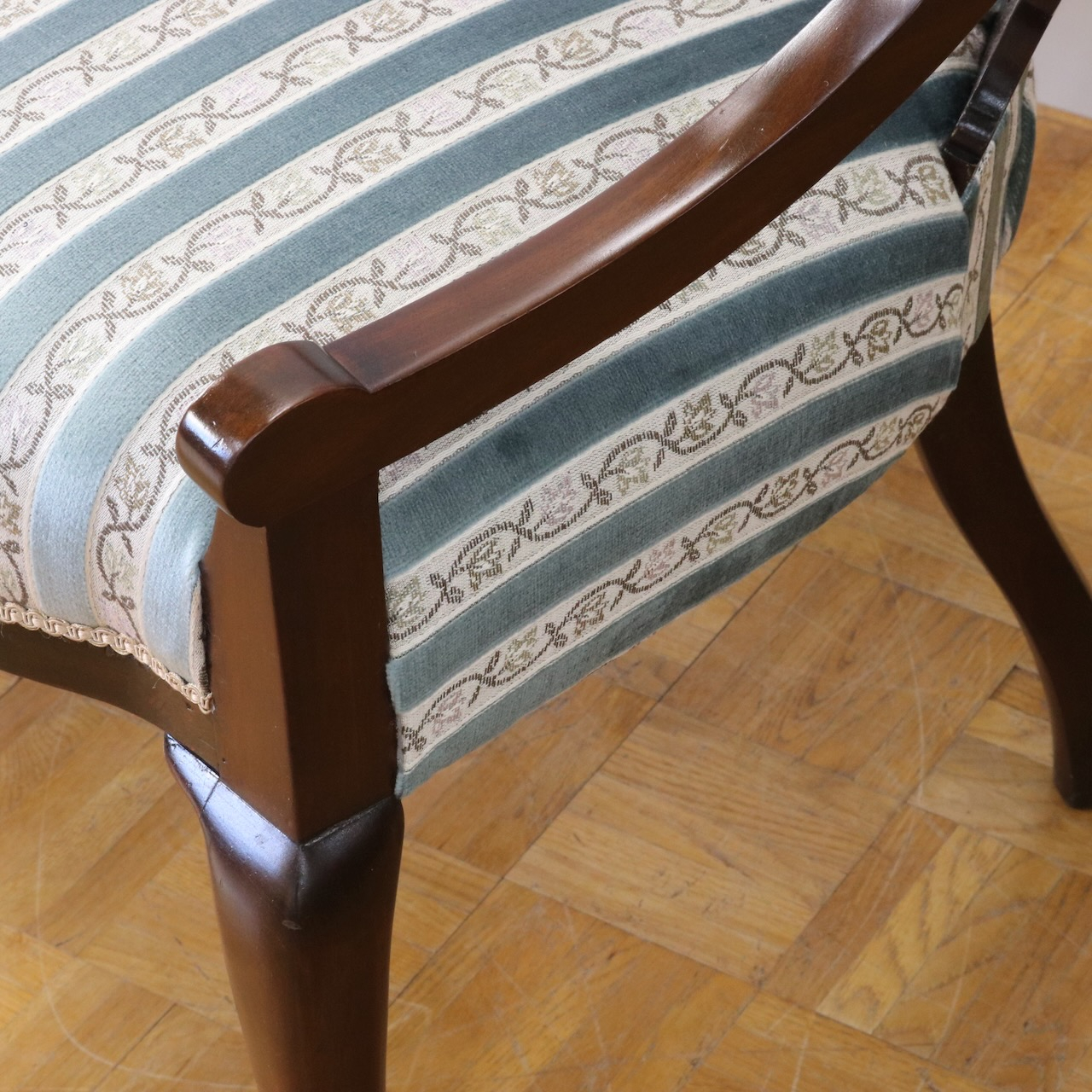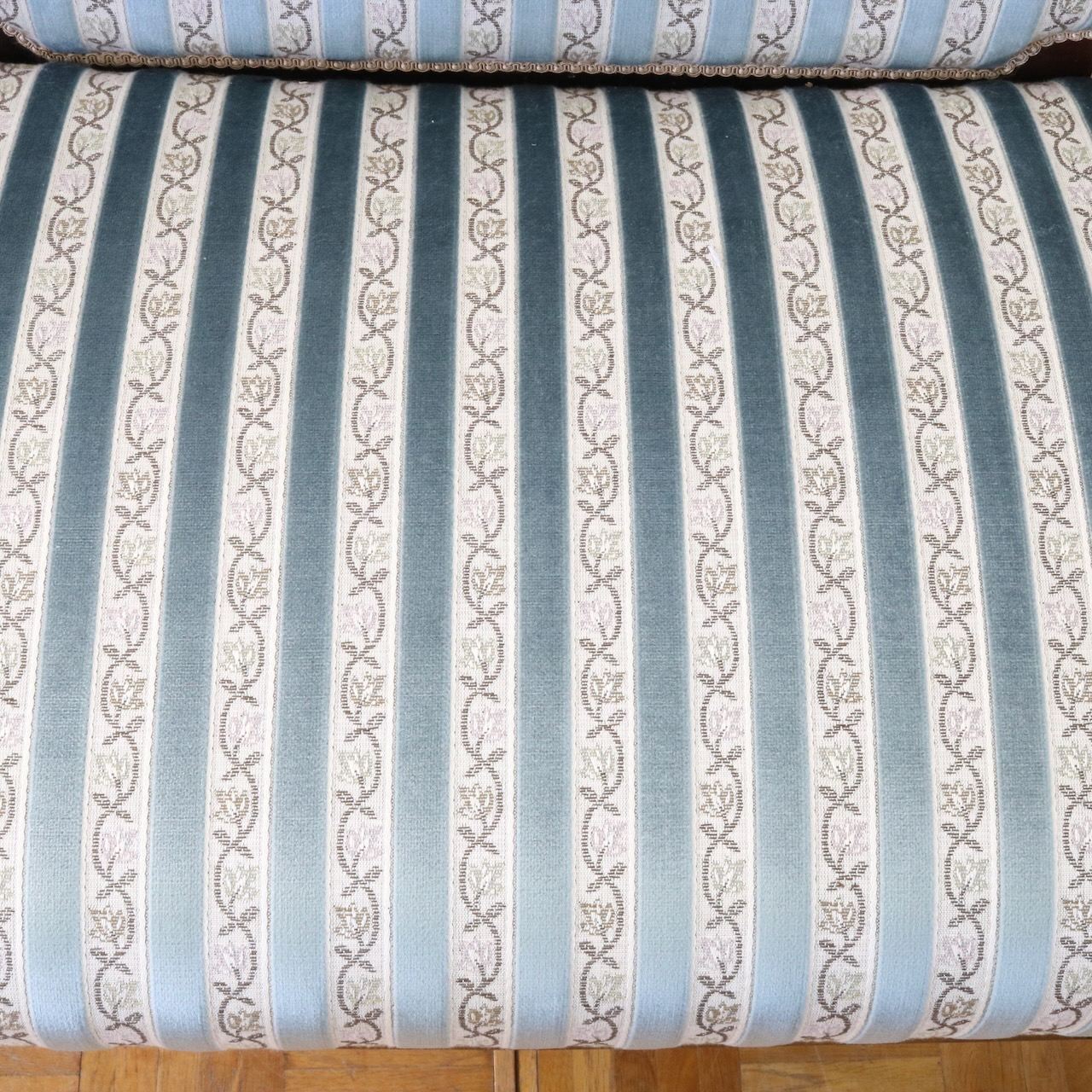 ドイツ製の生地で、落ち着いた水色と蔦植物の紋様のストライプが目を惹きます。