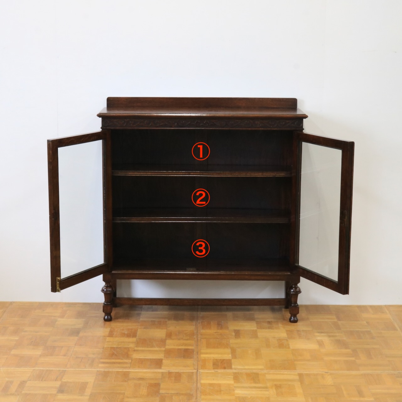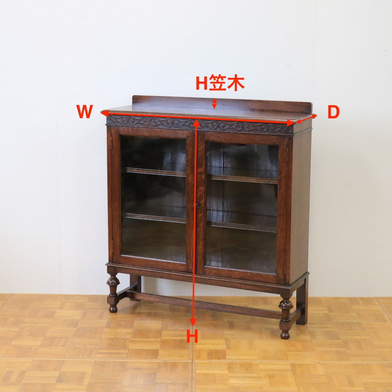 配送料の目安 ▶︎1930年代、オークのブックケース。ほぼ正方形のサイズ、奥行きも薄く使い勝手の良いブックケースです。扉のガラスがシンプルなので、コレクションボードとしてもお使い頂けます。