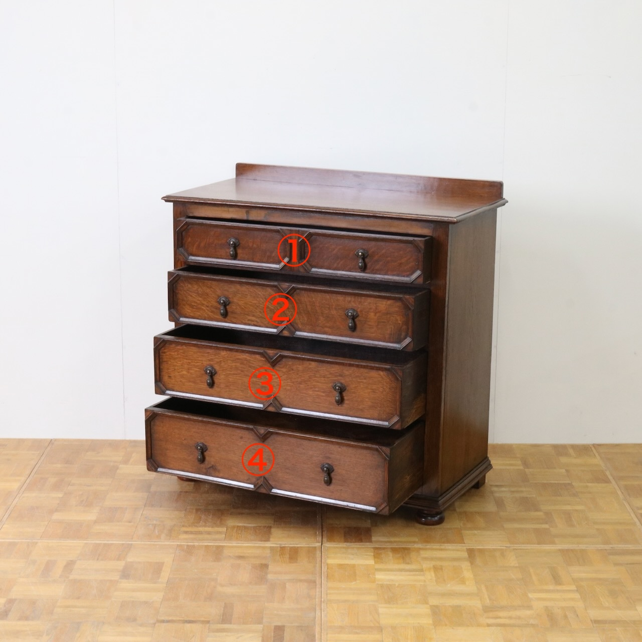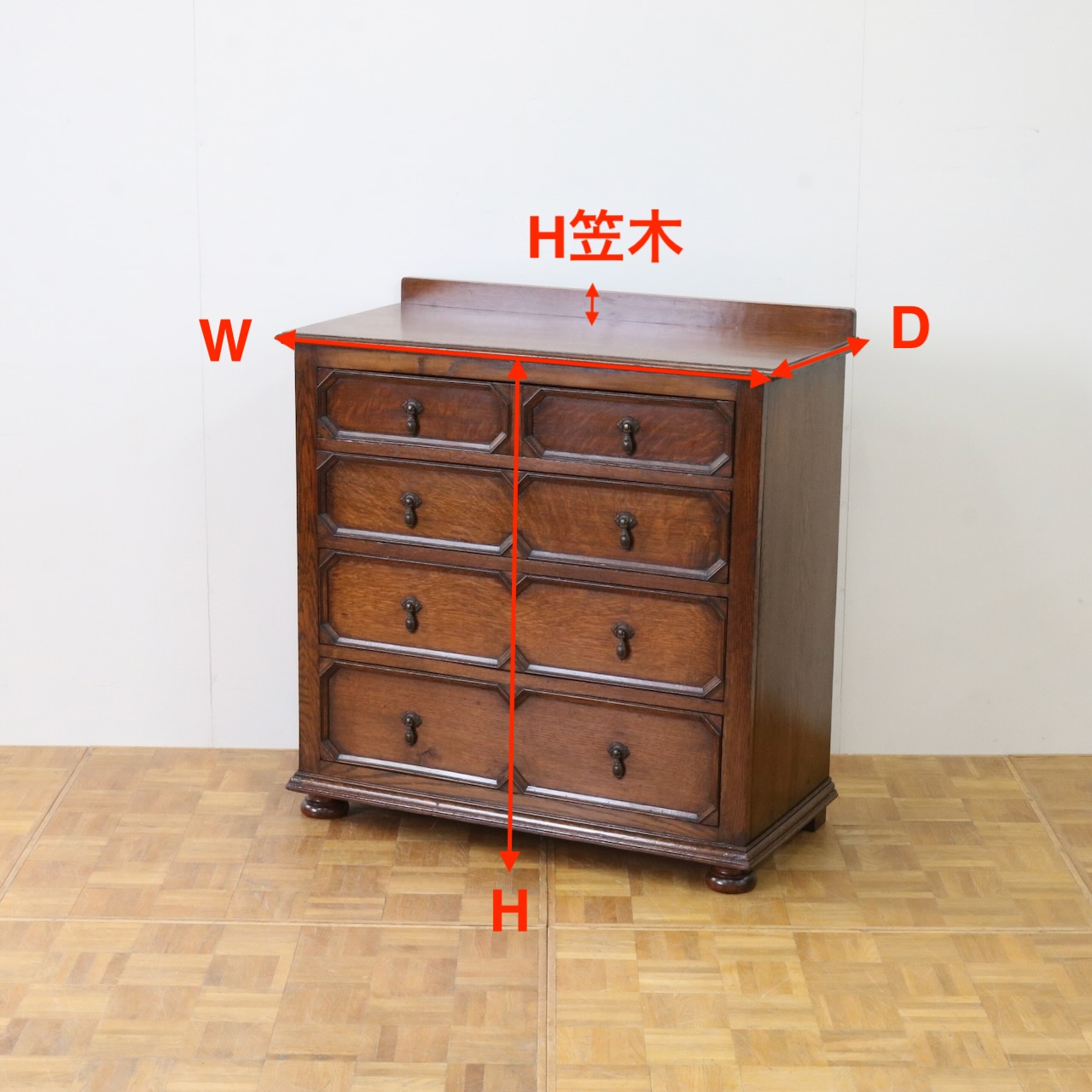 配送料の目安 ▶︎1930年代、オーク材のチェストオブドロワーズ。引き出し部分はオーク材らしい杢目が際立ったアプライドモールディングが印象的なデザイン。確かな収納力とオークの家具らしい存在感を感じられます。