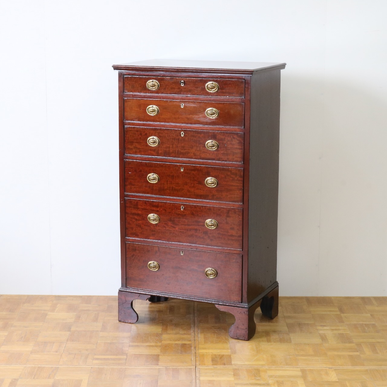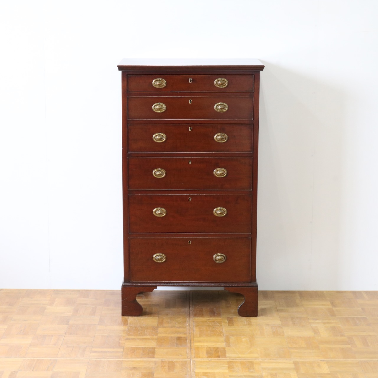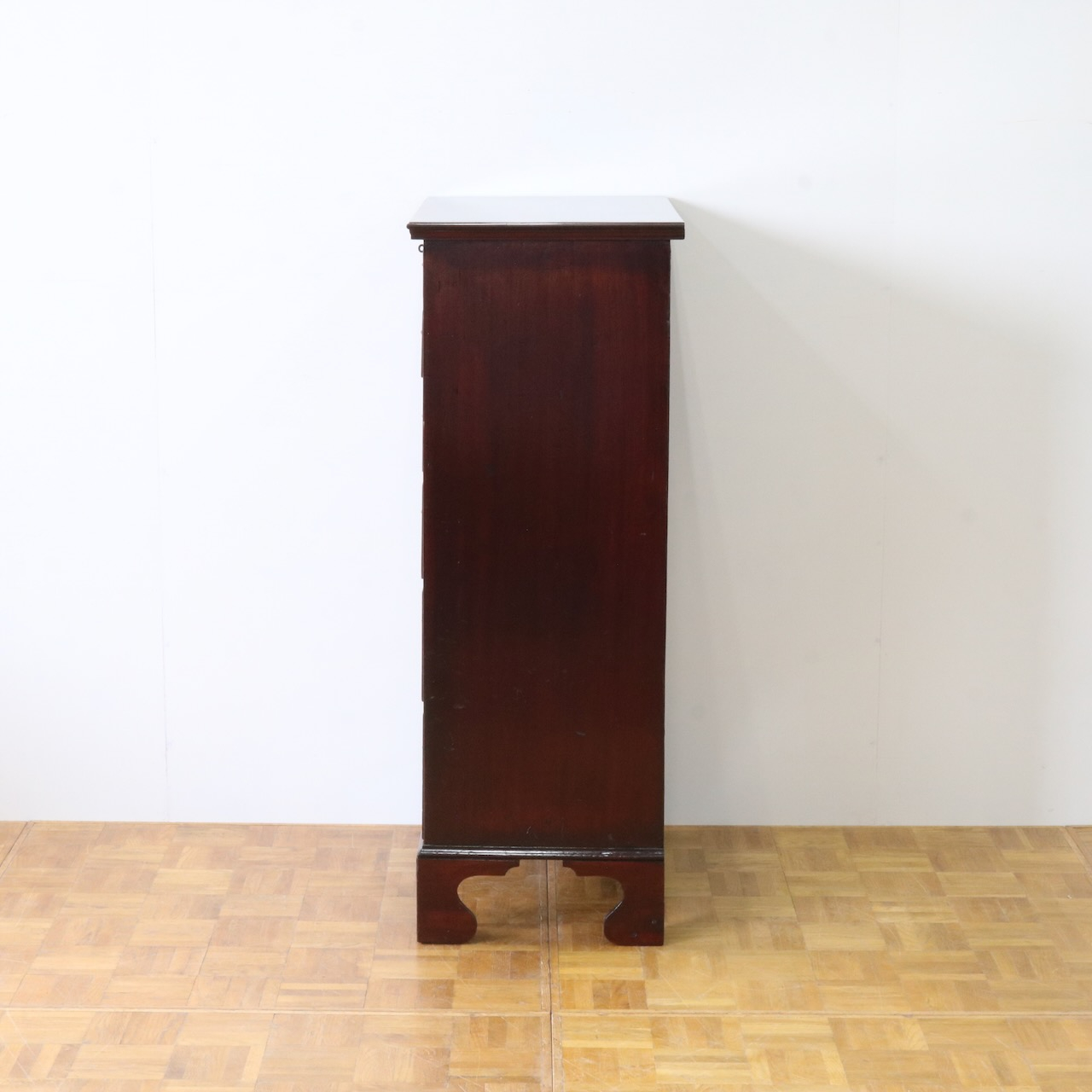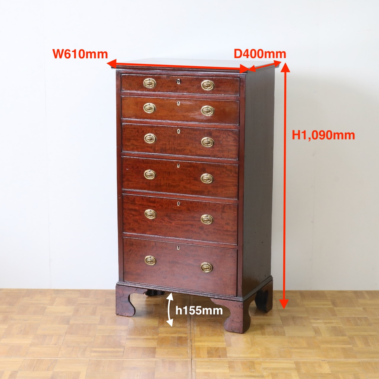 配送料の目安 ▶︎1920年代、マホガニーのチェスト。シンプルな本体にブラケットフィートの脚元と真鍮の引き手がアクセント。6段の収納力で実用性の高さも魅力的。