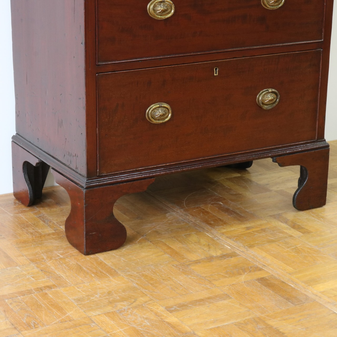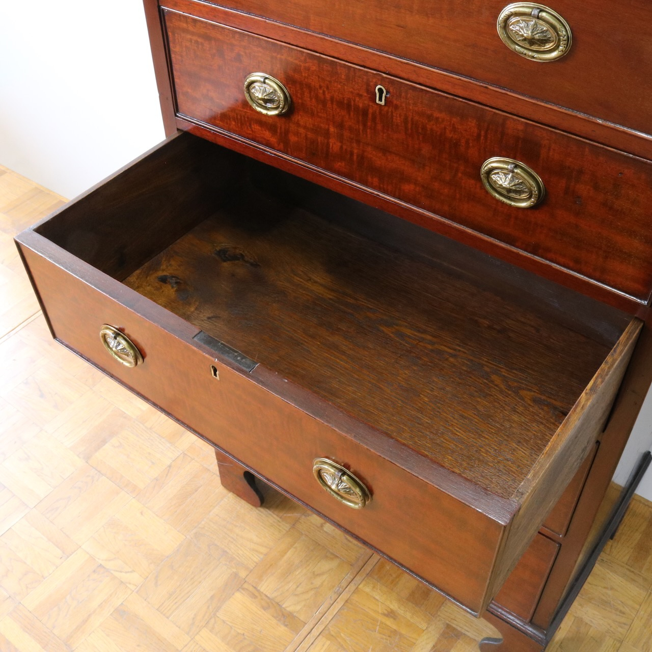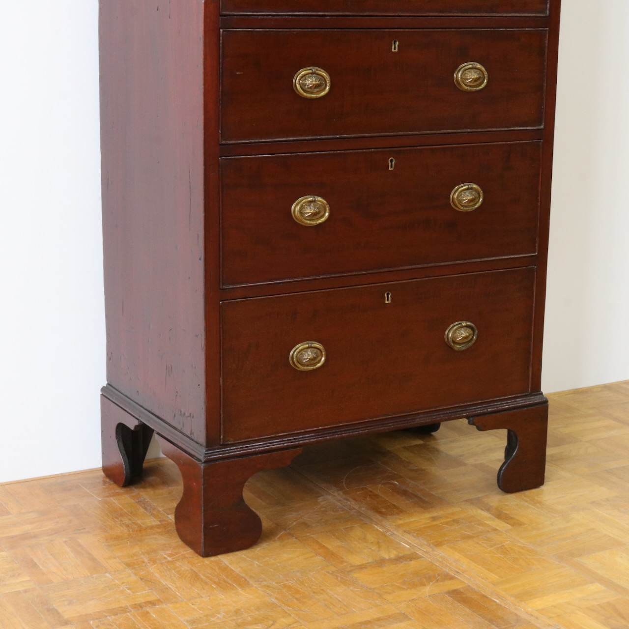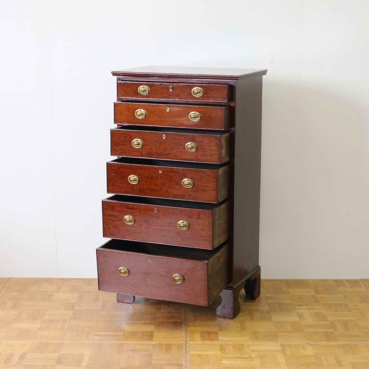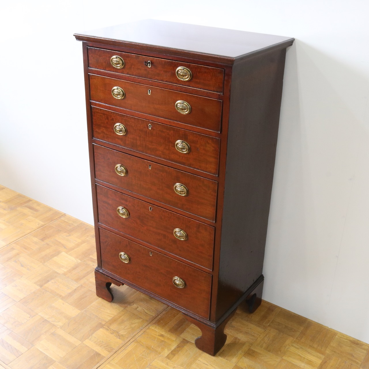 配送料の目安 ▶︎1920年代、マホガニーのチェスト。シンプルな本体にブラケットフィートの脚元と真鍮の引き手がアクセント。6段の収納力で実用性の高さも魅力的。