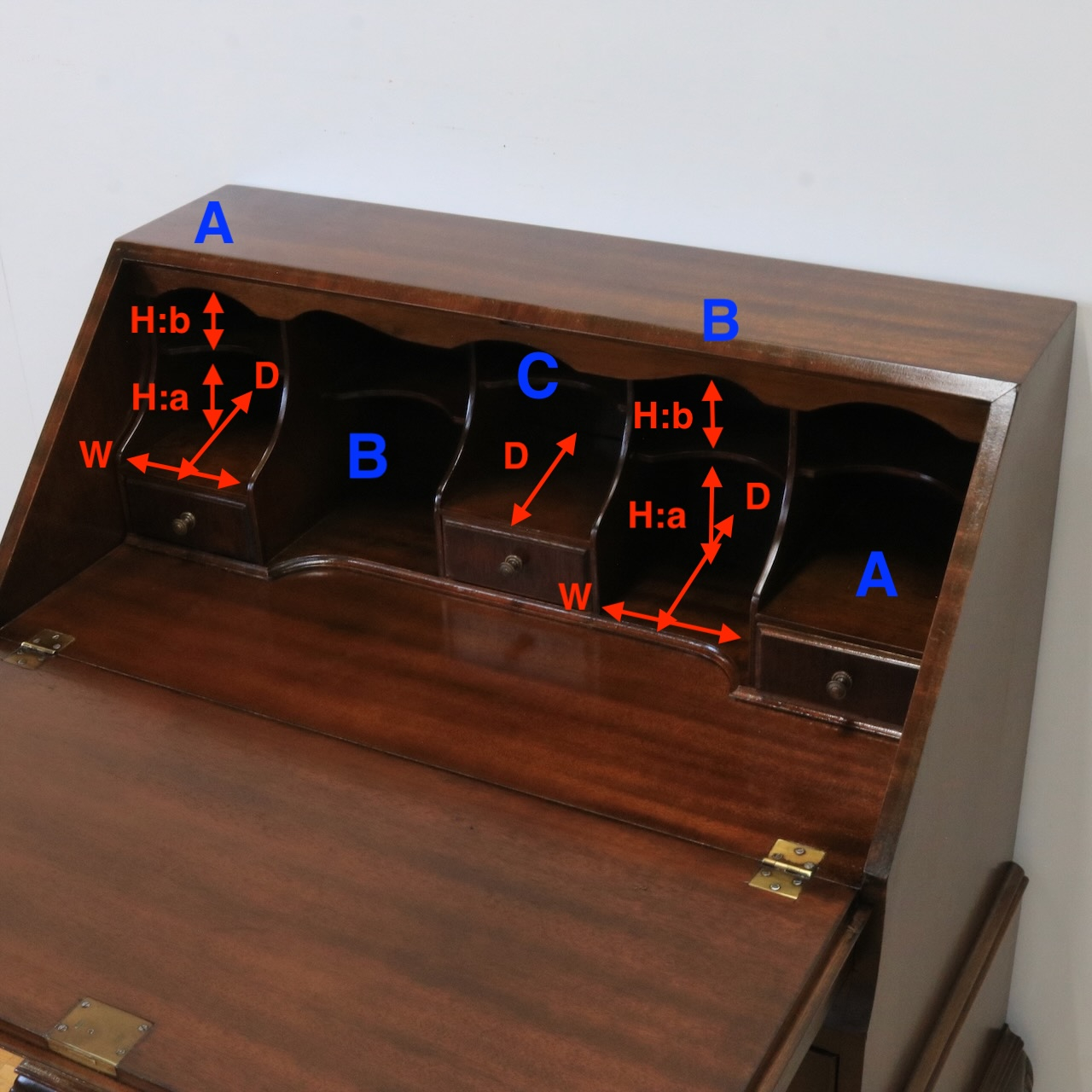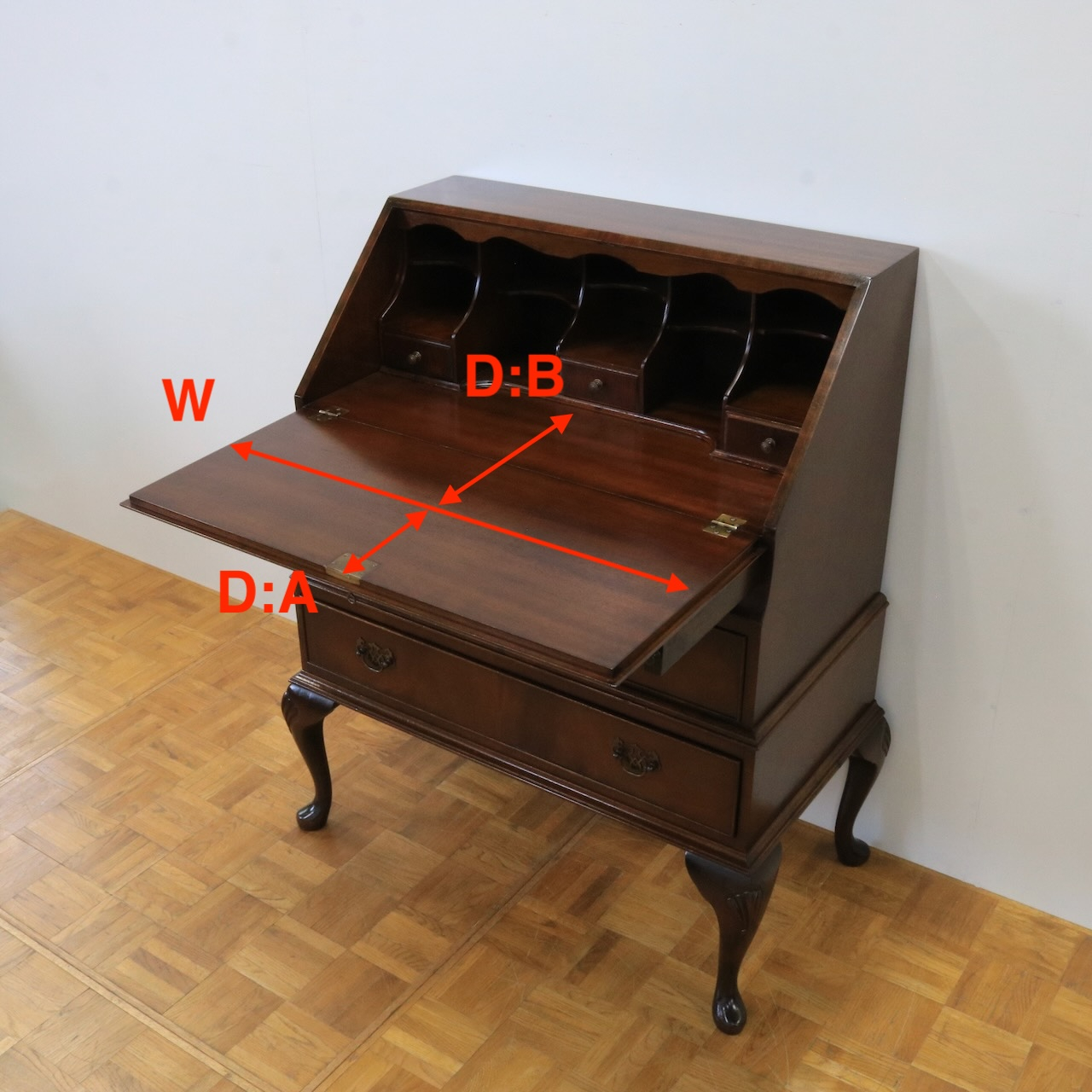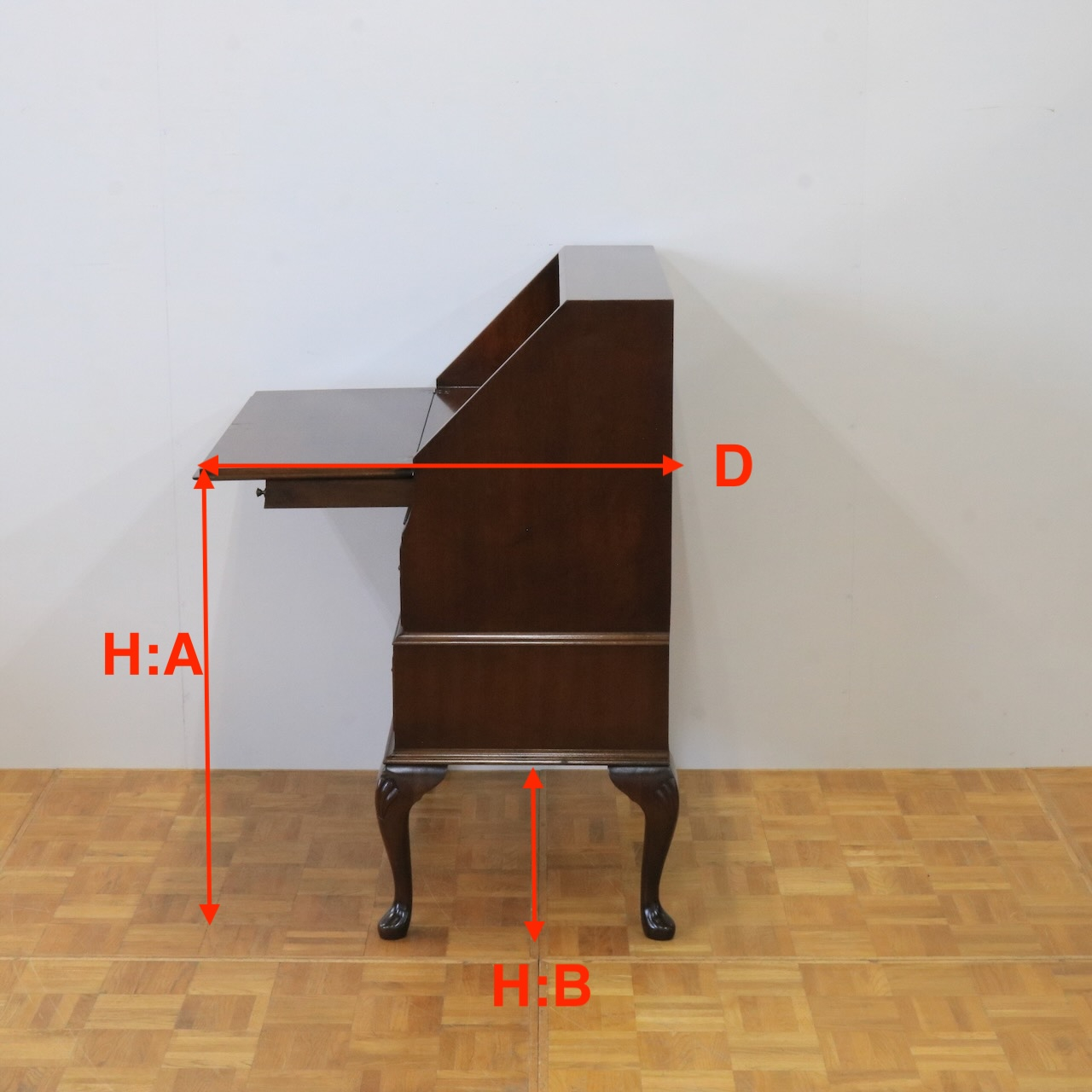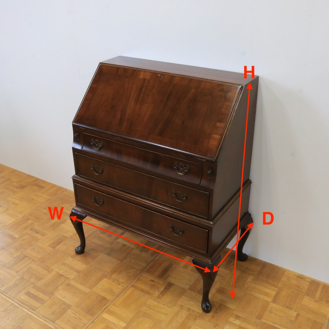 配送料の目安 ▶︎マホガニー材のビューロー。フラップを閉じるとマホガニーらしい滑らかな杢目模様が現れ、クラシックな佇まいの家具として空間になじみます。在宅でお仕事をされるとき、読書や日記を書くプライベートな時間を過ごしたいとき、またお店のディスプレイ什器にしても素敵ですね。