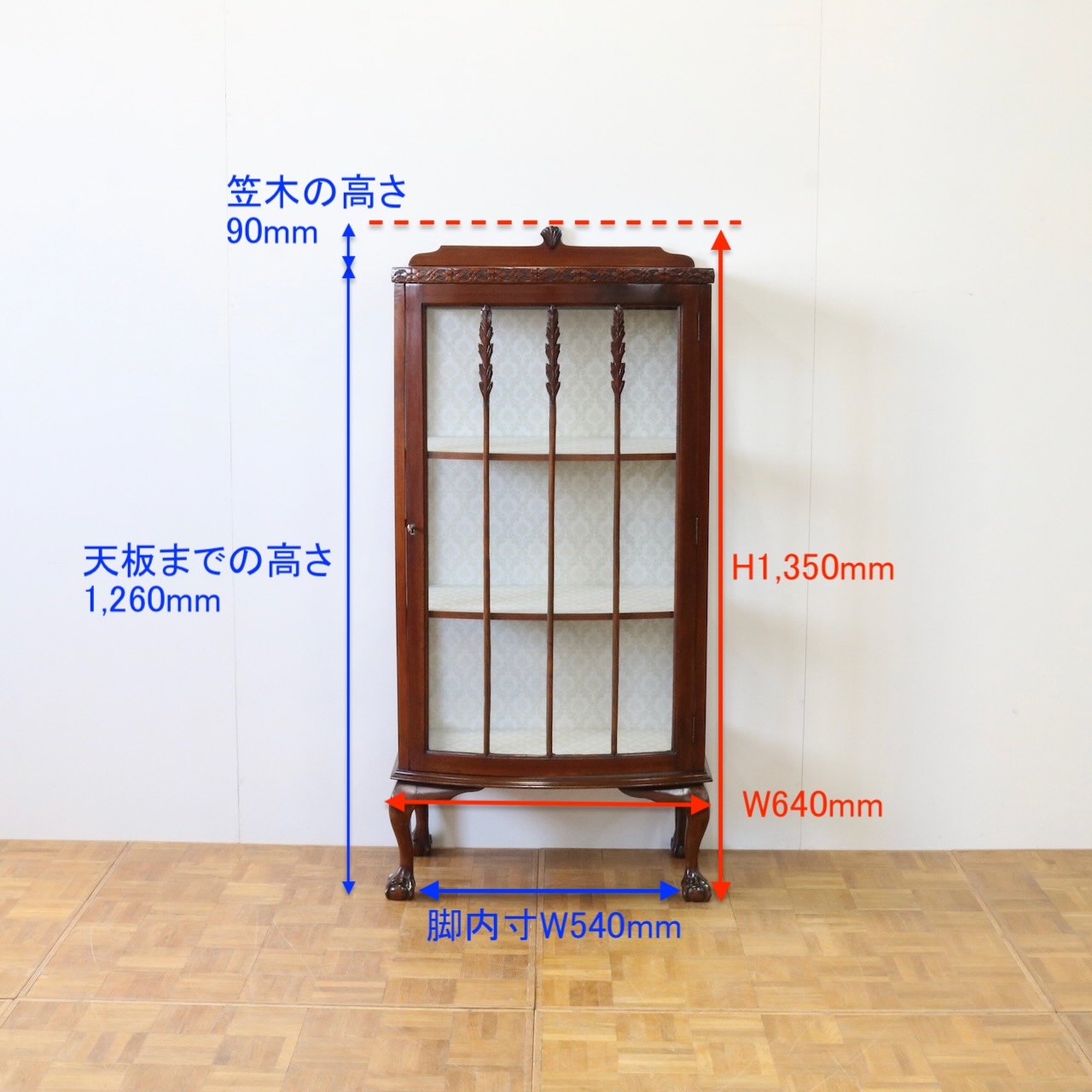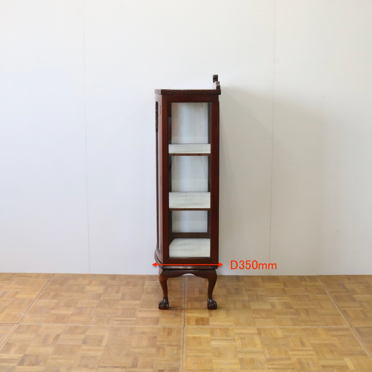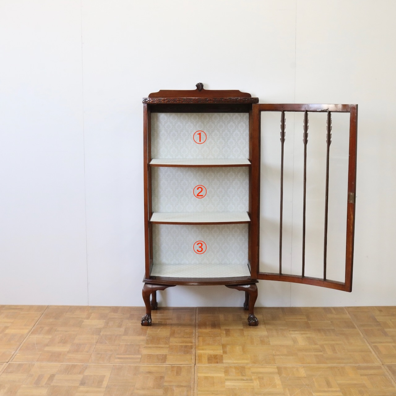 マホガニーの質感が良く、内部はクロス張りとなっており、銀器や陶磁器などお気に入りの品を飾る棚として重宝します。