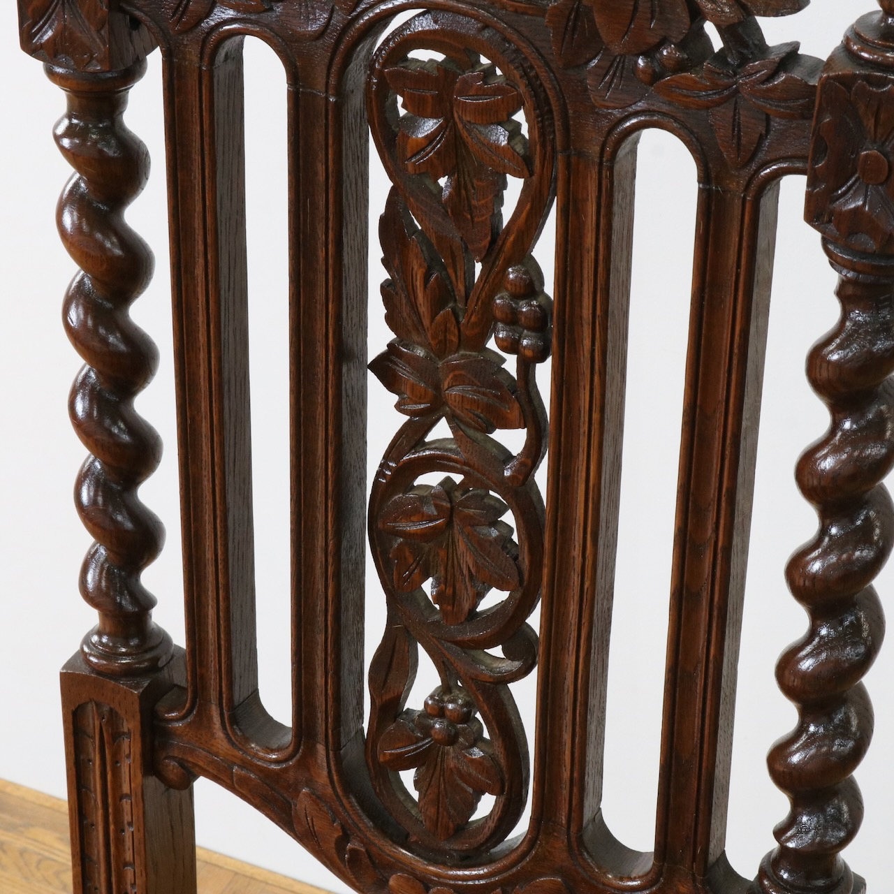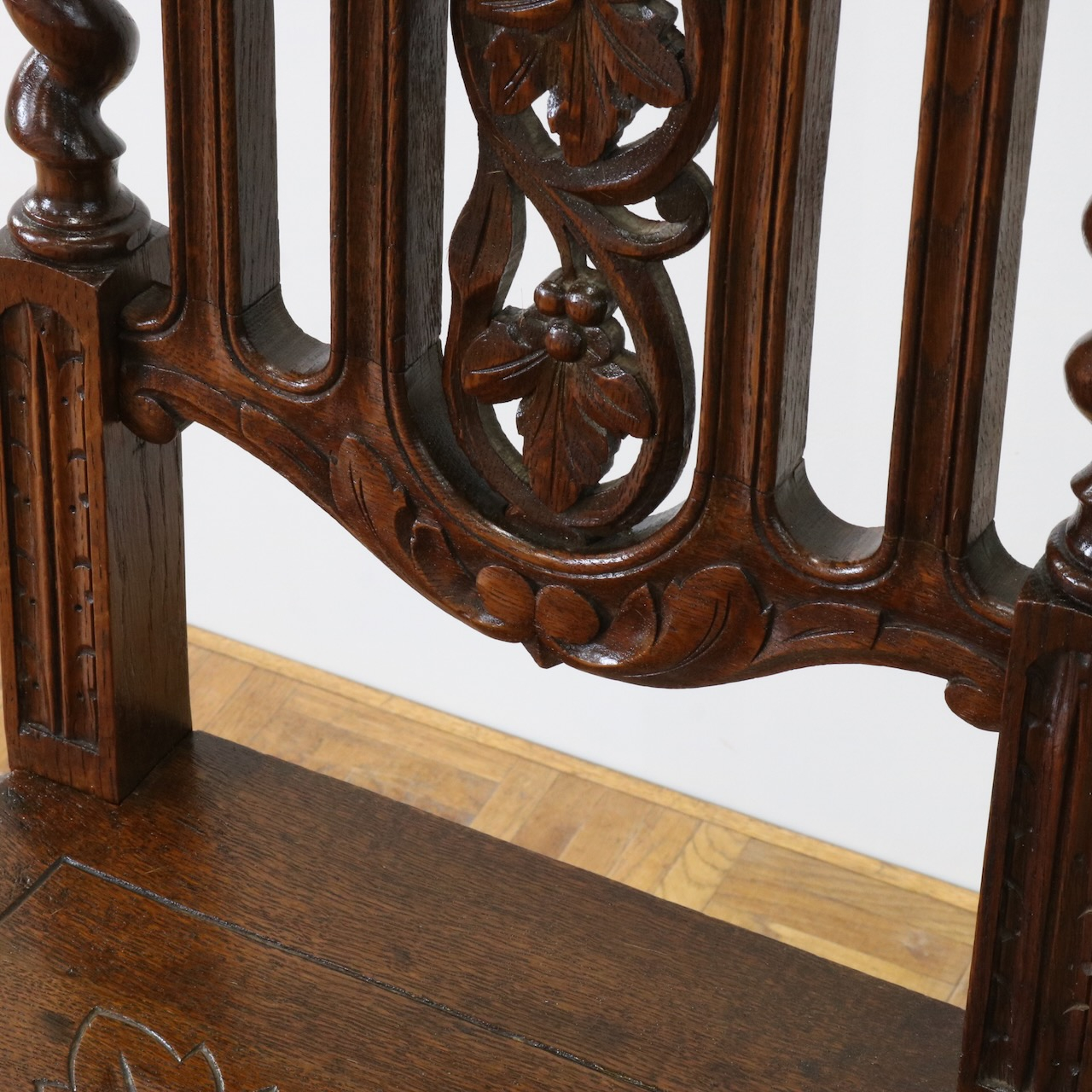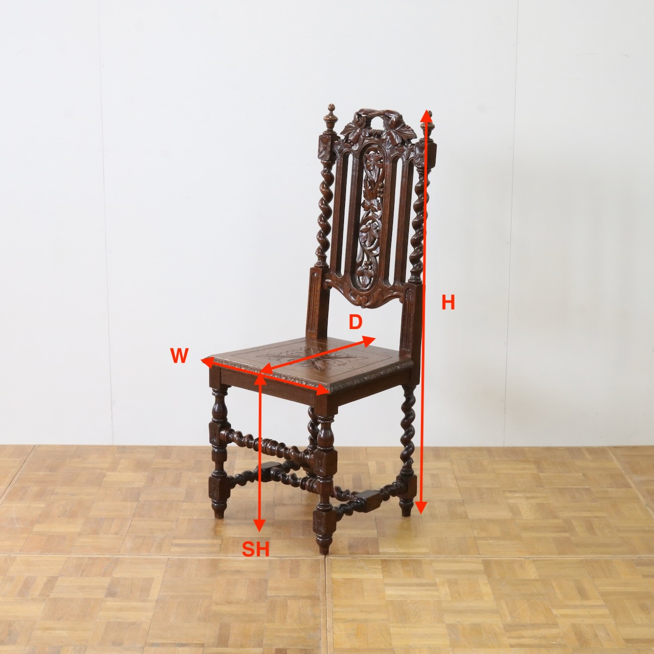 配送料の目安 ▶︎1930年代、イギリス製オーク材のホールチェアー。その名の通り玄関ホール等に主に飾り椅子として置かれていたもの。背の彫刻が特徴的でバーリーシュガーツイストを随所に使った個性的なチェアーです。