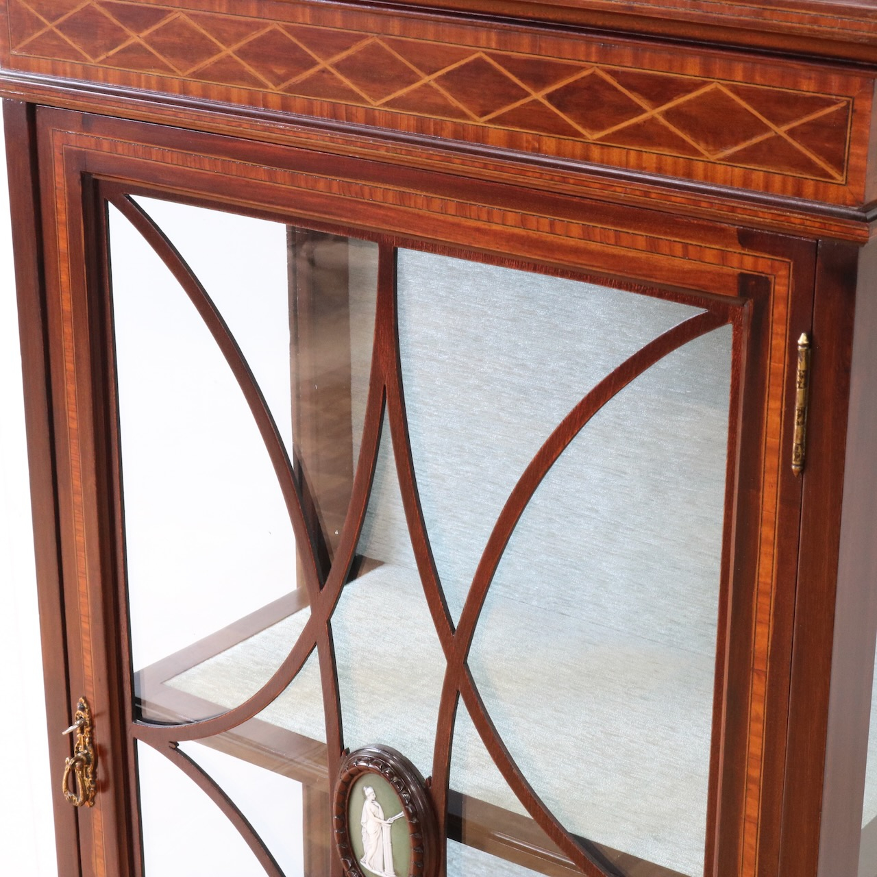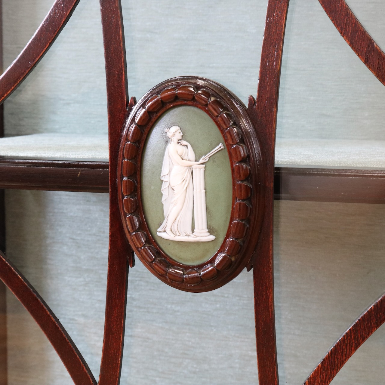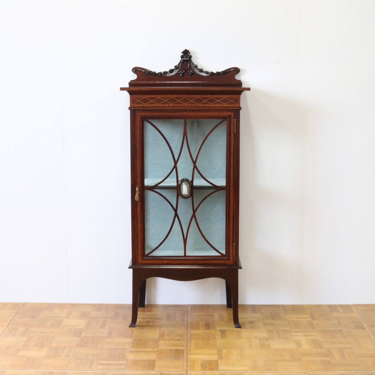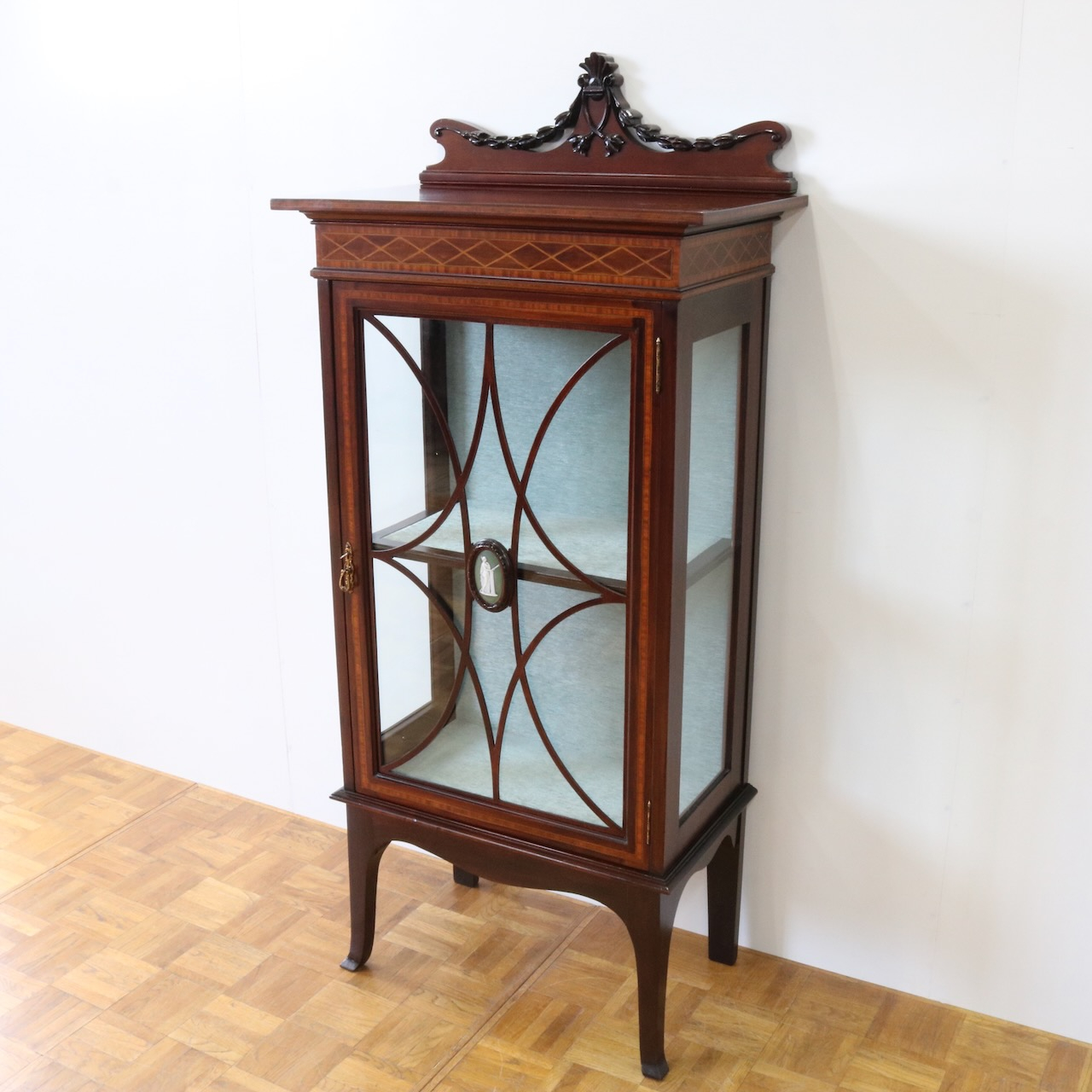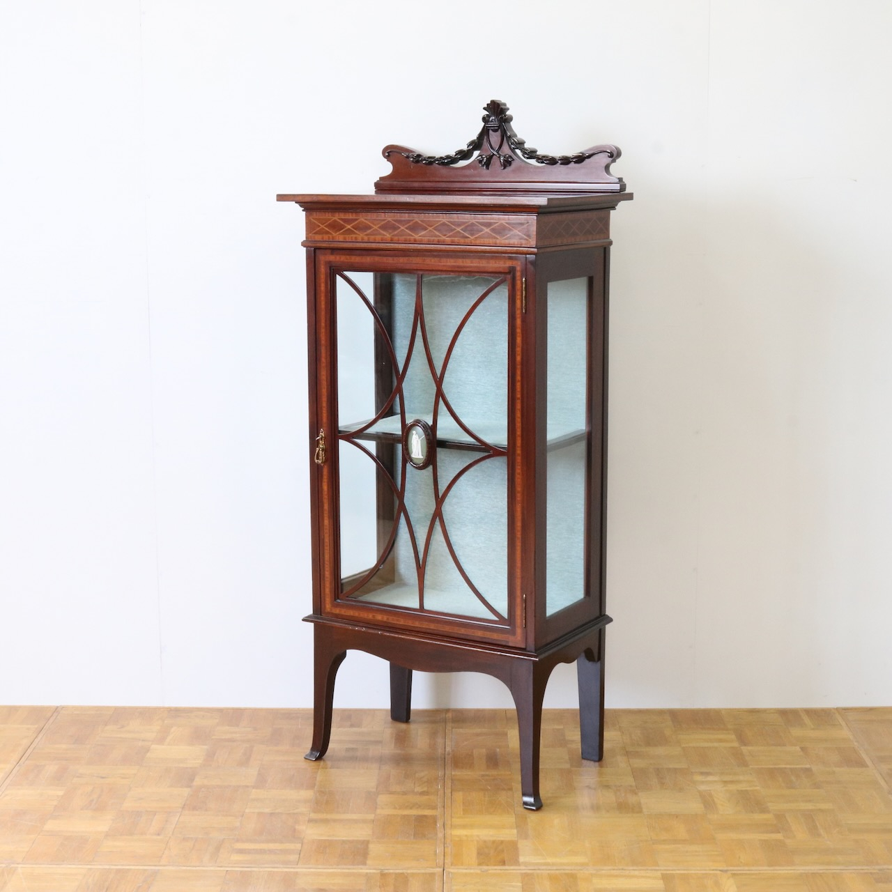 配送料の目安 ▶︎1920年代、マホガニー材のグラスキャビネット。繊細で直線的なフォルムに、ハスク飾りのついたトップがクラシカルなアクセントになっています。ガラス扉の中央にはグリーン地のジャスパーのメダルがはめ込まれています。