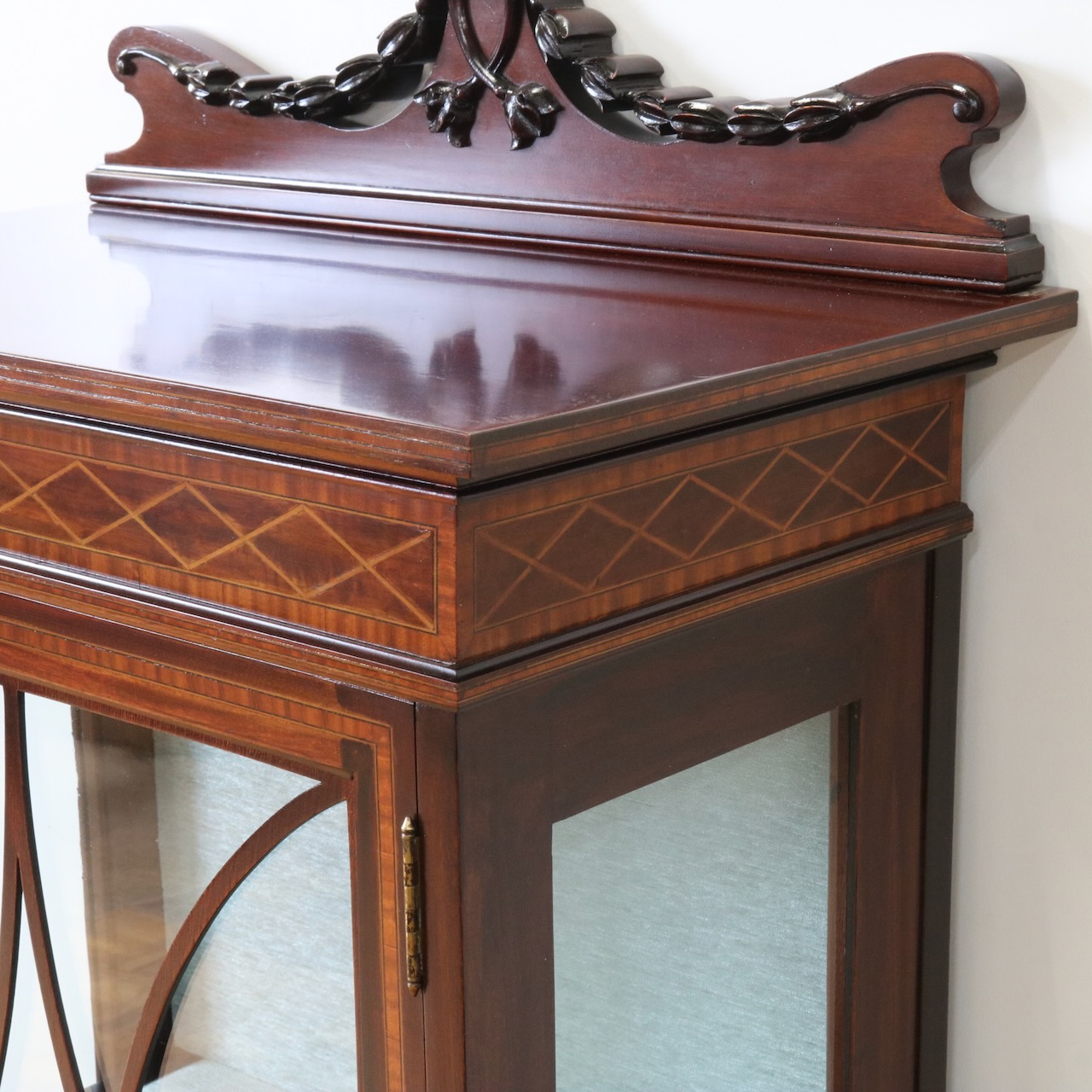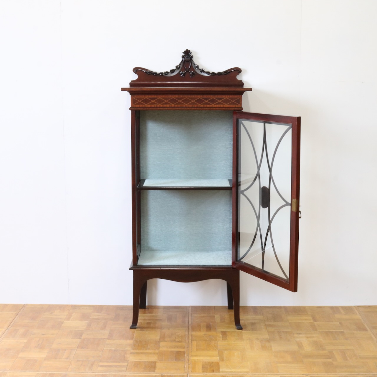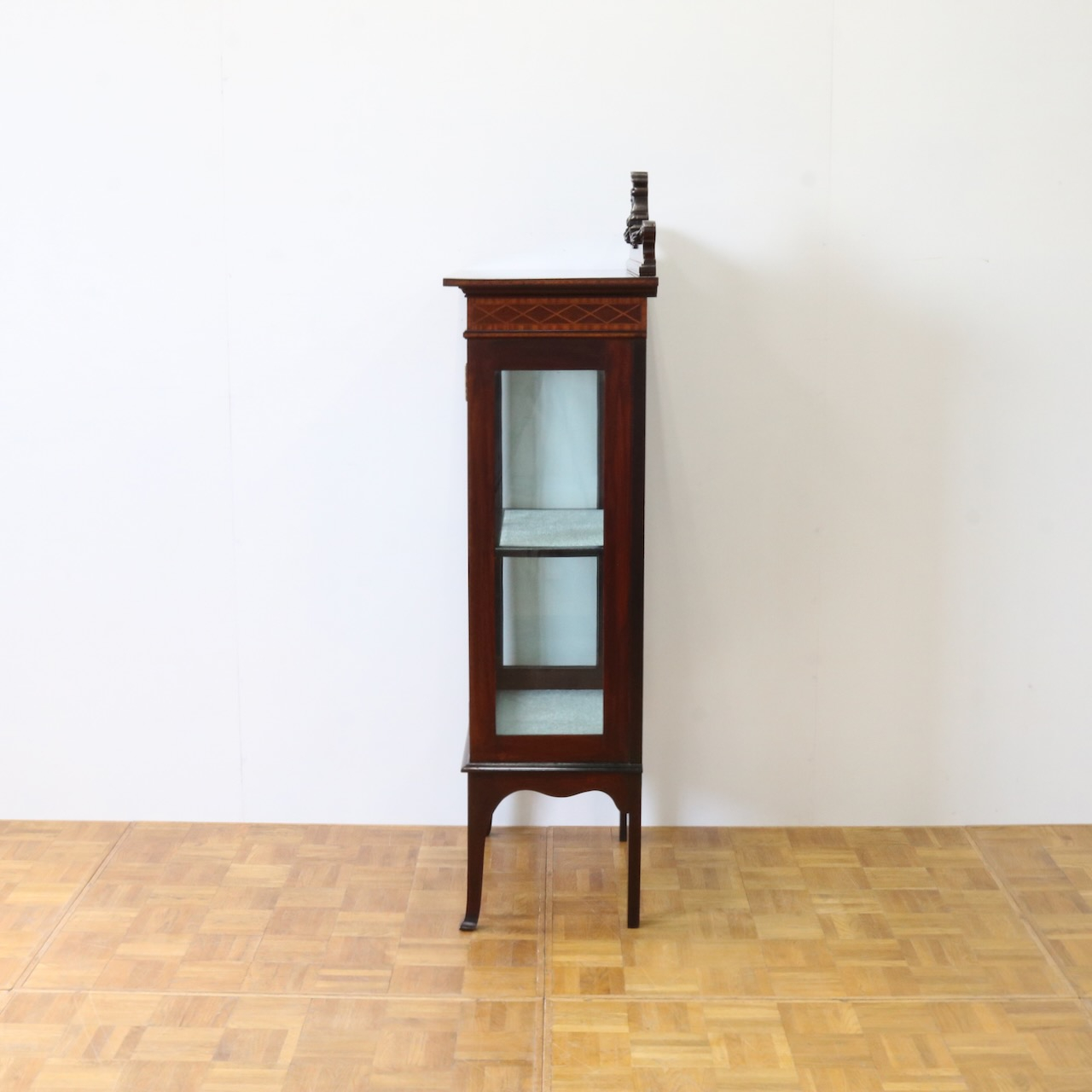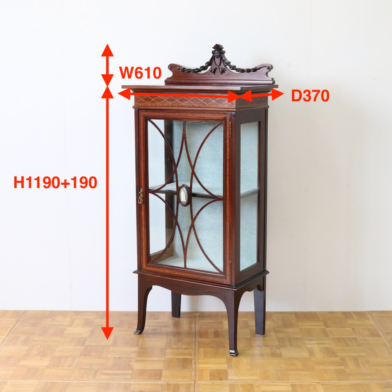 配送料の目安 ▶︎1920年代、マホガニー材のグラスキャビネット。繊細で直線的なフォルムに、ハスク飾りのついたトップがクラシカルなアクセントになっています。ガラス扉の中央にはグリーン地のジャスパーのメダルがはめ込まれています。