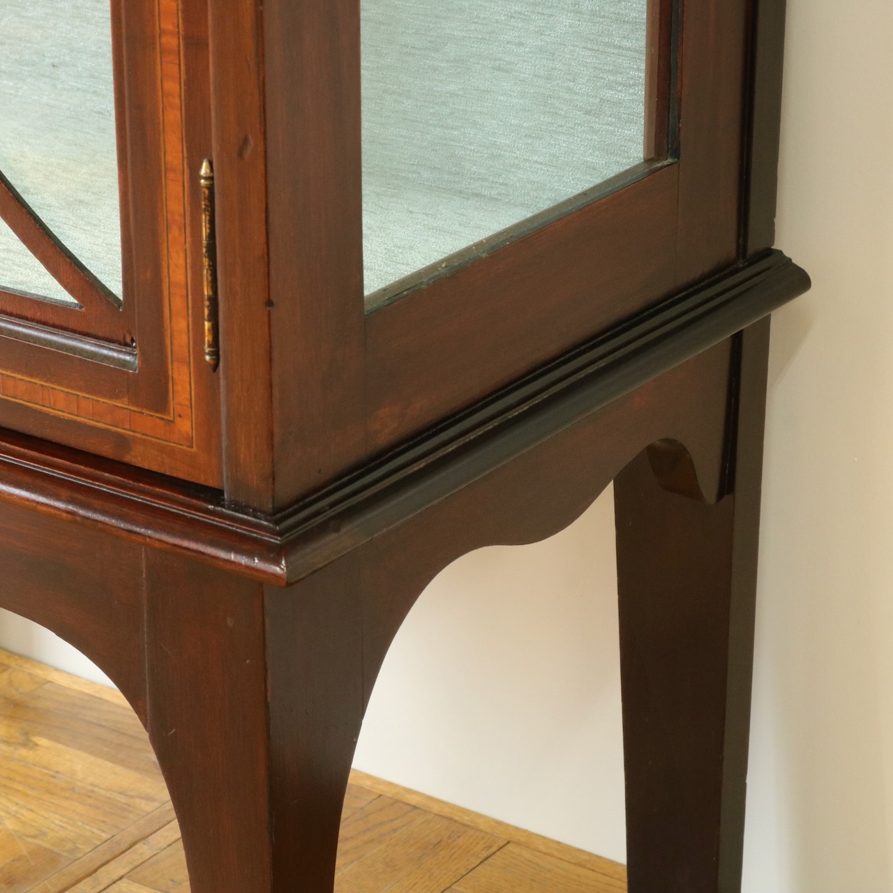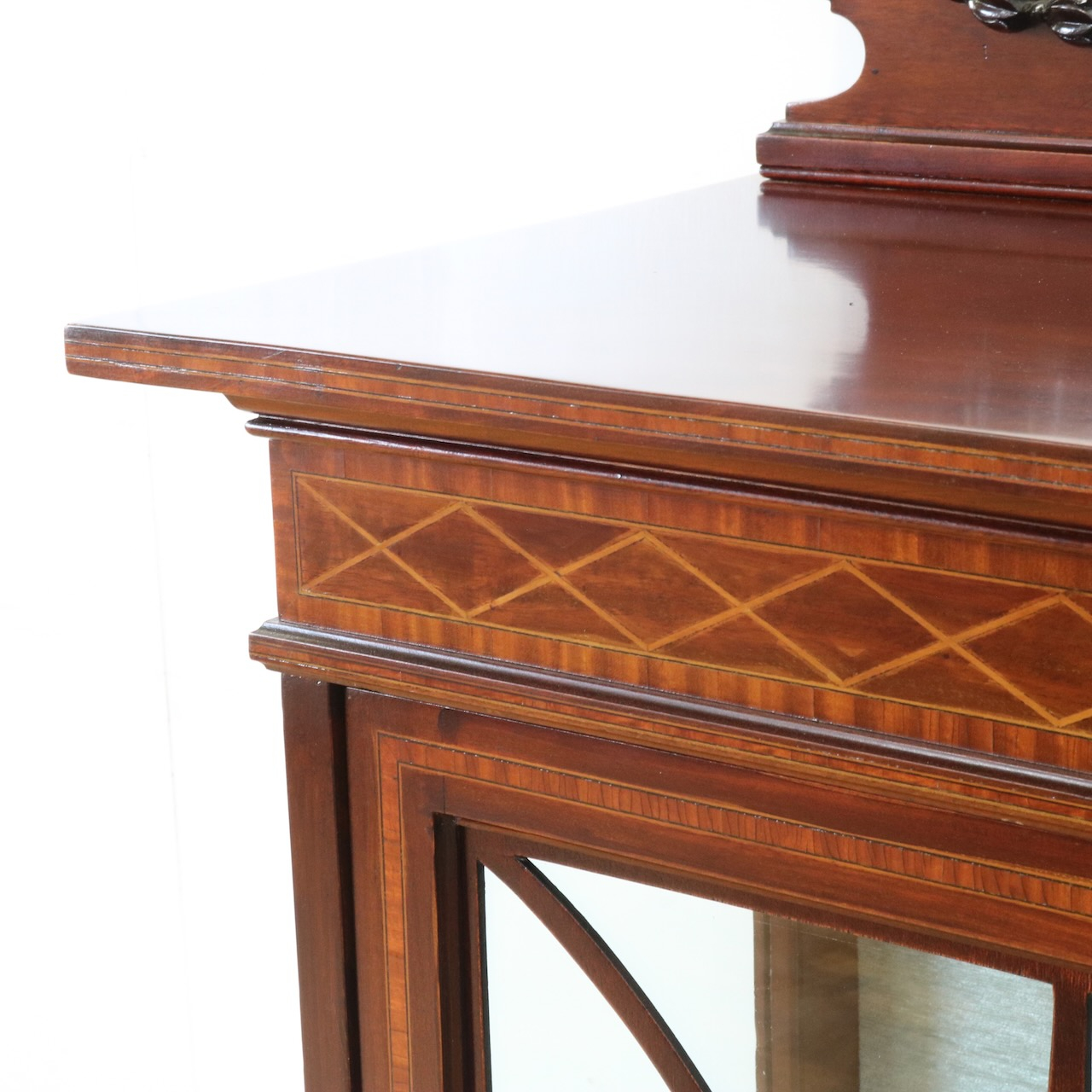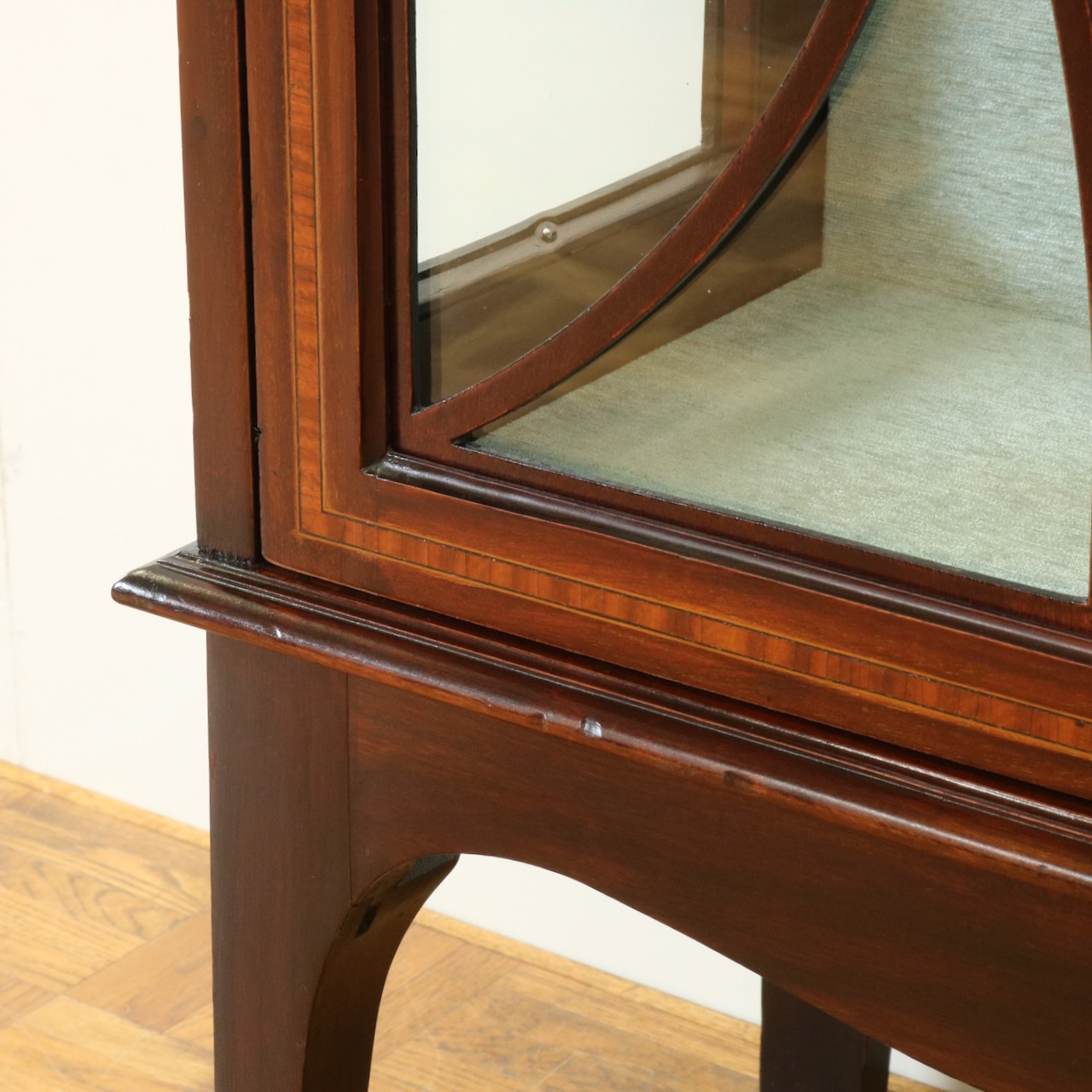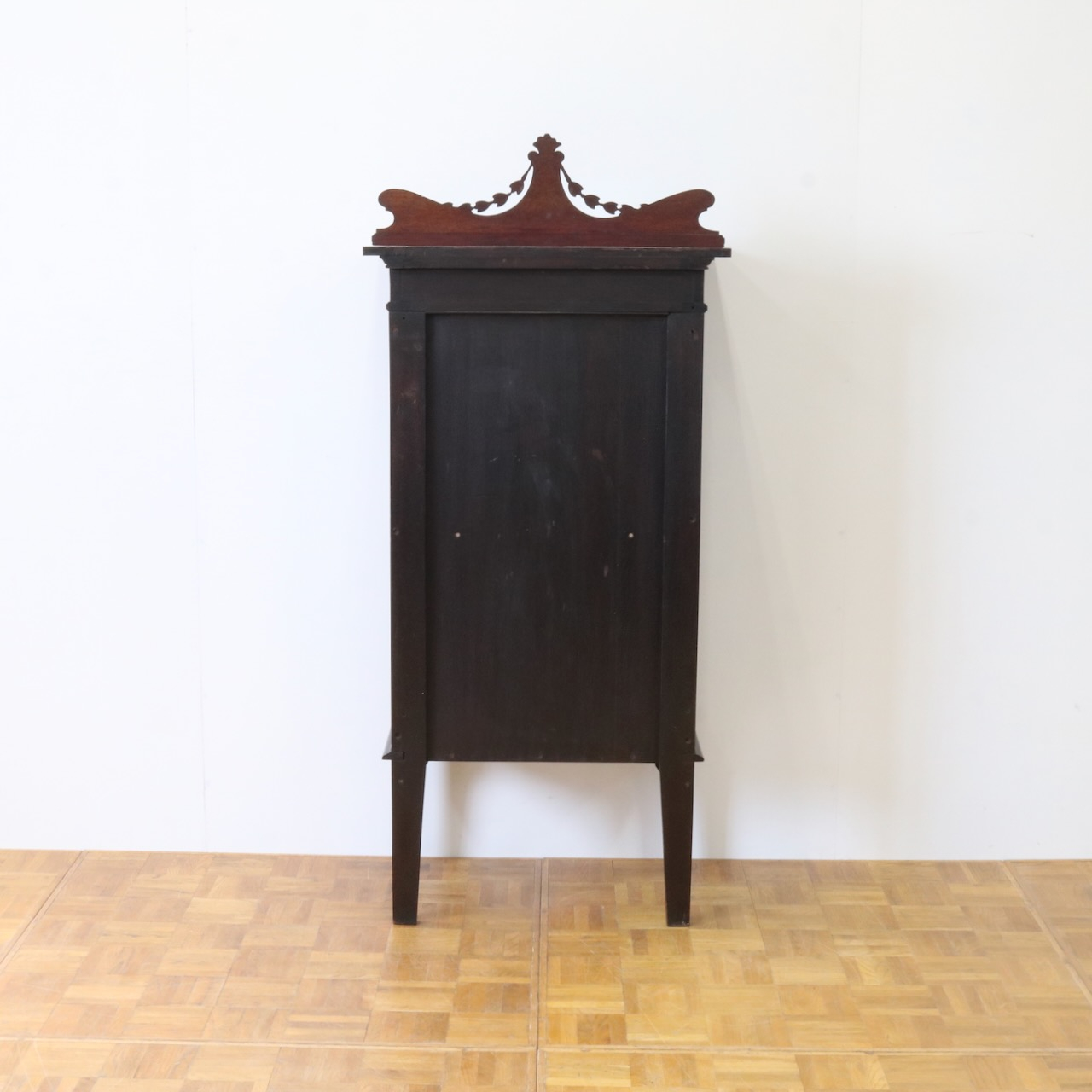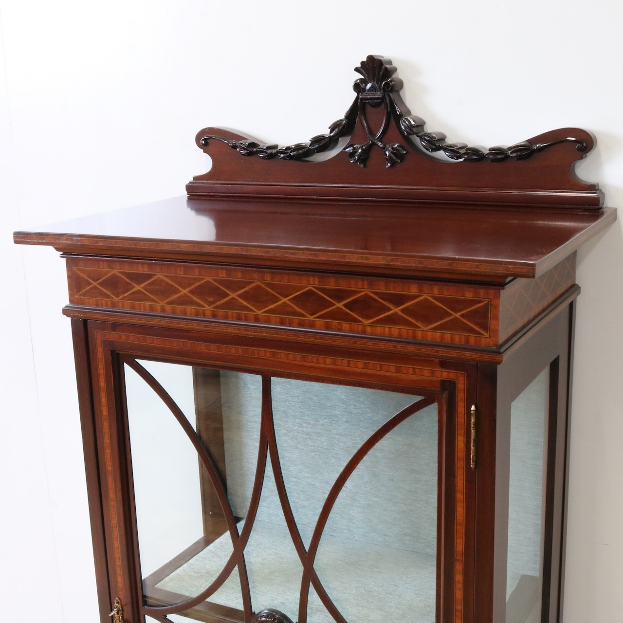 配送料の目安 ▶︎1920年代、マホガニー材のグラスキャビネット。繊細で直線的なフォルムに、ハスク飾りのついたトップがクラシカルなアクセントになっています。ガラス扉の中央にはグリーン地のジャスパーのメダルがはめ込まれています。